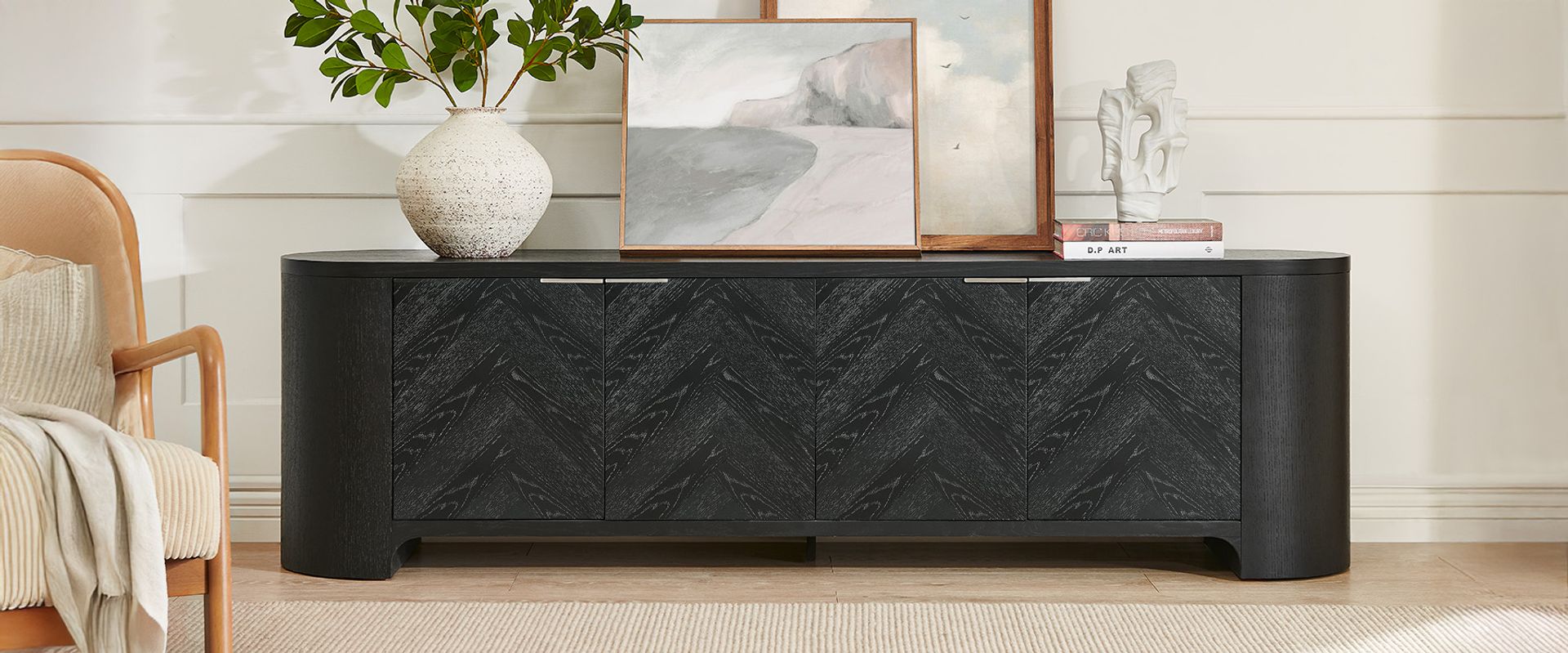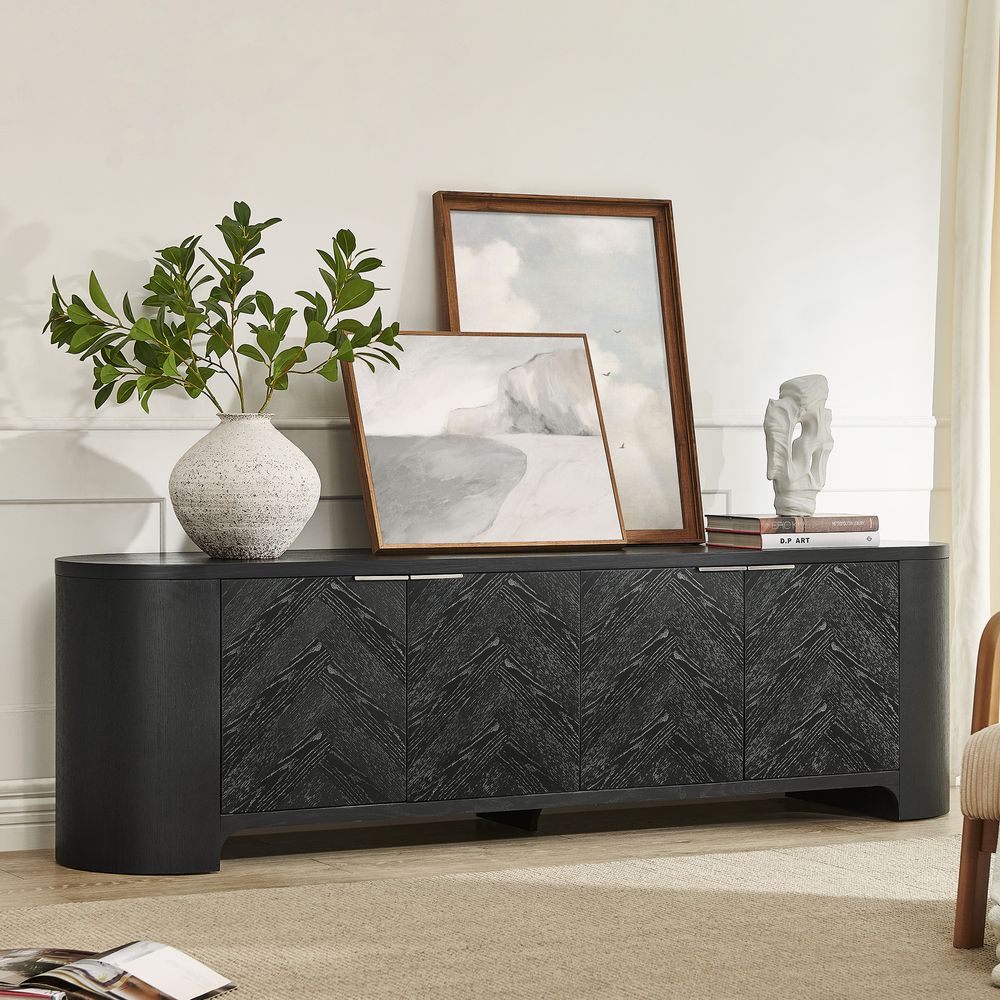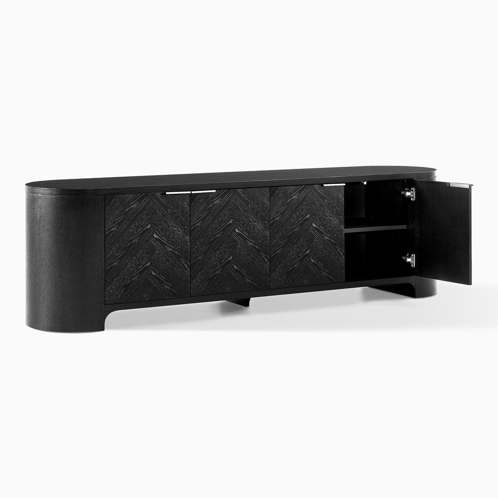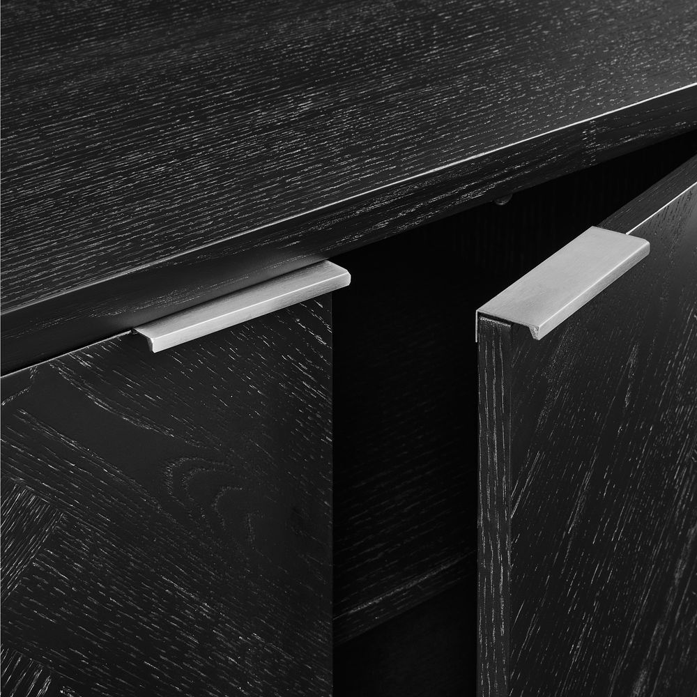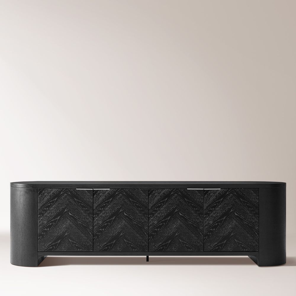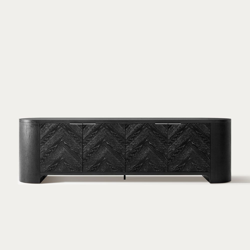 Inspired by the beauty of chevron and herringbone patterns, the Fiske collection features furniture with textured wood and intricate designs that merge functionality with artistic flair, offering spacious storage and a striking visual appeal.