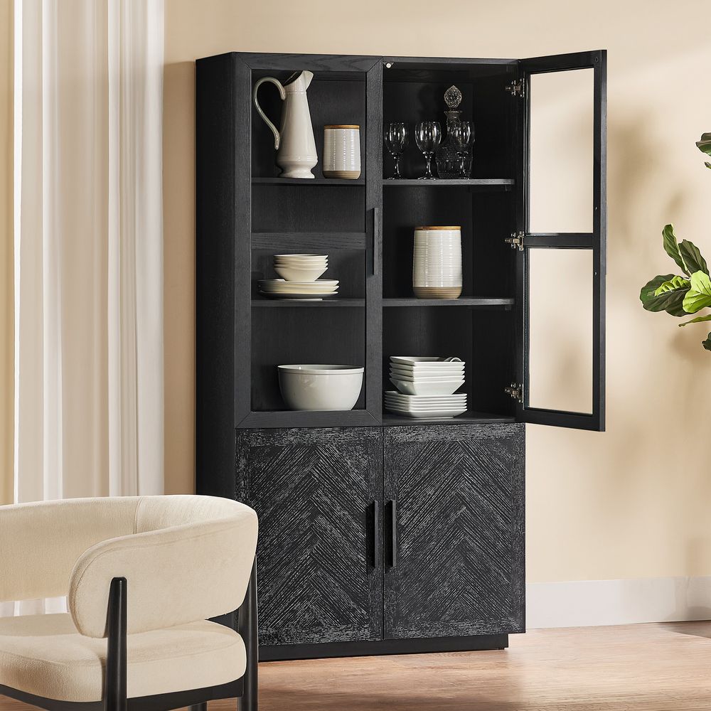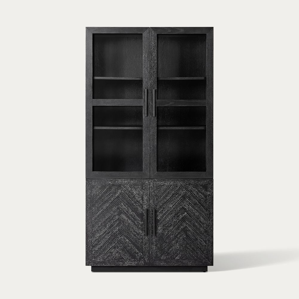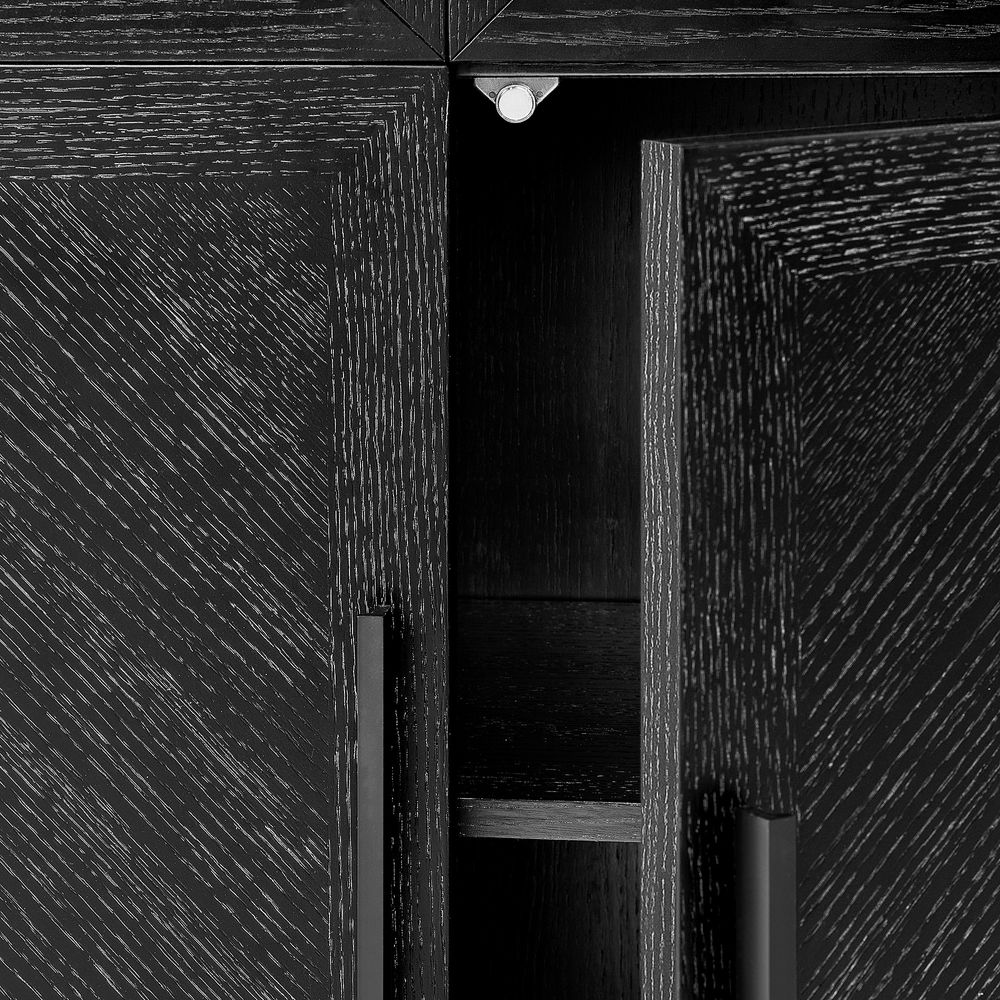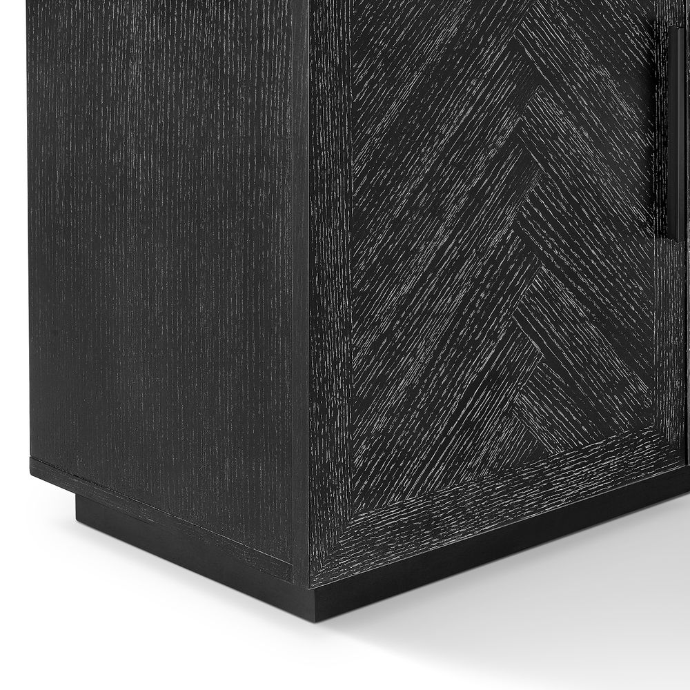 Inspired by the beauty of chevron and herringbone patterns, the Fiske collection features furniture with textured wood and intricate designs that merge functionality with artistic flair, offering spacious storage and a striking visual appeal.