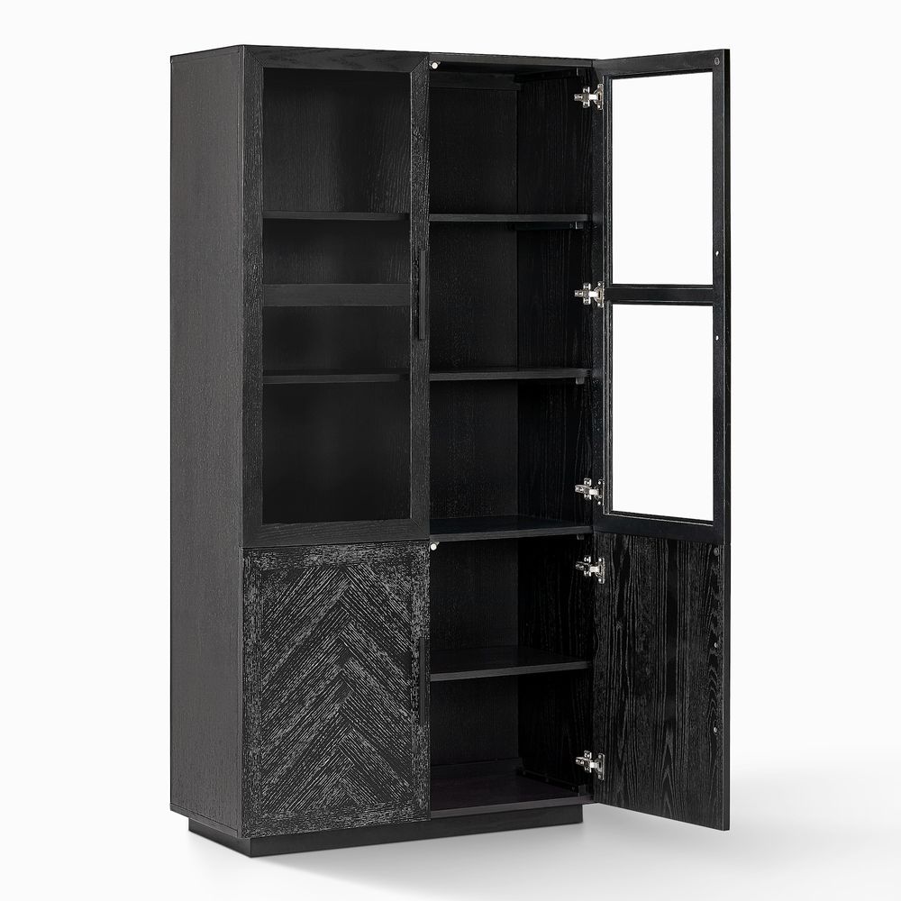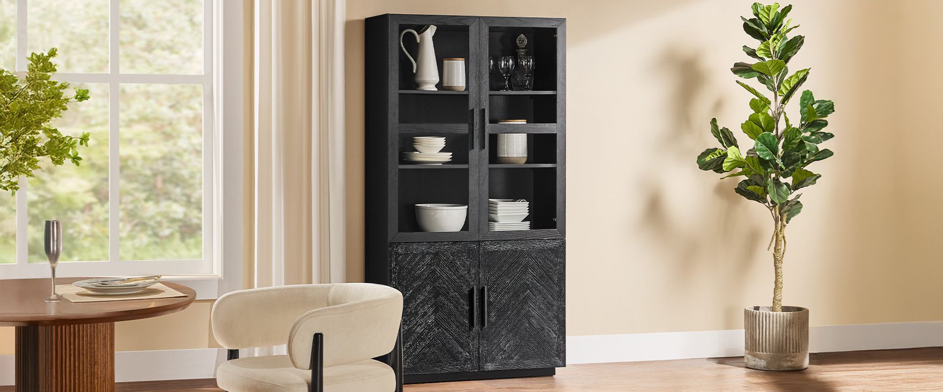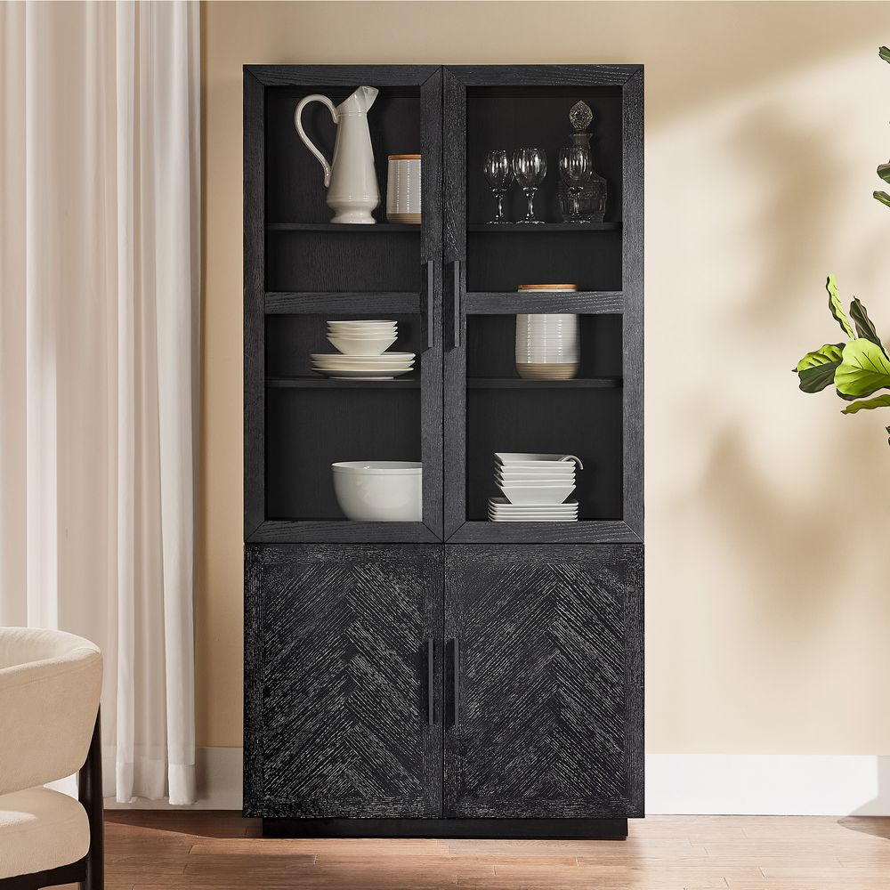 Inspired by the beauty of chevron and herringbone patterns, the Fiske collection features furniture with textured wood and intricate designs that merge functionality with artistic flair, offering spacious storage and a striking visual appeal.