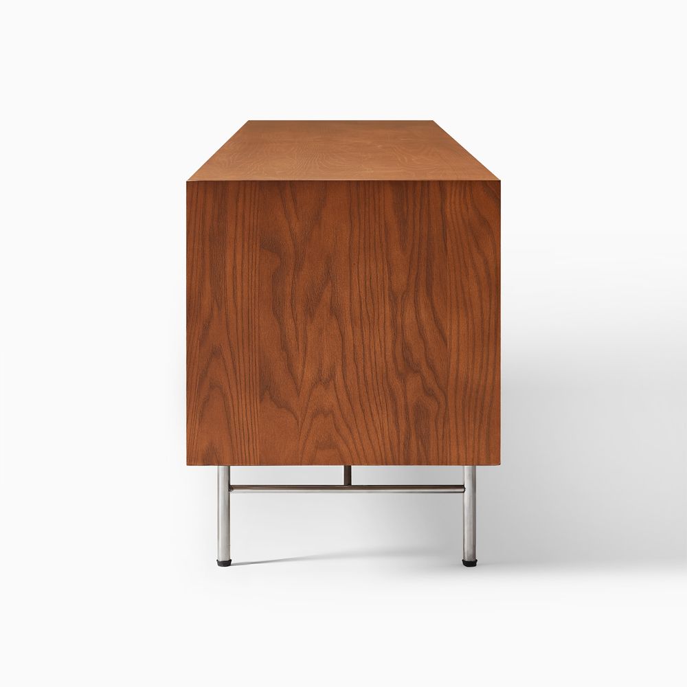 Crafted of solid wood and plywood with American ash wood veneers.All wood is kiln-dried for added durability.Drawers are crafted with precision dovetail joints for superior sturdiness and weight-bearing strength.Sleek metal legs add a modern aesthetic and lighten the solid wood body.Designed for TVs up to 80", 5 cord cutouts in back panel for cable management.Color perception may vary due to wood characteristics, lighting, and devices. Wood grain variation is expected, as each is unique.