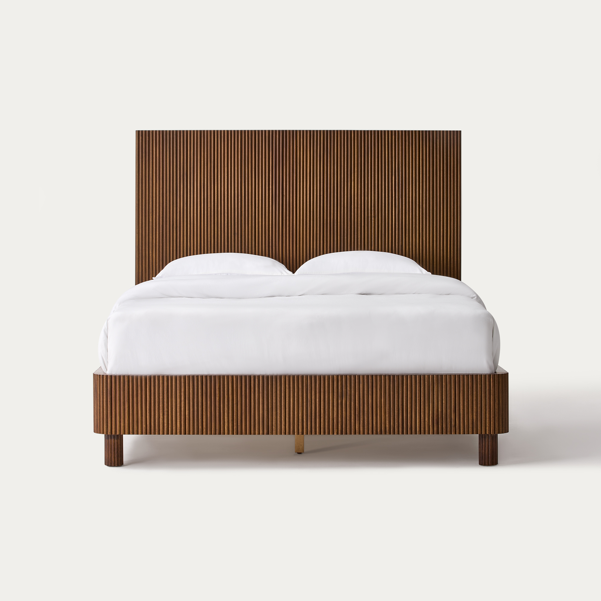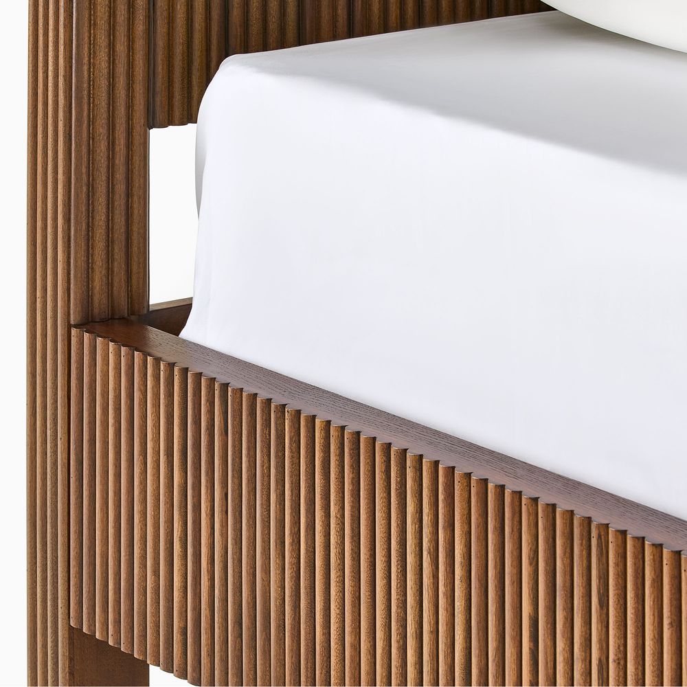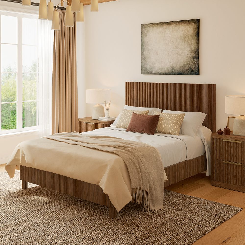 Fulton is defined by refined fluting, featuring a high-profile headboard with vertical reeding that serves as both a backdrop and the focal point of the bedroom. The reeding continues along the broad side rails, softened by rounded corners, while lifted, rounded legs echo the design language and introduce a sense of lightness and breathing room to the overall form.