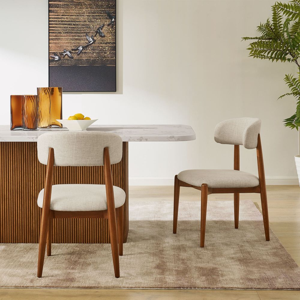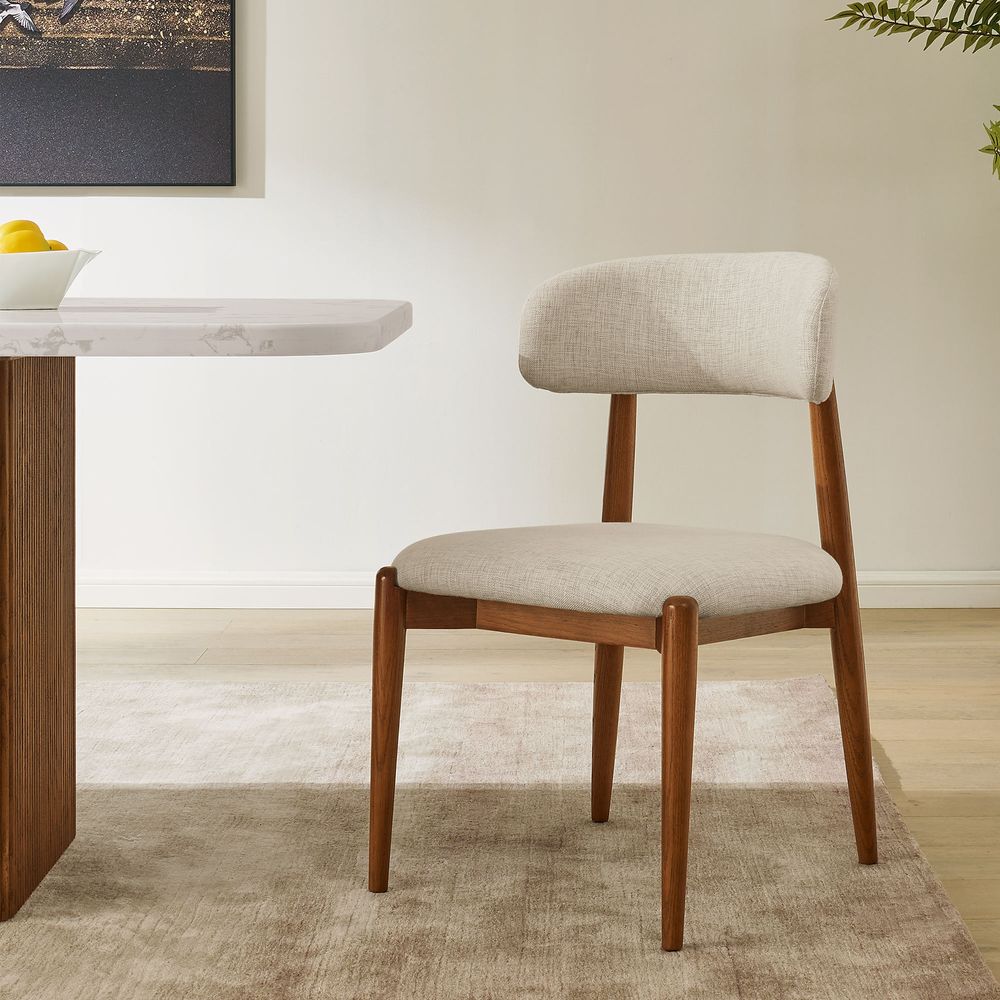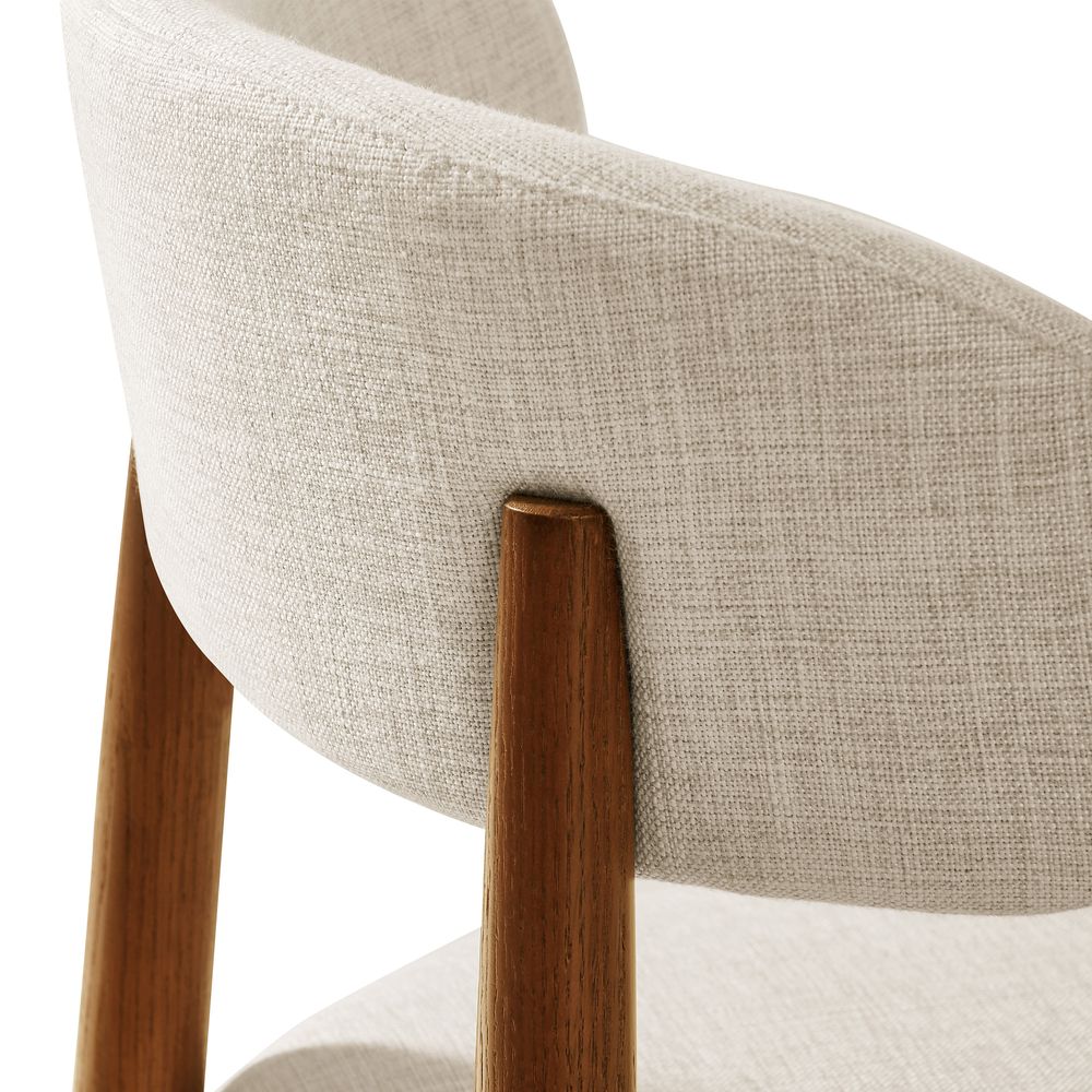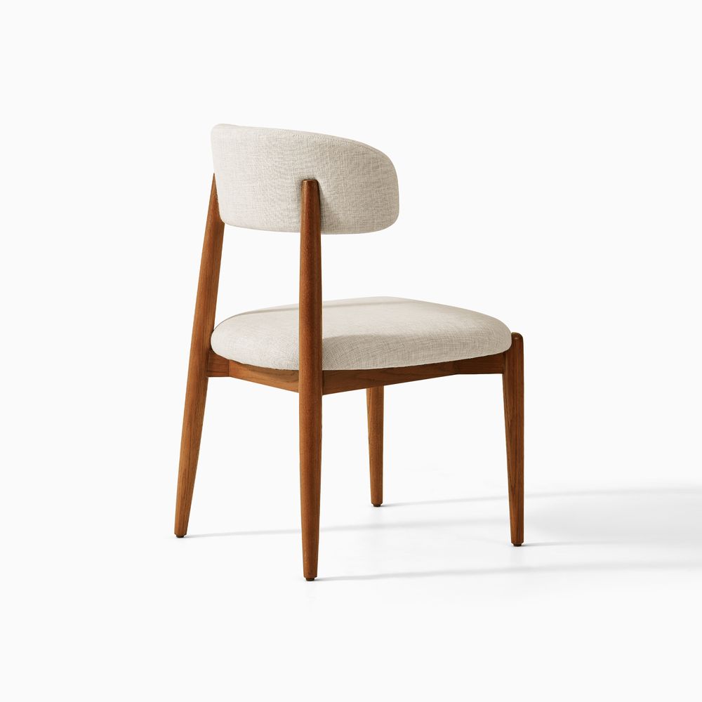 Greta is filled with mid-century modern charm, defined by slender, tapered solid wood legs that create a poised, elegant stance. The gently arched backrest wraps just enough to offer support without visual weight, while the softly padded seat cushion adds comfort and balance. The result is a silhouette that feels both graceful and grounded. With its clean lines and quiet warmth, Greta fits effortlessly into Danish, Scandinavian, organic modern, and other minimal-leaning interiors.