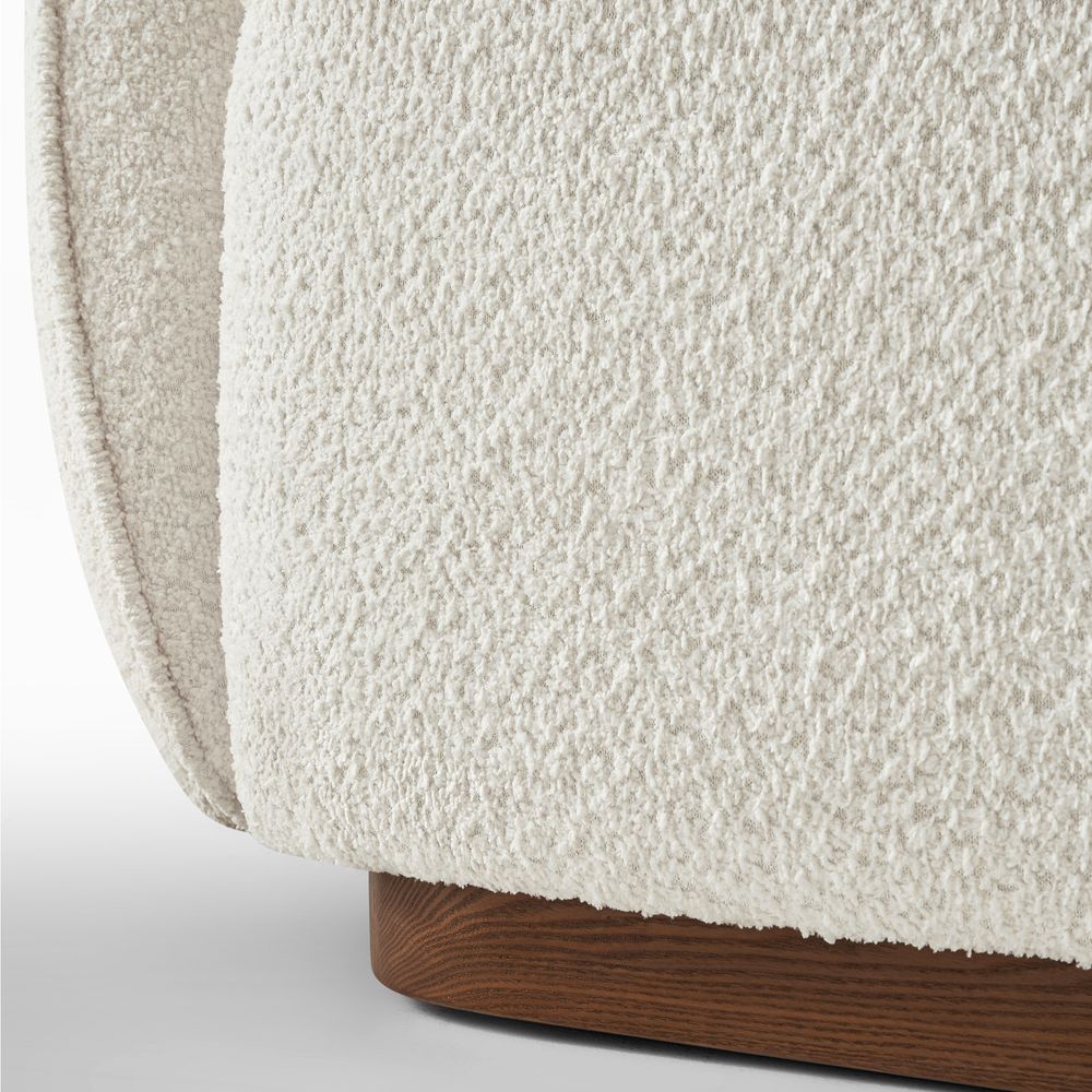 Gronnur sofa enveloping silhouette and rounded edges create a sense of inviting intimacy, making it a perfect conversation starter to float in the center of a living space. The design rests on a warm, contrasting wood plinth, elevating the piece and providing a sophisticated, grounded finish.