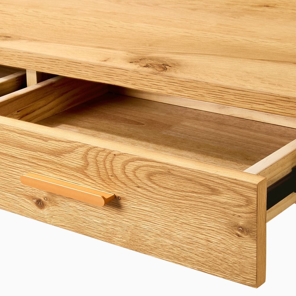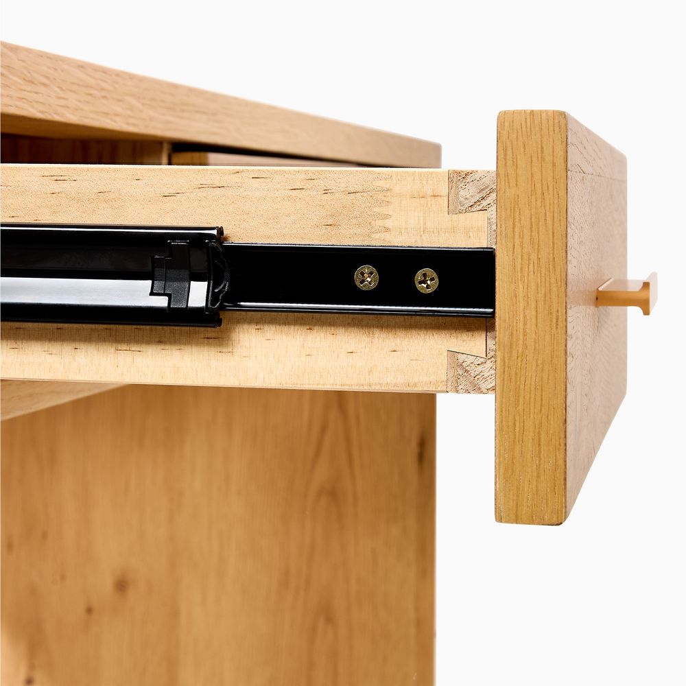 Crafted of solid wood and plywood with American oak veneers.All wood is kiln-dried for added durability.Finish is achieved through multistep process in which wood is wire brushed to highlight its rich grain.Wood glazing adds visual interest with greater depth and layering and enhances coloring.Drawers are crafted with precision dovetail joints for superior sturdiness and weight-bearing strength.Solid wood blocks are used at structural joints for reinforcement.Color perception may vary due to wood characteristics, lighting, and devices. Wood grain variation is expected, as each is unique.