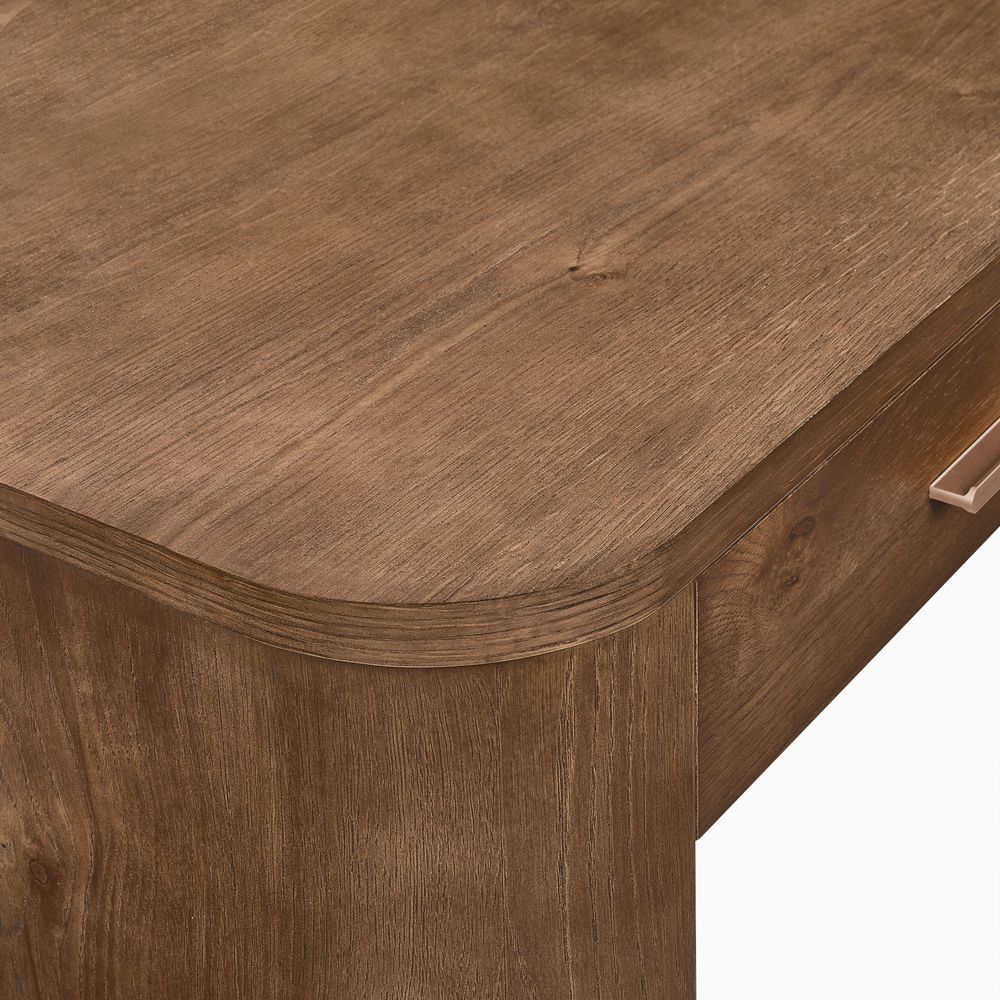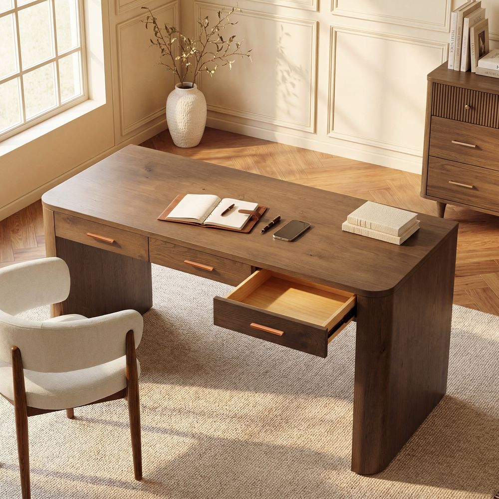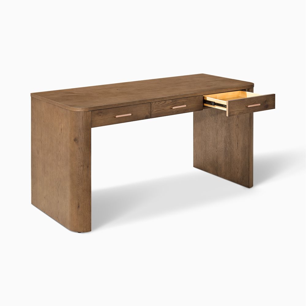 Himmel desk offers a refined statement for any entryway or living space. Its gracefully rounded corners and seamless waterfall design highlight the exquisite natural grain of the wood, creating a sense of understated luxury.