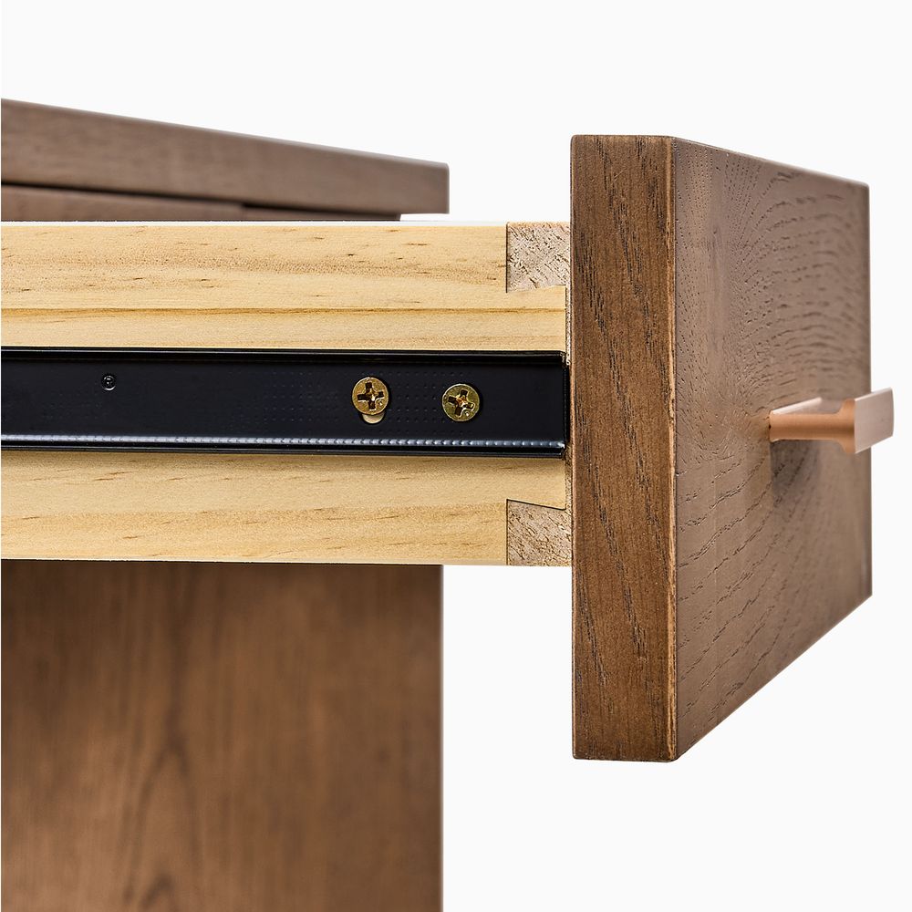 Crafted of solid wood and plywood with American oak veneers.All wood is kiln-dried for added durability.Finish is achieved through multistep process in which wood is wire brushed to highlight its rich grain.Wood glazing adds visual interest with greater depth and layering and enhances coloring.Drawers are crafted with precision dovetail joints for superior sturdiness and weight-bearing strength.Solid wood blocks are used at structural joints for reinforcement.Color perception may vary due to wood characteristics, lighting, and devices. Wood grain variation is expected, as each is unique.