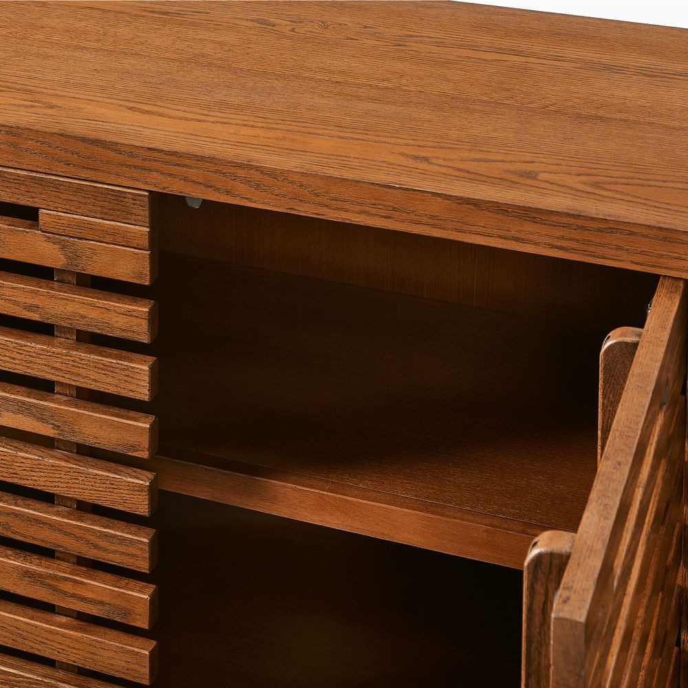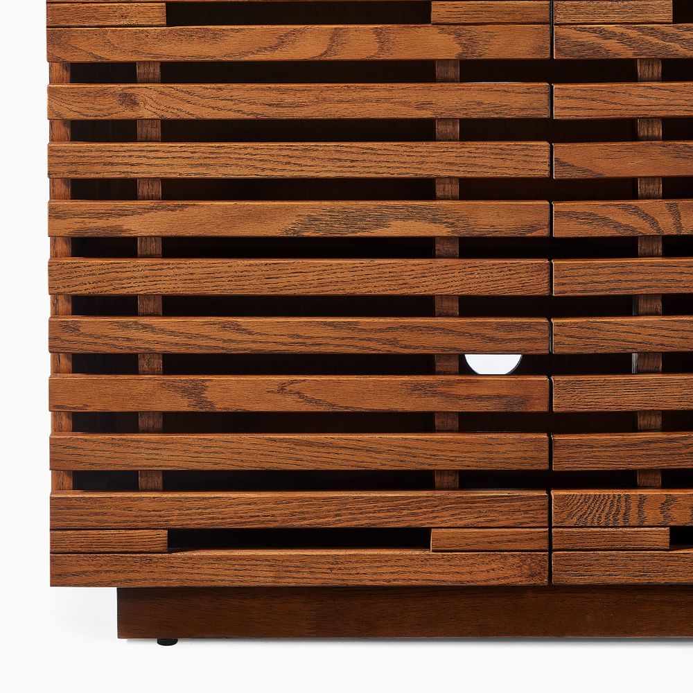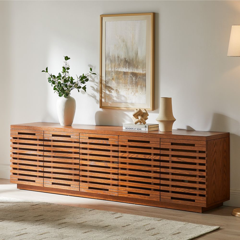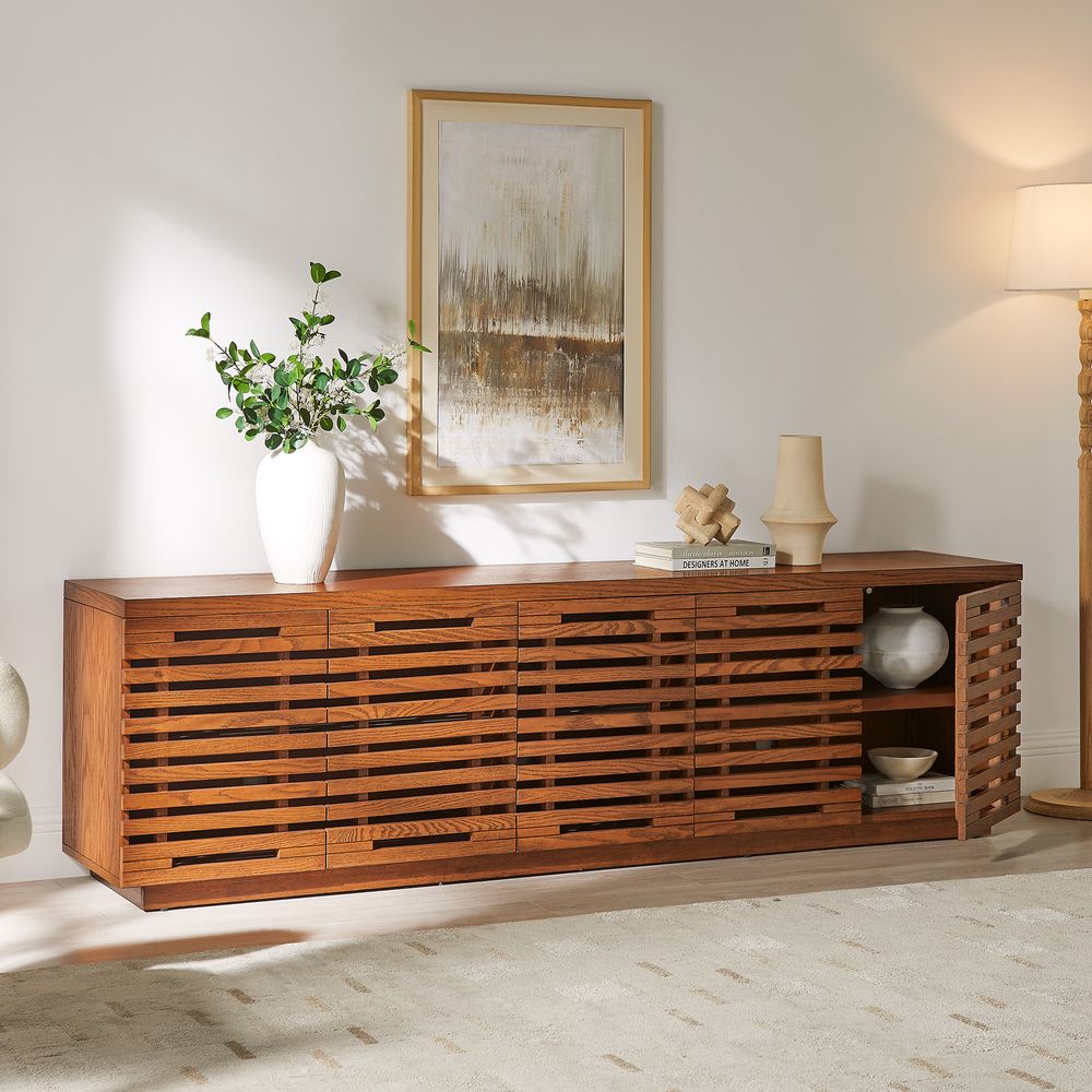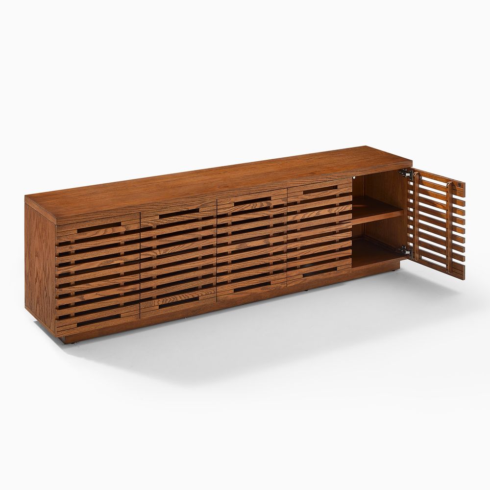 Crafted of American solid oak and engineered wood with oak veneers.All wood is kiln-dried for added durability.Finish is achieved through multistep process in which wood is wire brushed to highlight its rich grain.Solid wood blocks are used at structural joints for reinforcement.Slatted doors create alluring pattern and chic texture.Designed for TVs up to 85", 6 cord cutouts in back panel for cable management.Color perception may vary due to wood characteristics, lighting, and devices. Wood grain variation is expected, as each is unique.