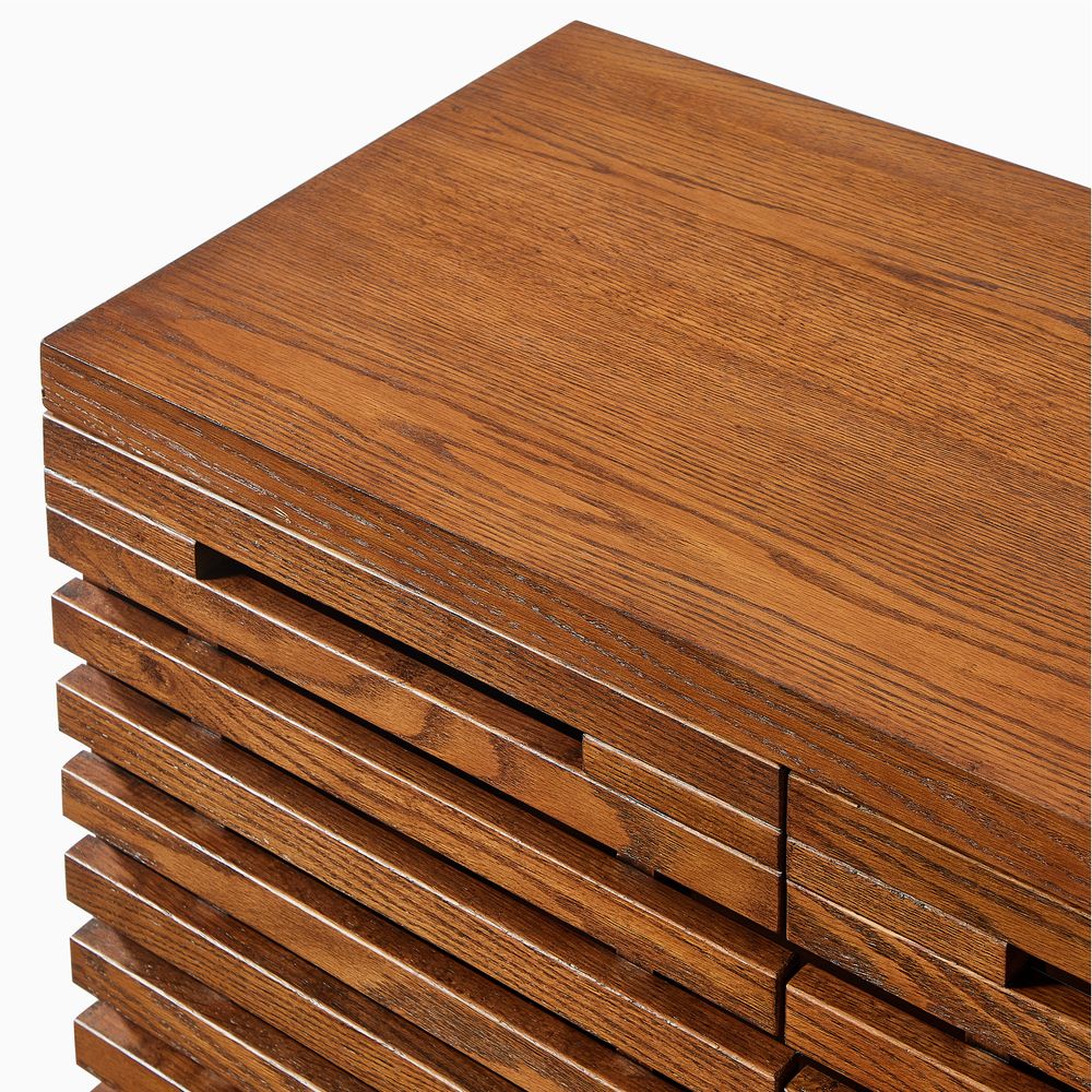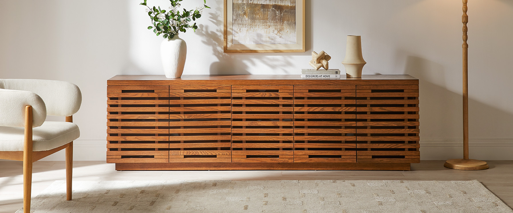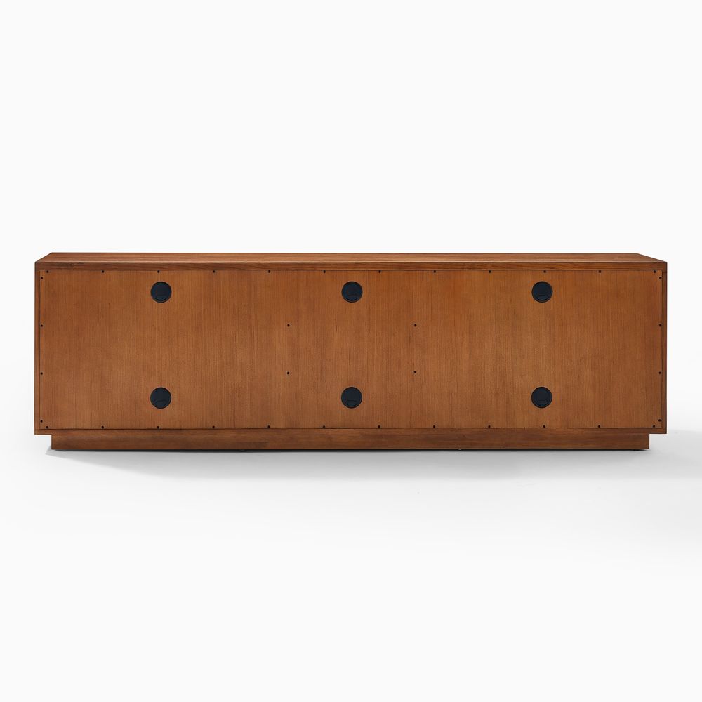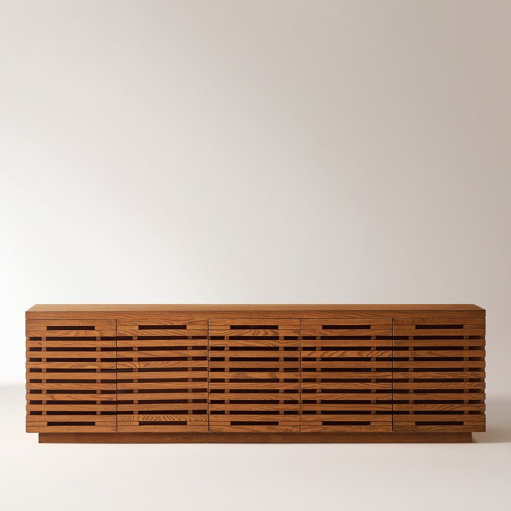 Crafted of American solid oak and engineered wood with oak veneers.All wood is kiln-dried for added durability.Finish is achieved through multistep process in which wood is wire brushed to highlight its rich grain.Solid wood blocks are used at structural joints for reinforcement.Slatted doors create alluring pattern and chic texture.Designed for TVs up to 85", 6 cord cutouts in back panel for cable management.Color perception may vary due to wood characteristics, lighting, and devices. Wood grain variation is expected, as each is unique.