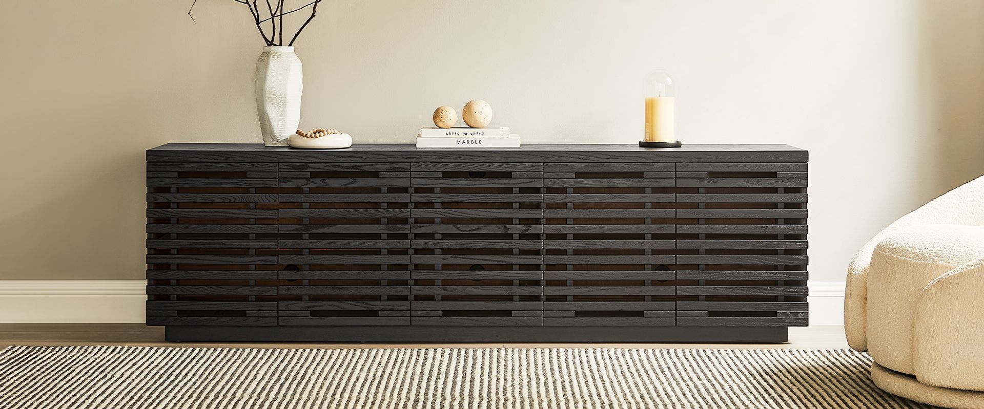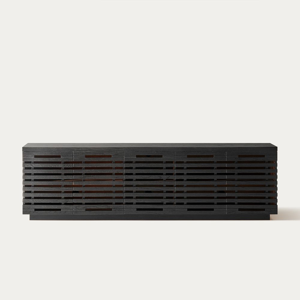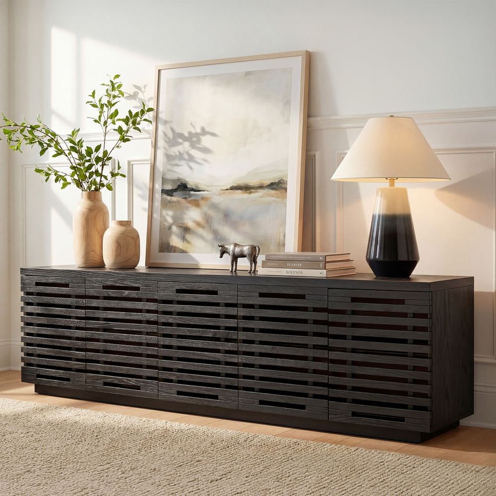 Crafted of American solid oak and engineered wood with oak veneers.All wood is kiln-dried for added durability.Finish is achieved through multistep process in which wood is wire brushed to highlight its rich grain.Solid wood blocks are used at structural joints for reinforcement.Slatted doors create alluring pattern and chic texture.Designed for TVs up to 85", 6 cord cutouts in back panel for cable management.Color perception may vary due to wood characteristics, lighting, and devices. Wood grain variation is expected, as each is unique.