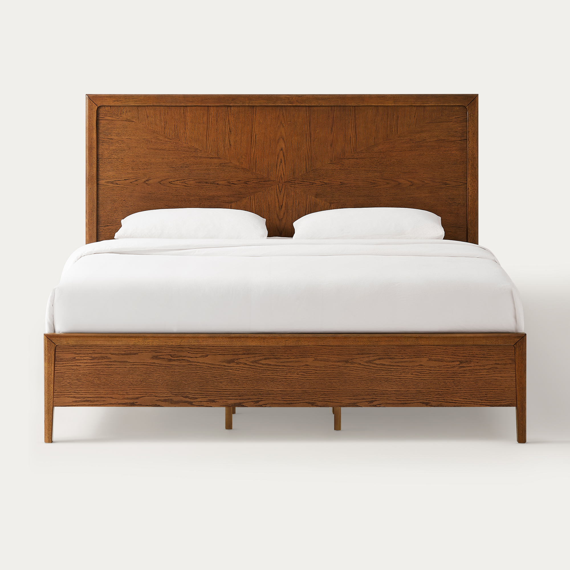 Crafted of rubber wood and engineered wood with American oak veneers.All wood is kiln-dried for added durability.Finish is achieved through multistep process in which wood is wire brushed to highlight its rich grain.Wood glazing adds visual interest with greater depth and layering and enhances coloring.Include 10 middle support legs.Bed accommodates most standard mattresses, box spring required, supporting up to 800 lbs.Color perception may vary due to wood characteristics, lighting, and devices. Wood grain variation is expected, as each is unique.