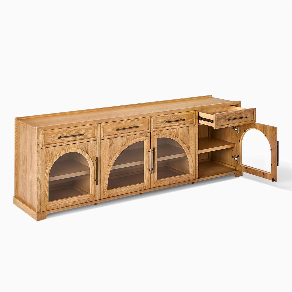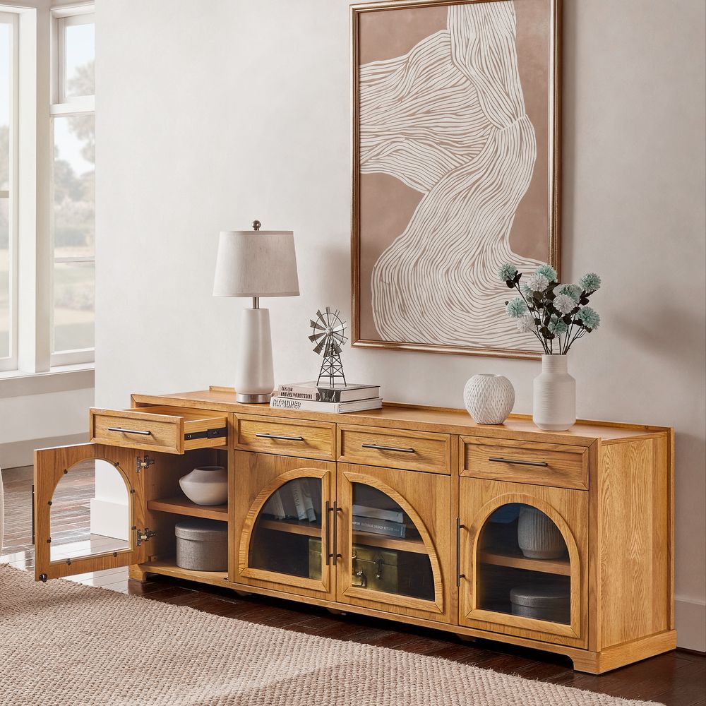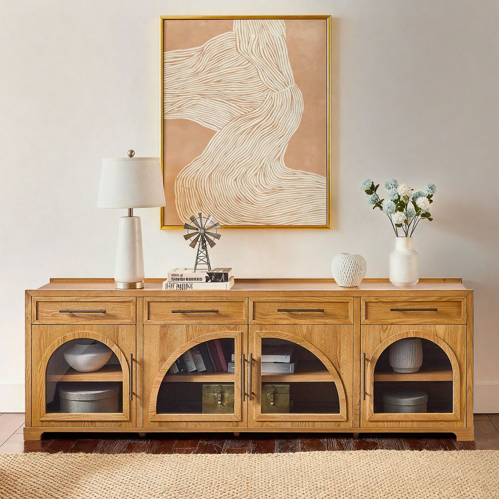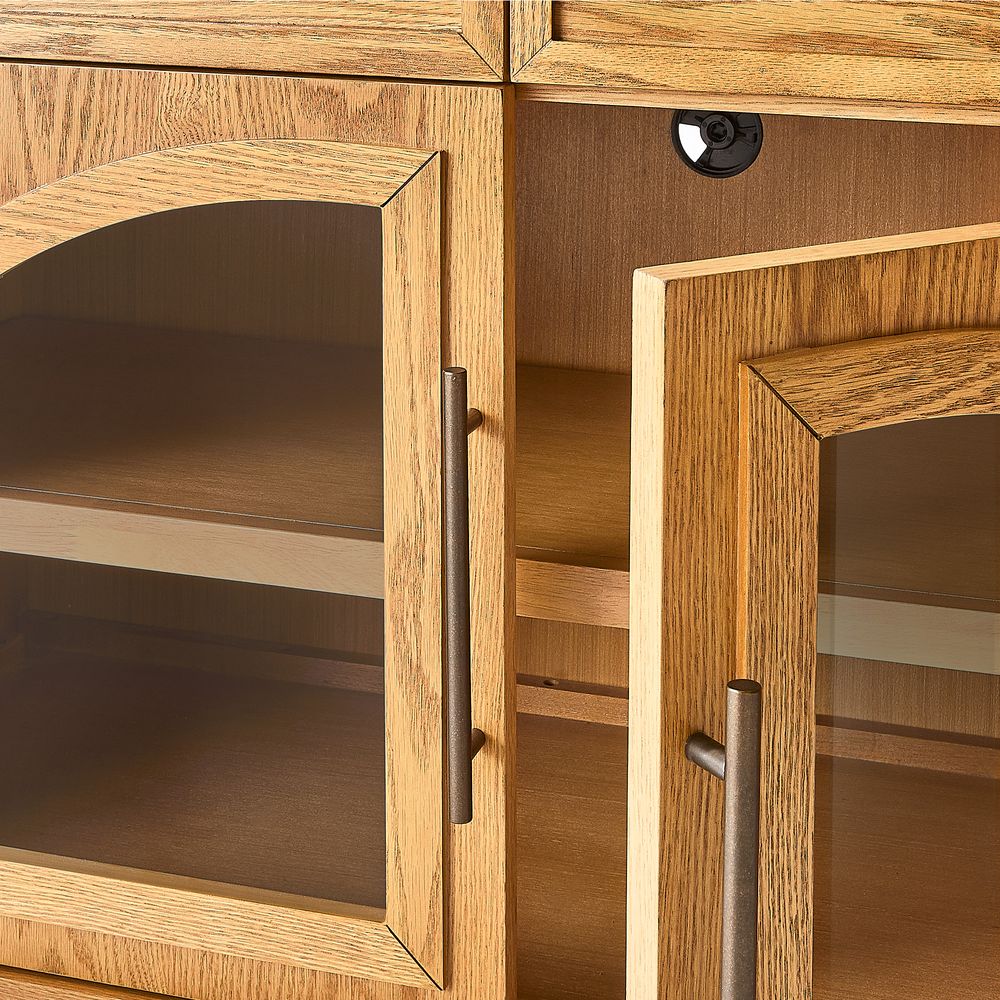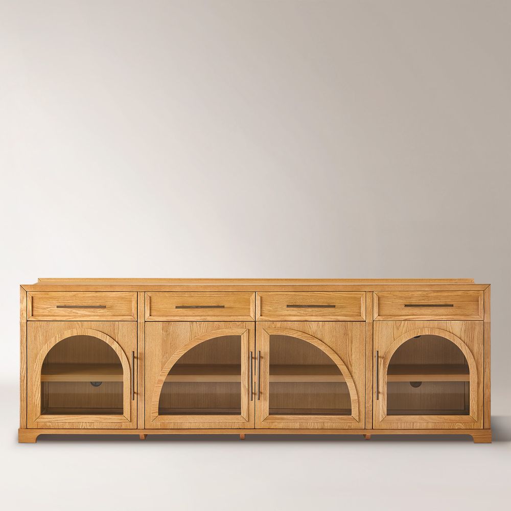 Jardine media console blends design with practical storage. Featuring arched glass doors, a sleek oak finish and warm wood interiors, it offers four drawers and adjustable shelves for organizing media and electronics.