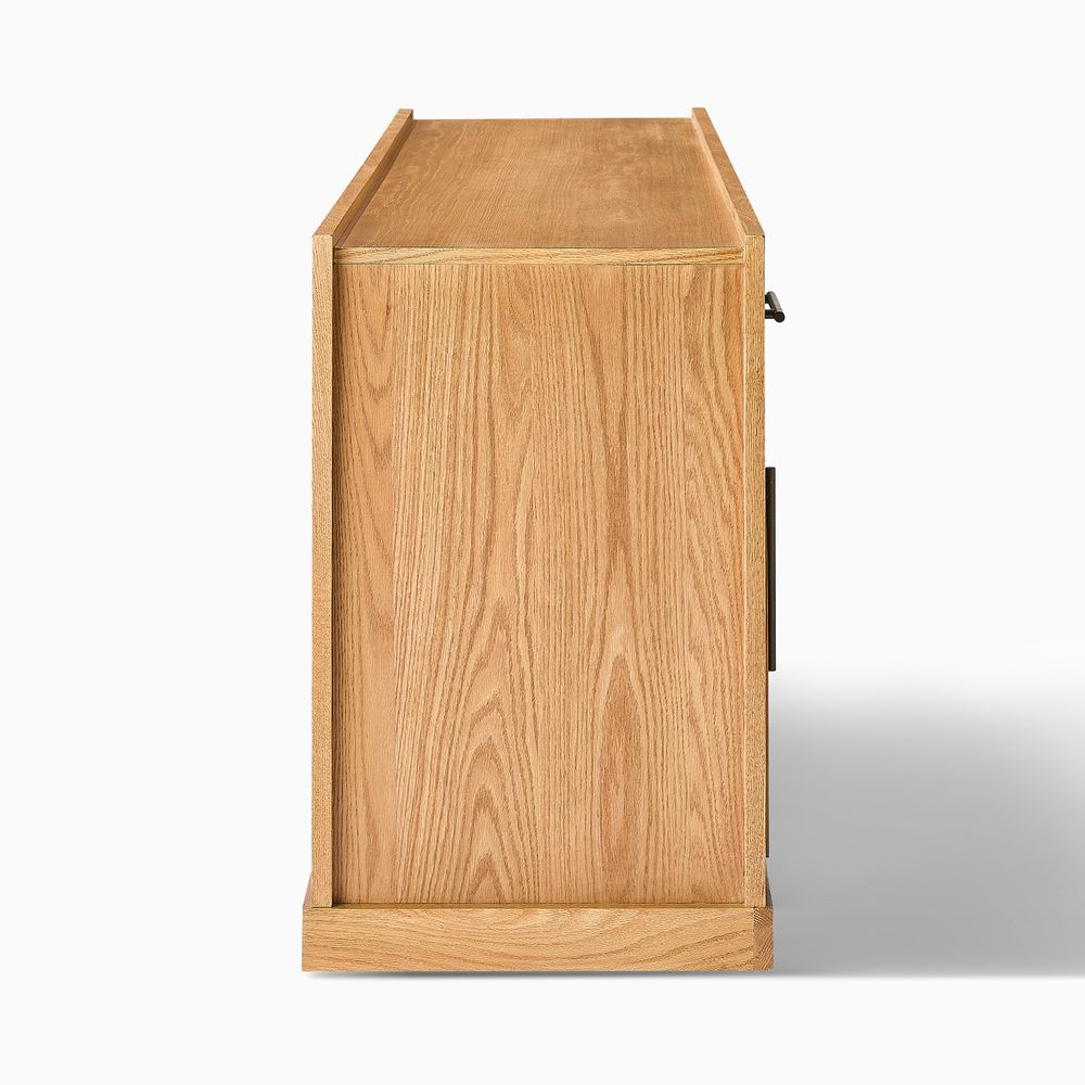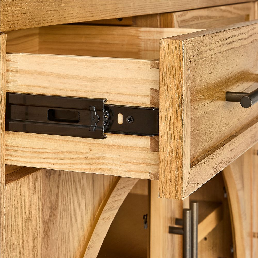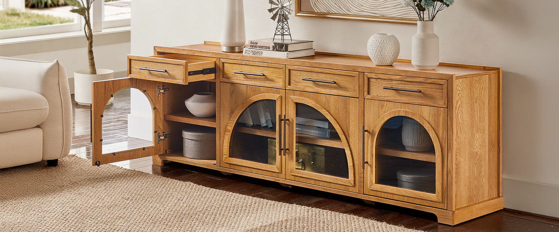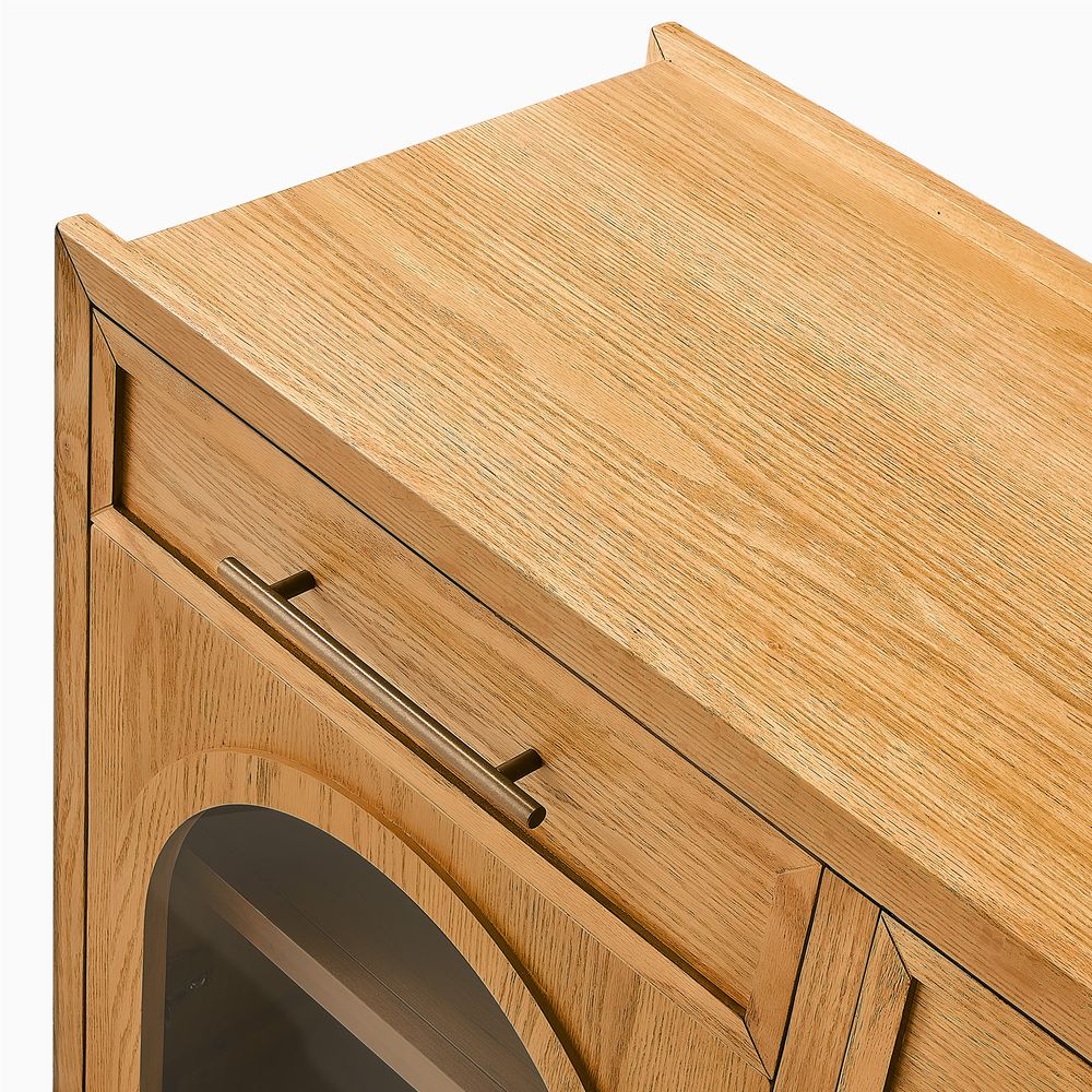 Jardine media console blends design with practical storage. Featuring arched glass doors, a sleek oak finish and warm wood interiors, it offers four drawers and adjustable shelves for organizing media and electronics.