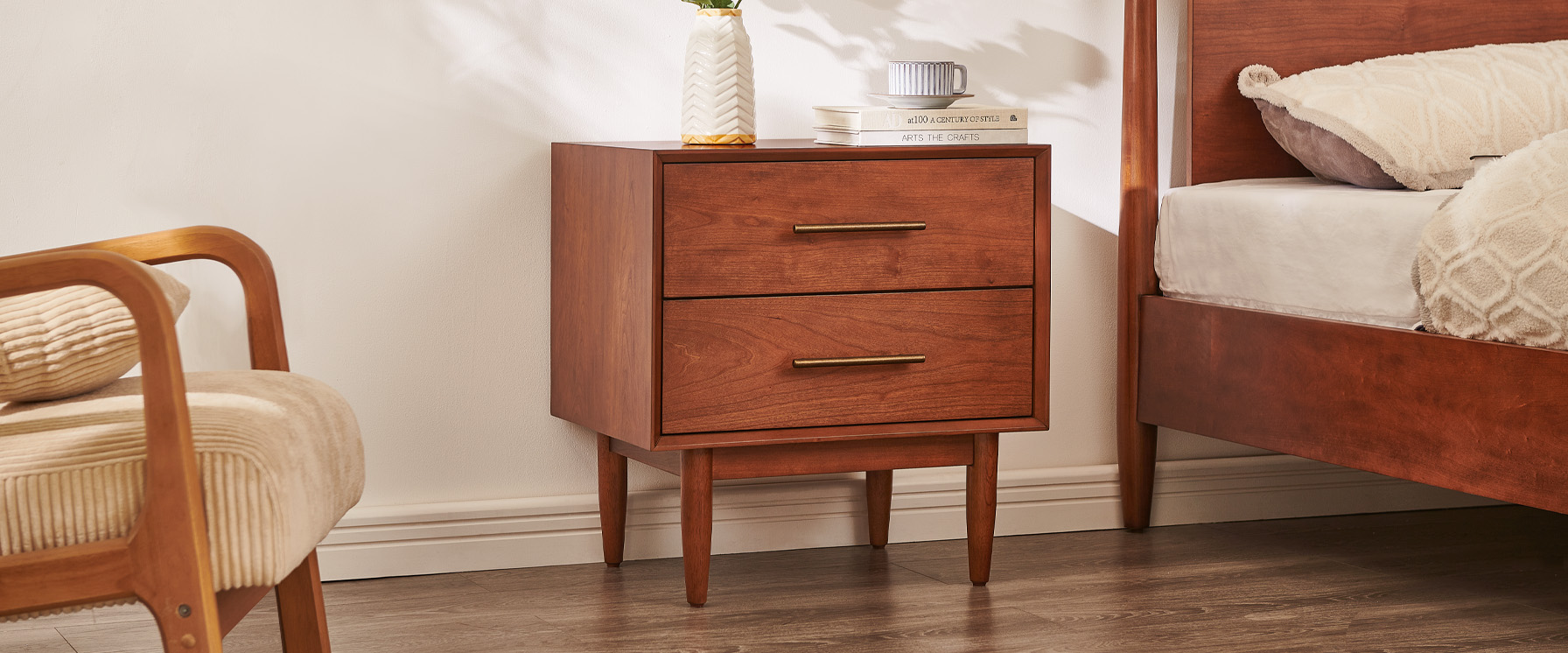 A mid-century accent featuring clean lines, classy tapered wood legs, and a warm, nostalgic tone that blends effortlessly across time and styles.