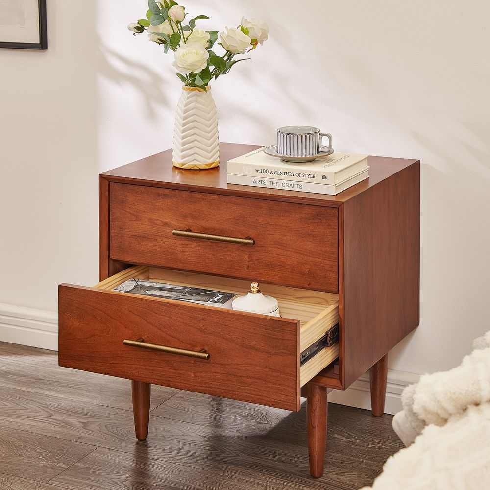 With beveled front edges and antique bronze hardware, these refined details allow this nightstand to serve as a moderate yet polished addition to a retro-inspired space.