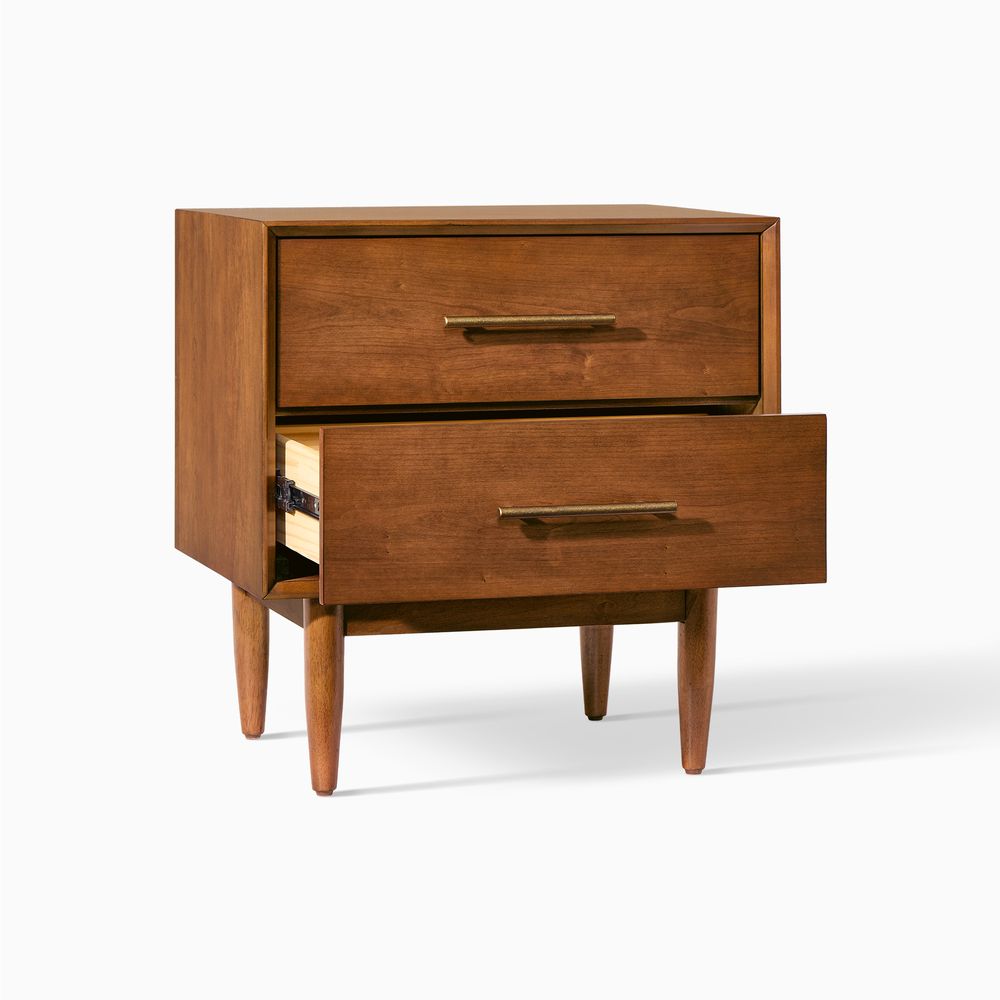 With beveled front edges and antique bronze hardware, these refined details allow this nightstand to serve as a moderate yet polished addition to a retro-inspired space.