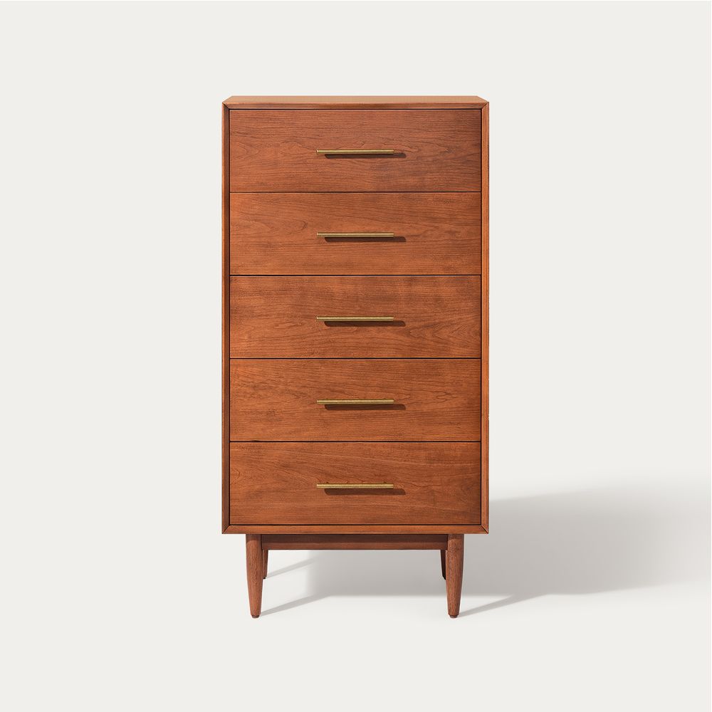 Crafted of solid wood and engineered wood with cherry veneers.All wood is kiln-dried for added durability.Fiish is achieved through multistep process in which wood is wire brushed to highlight its rich grain.Wood glazing adds visual interest with greater depth and layering and enhances coloring.Drawers are crafted with precision dovetail joints for superior sturdiness and weight-bearing strength.Solid wood blocks are used at structural joints for reinforcement.Color perception may vary due to wood characteristics, lighting, and devices. Wood grain variation is expected, as each is unique.Anti-tip kit hardware (included) is highly recommended to provide protection against tipping of furniture.