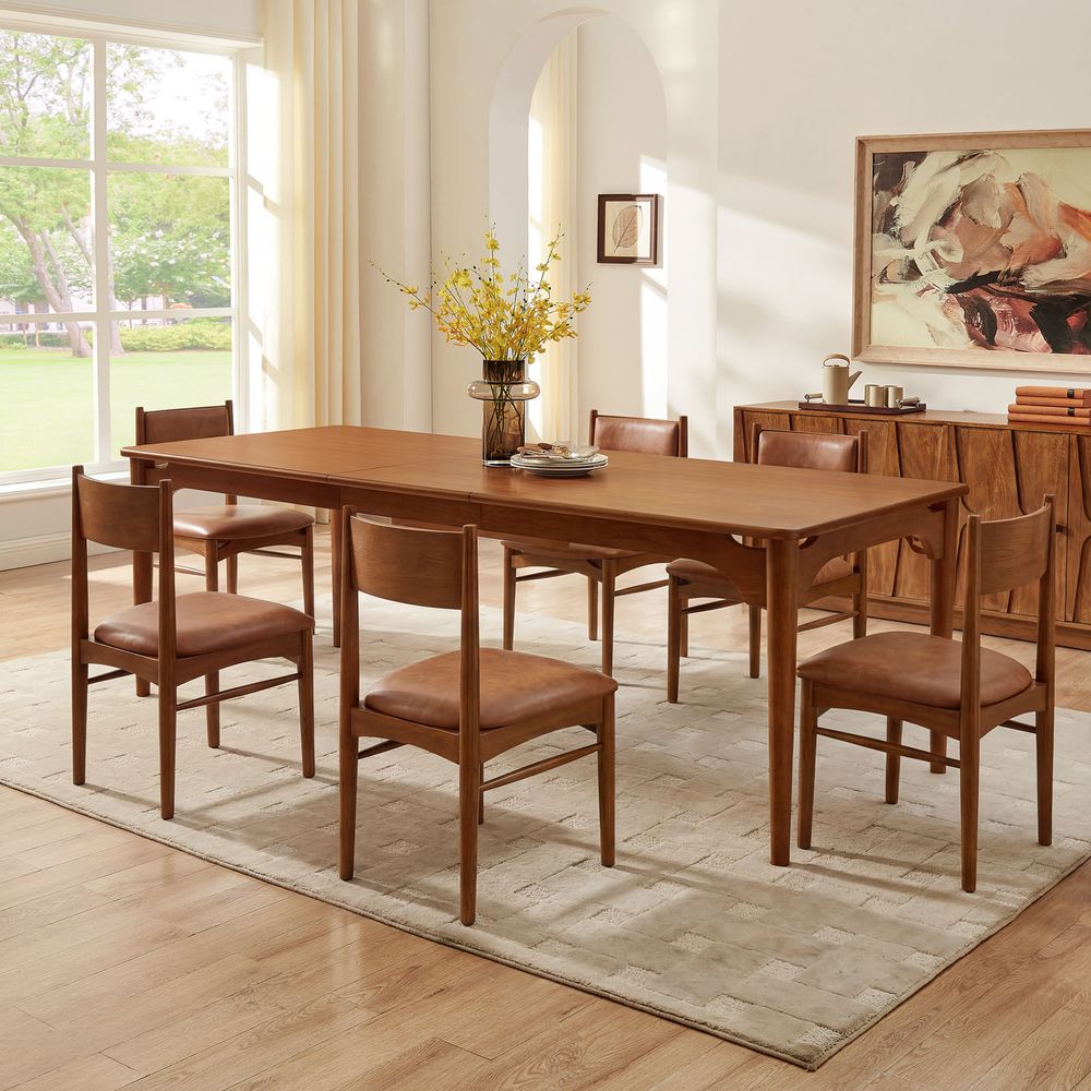 Set consists of 1 Kaden 72"-92" extendable dining table and 6 Kaden dining chairs.Dining table crafted of solid wood and engineered wood with cherry veneers.Dining chair frame crafted of American solid oak wood and plywood.PU Leather with distinct textural pattern and a soft touch.All wood is kiln-dried for added durability.Wood glazing adds visual interest with greater depth and layering and enhances coloring.The upholstery on the chair provides soft padding for a cozy and stylish seating surface.92" table comfortably seats 6-8.Chairs supporting up to 330 lbs.Color perception may vary due to wood characteristics, lighting, and devices. Wood grain variation is expected, as each is unique.Items purchased at different times may not match due to different dye lots, also color perception can vary by lighting and devices.