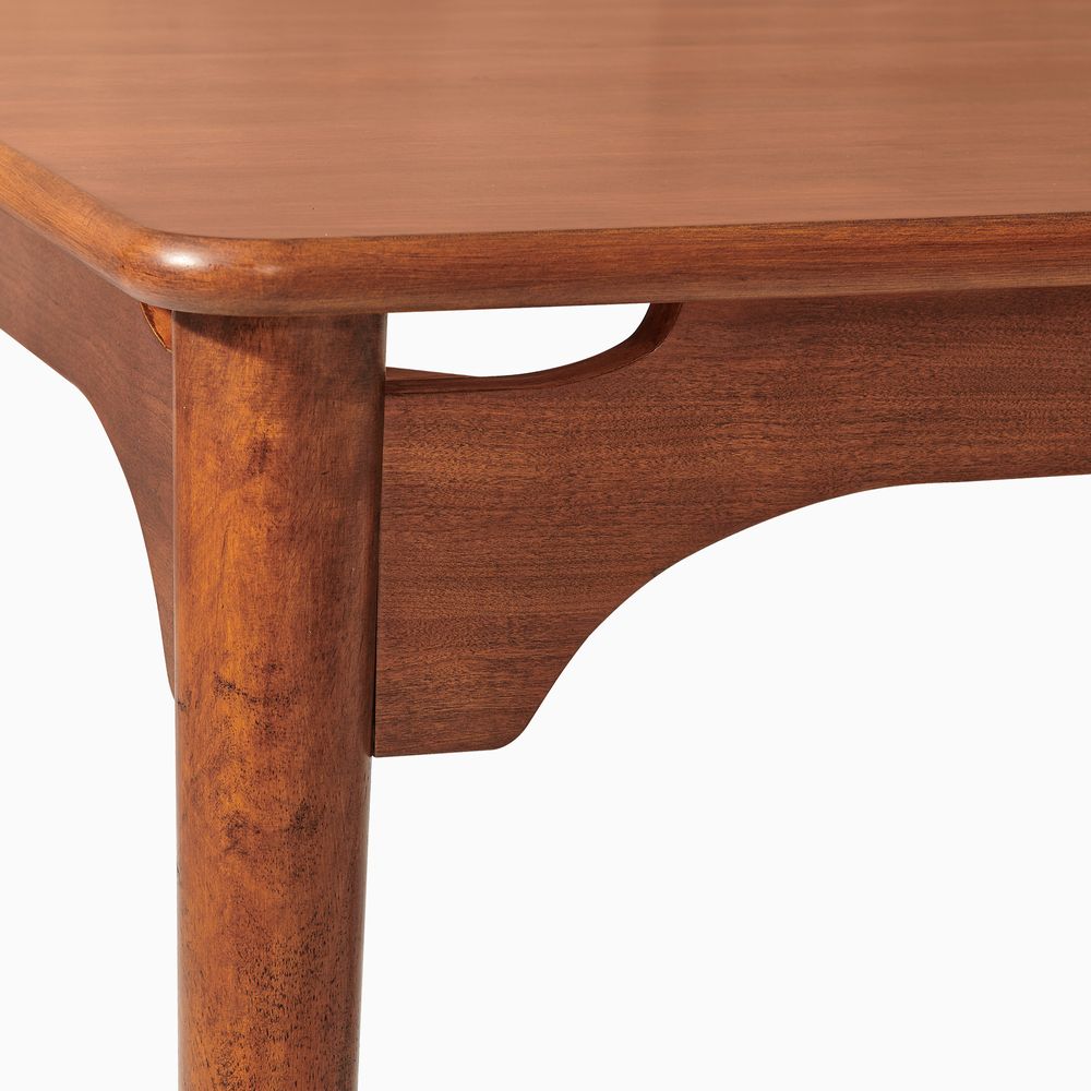 The curved, slim table apron, enhanced by a subtle hollow detail, creates a more tailored, lightweight profile. Two self-storing leaves preserve the table’s clean, minimalist look while delivering the practicality that sits at the heart of mid-century modern design.