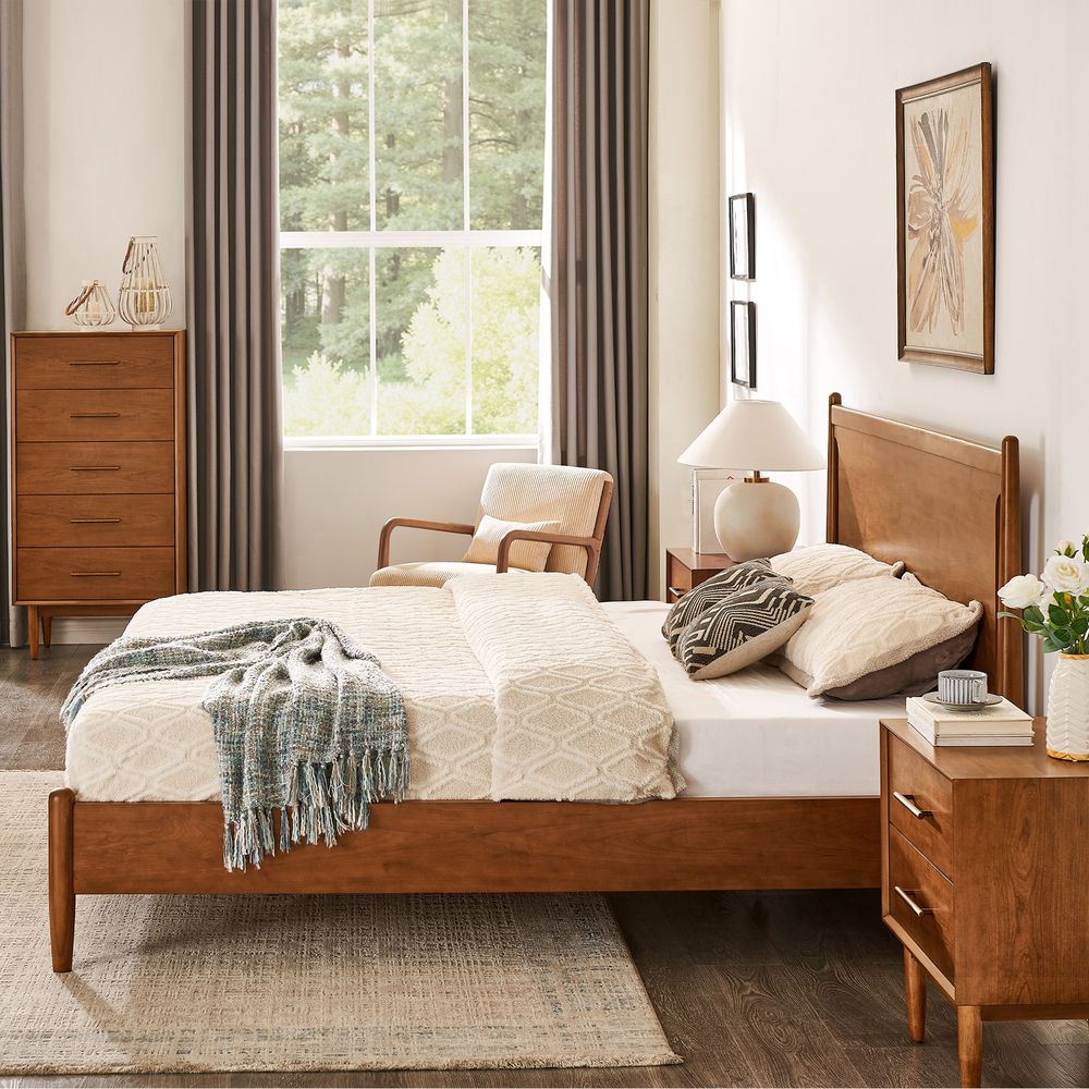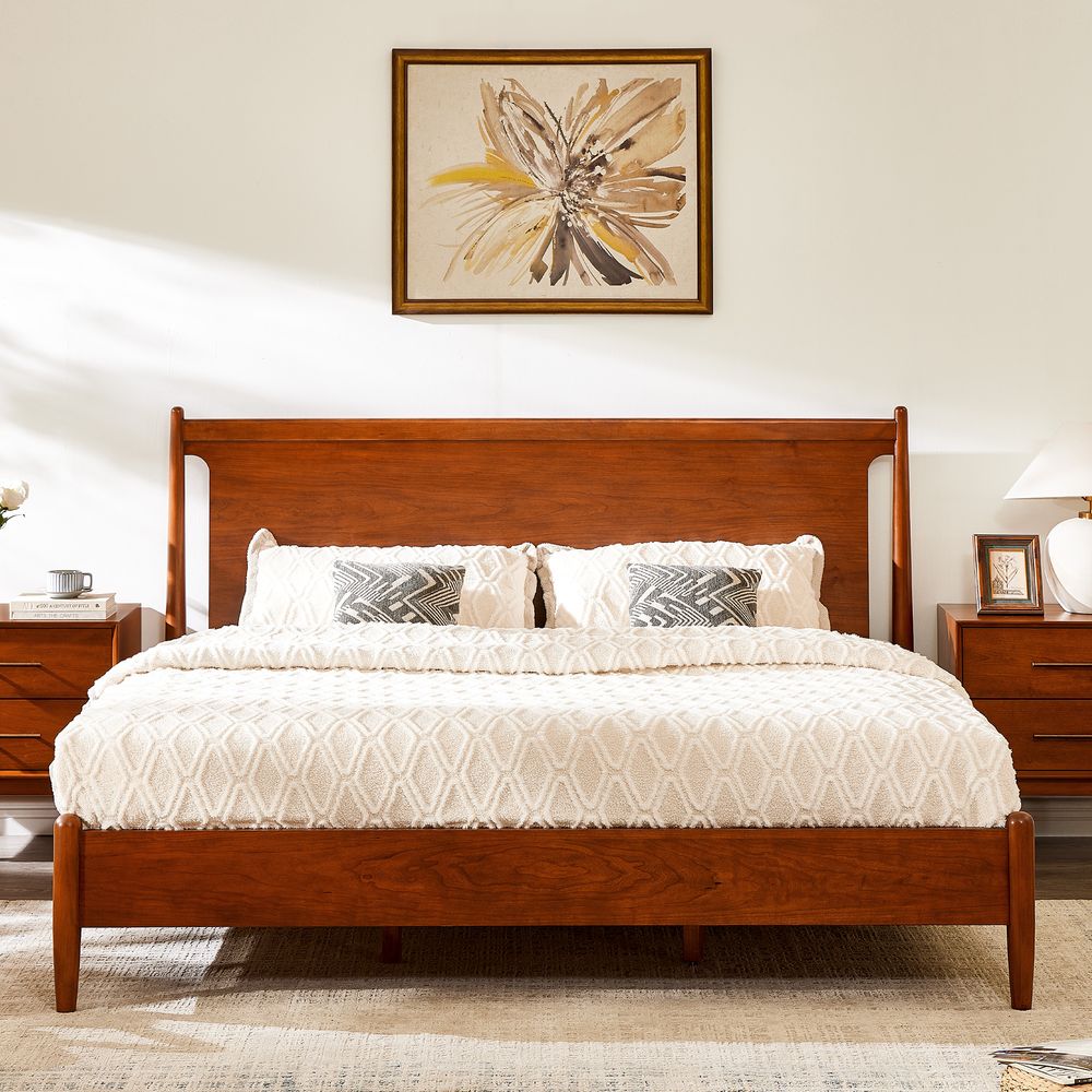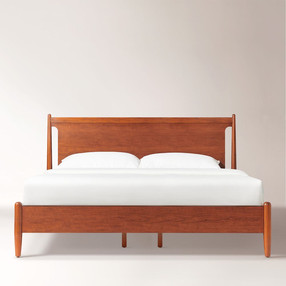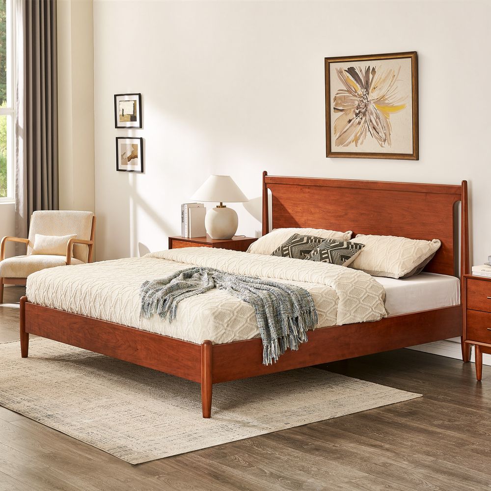 Crafted of solid wood and engineered wood with cherry veneers.All wood is kiln-dried for added durability.Finish is achieved through multistep process in which wood is wire brushed to highlight its rich grain.Wood glazing adds visual interest with greater depth and layering and enhances coloring.Include 6 middle support legs.Bed accommodates most standard mattresses, box spring optional, supporting up to 800 lbs.Color perception may vary due to wood characteristics, lighting, and devices. Wood grain variation is expected, as each is unique.