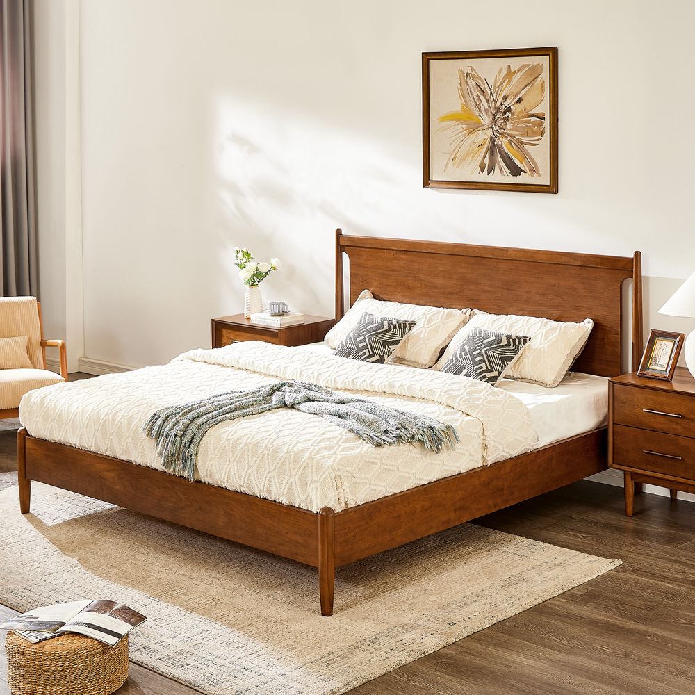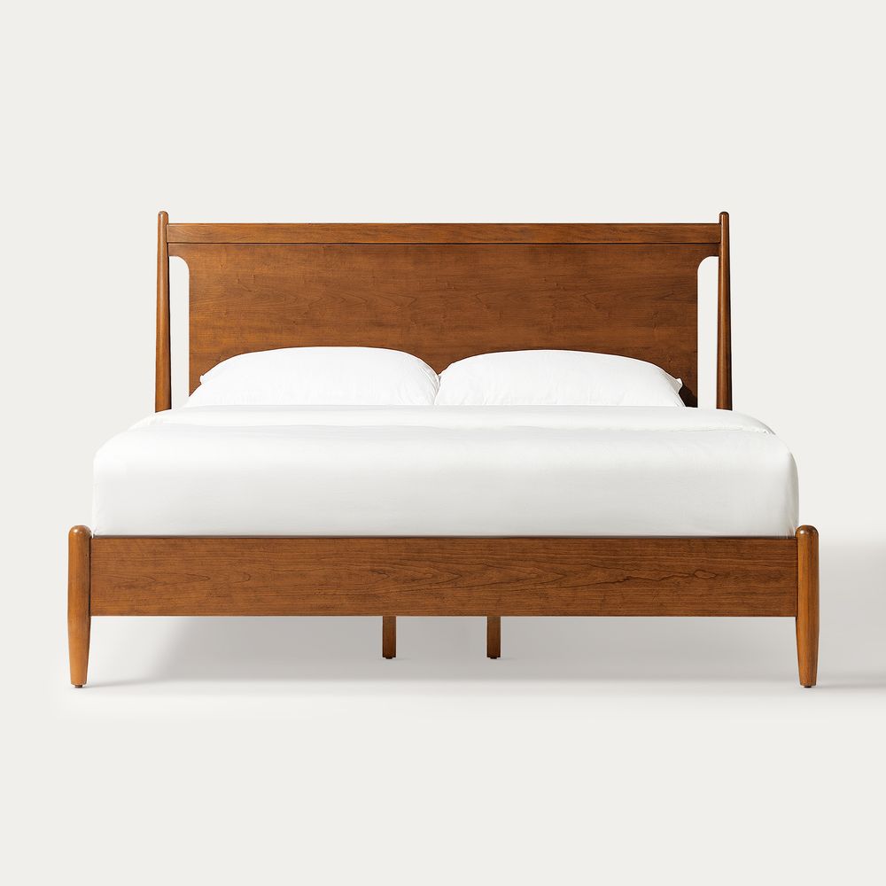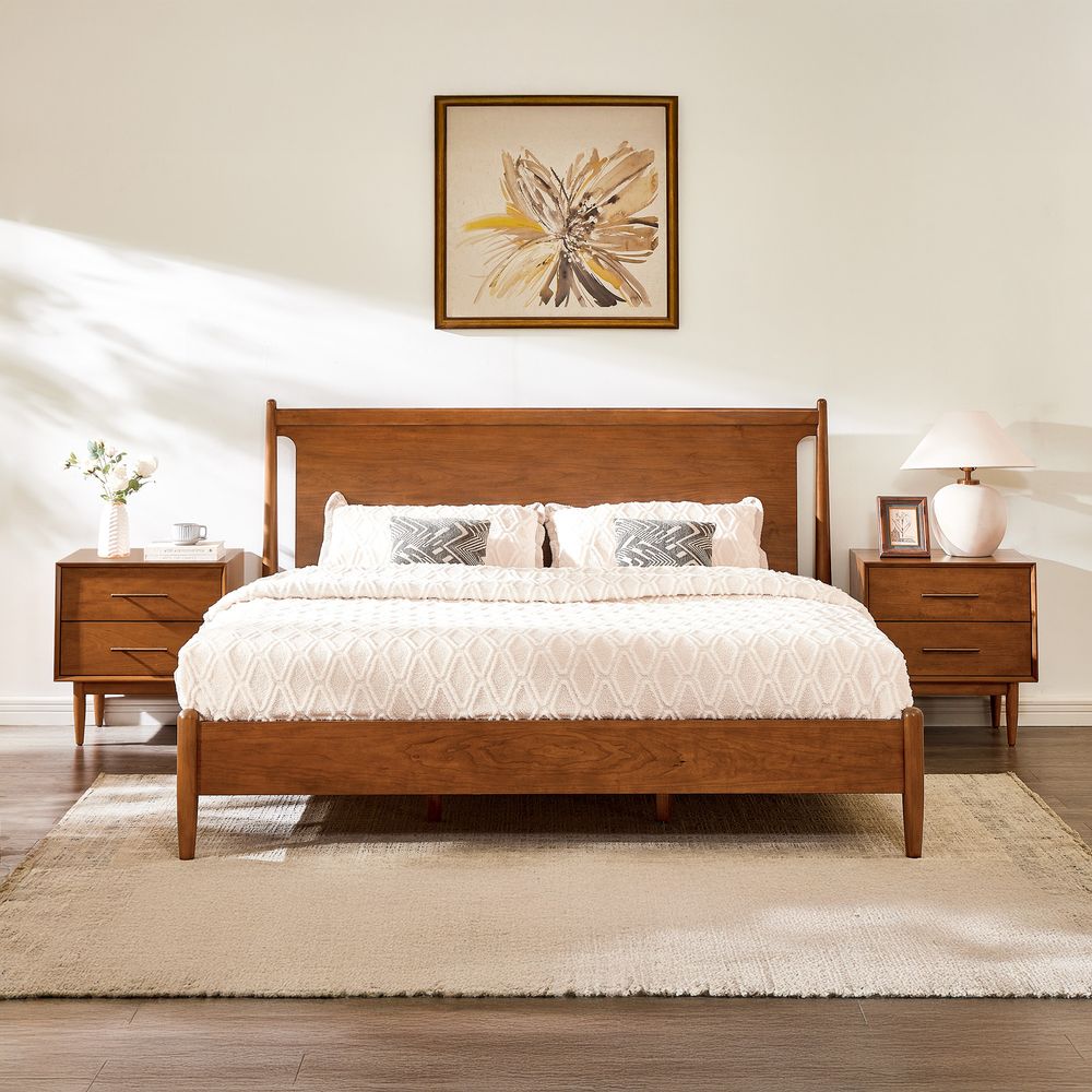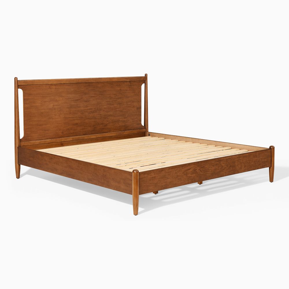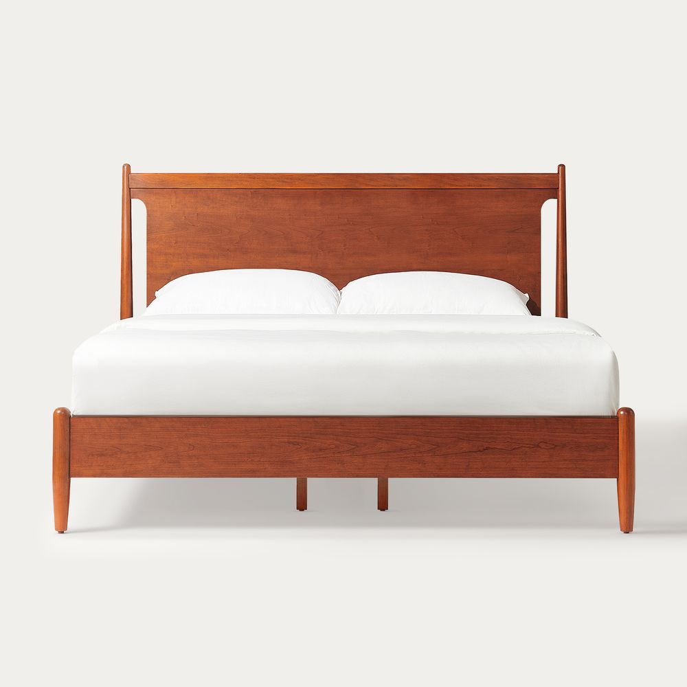 Crafted of solid wood and engineered wood with cherry veneers.All wood is kiln-dried for added durability.Finish is achieved through multistep process in which wood is wire brushed to highlight its rich grain.Wood glazing adds visual interest with greater depth and layering and enhances coloring.Include 6 middle support legs.Bed accommodates most standard mattresses, box spring optional, supporting up to 800 lbs.Color perception may vary due to wood characteristics, lighting, and devices. Wood grain variation is expected, as each is unique.
