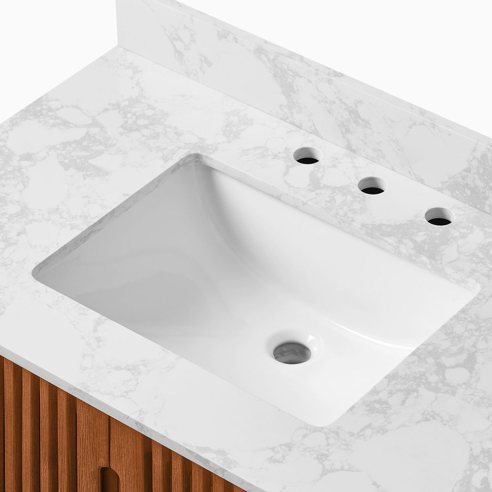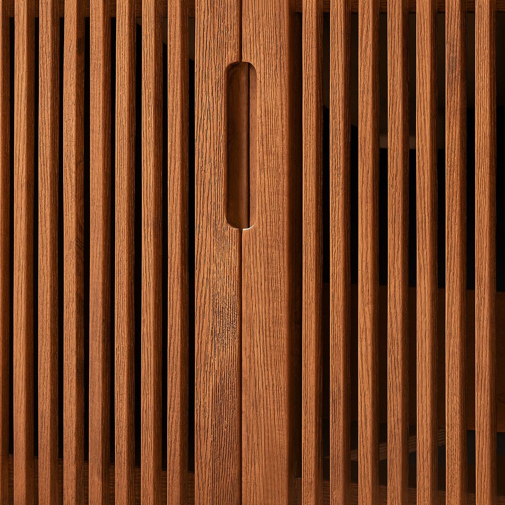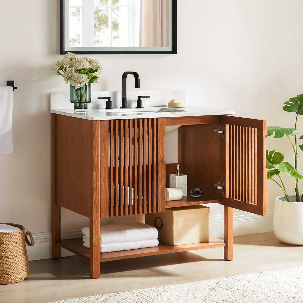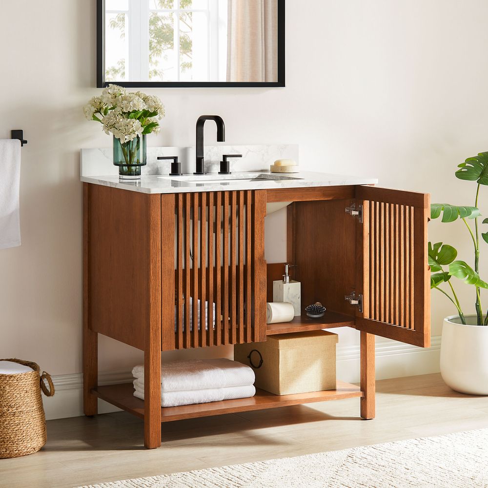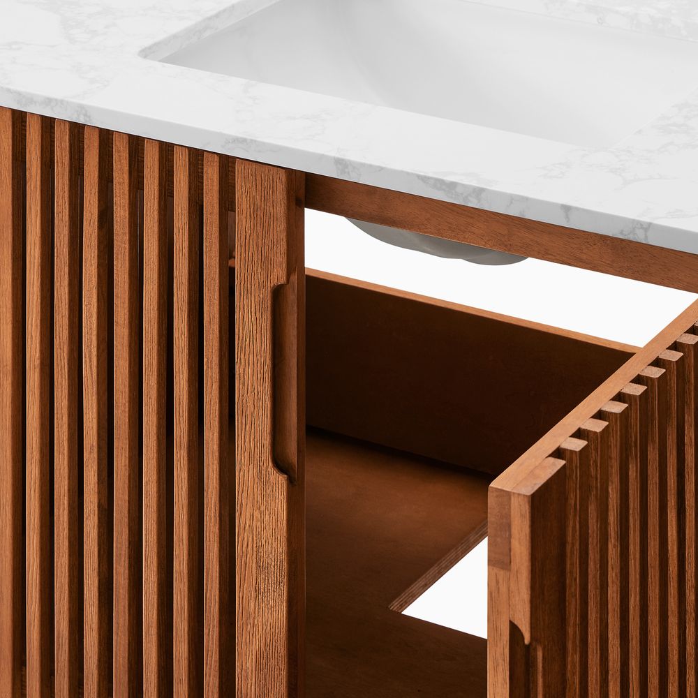The Kaspar bathroom vanity masterfully blends the clean lines of modern design with the warm tactility of natural materials. Evenly distributed wood fluting creates a distinct rhythm, adding rich layers of visual and tactile interest.