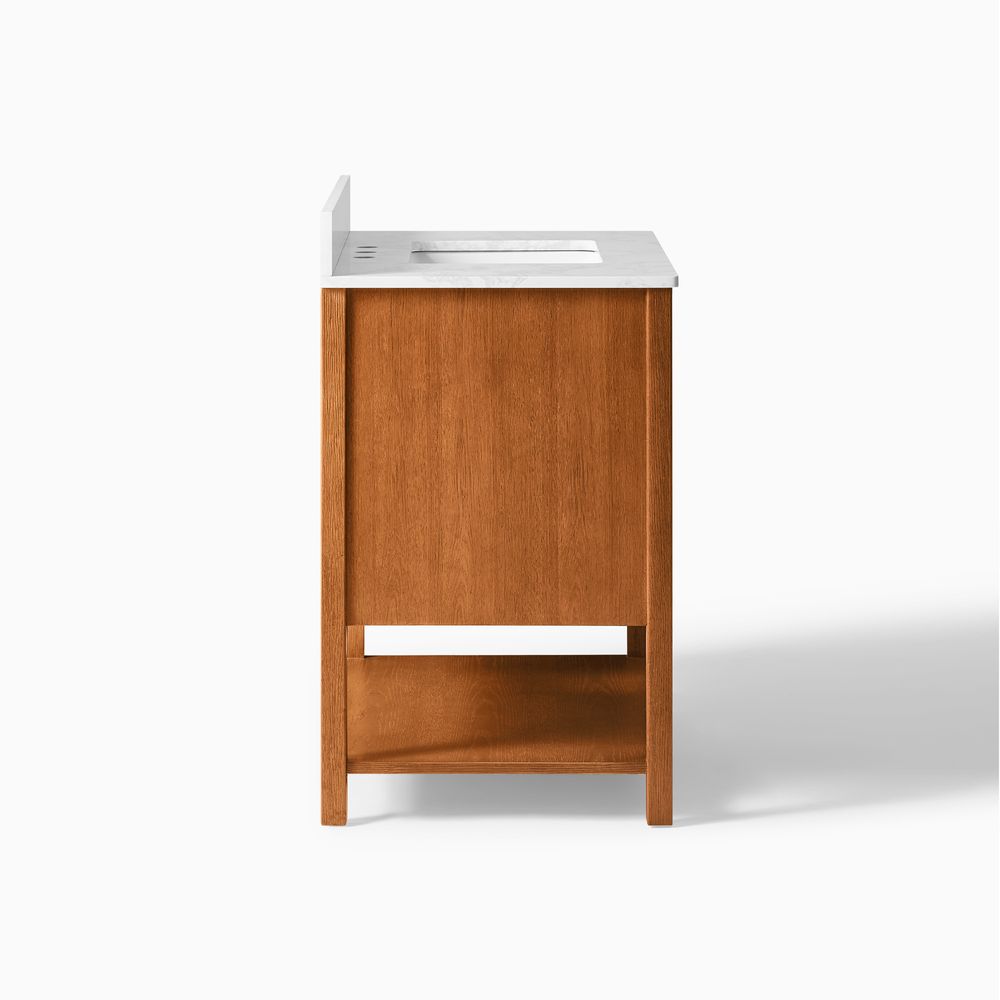 Crafted of cultured marble, American solid oak, and plywood with oak veneers.Countertop and backsplash are honed and sealed for a satin finish with deep veining and natural color contrasts.All wood is kiln-dried for added durability.Finish is achieved through multistep process in which wood is wire brushed to highlight its rich grain.Wood glazing adds visual interest with greater depth and layering and enhances coloring.Solid wood blocks are used at structural joints for reinforcement.Solid wood fluting presents a natural texture.Color perception may vary due to wood characteristics, lighting, and devices. Wood grain variation is expected, as each is unique.Variation in the veining of marble is to be expected, as each piece will be unique.