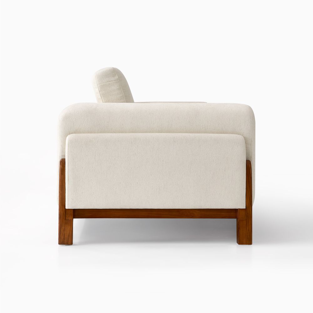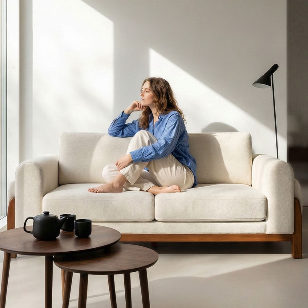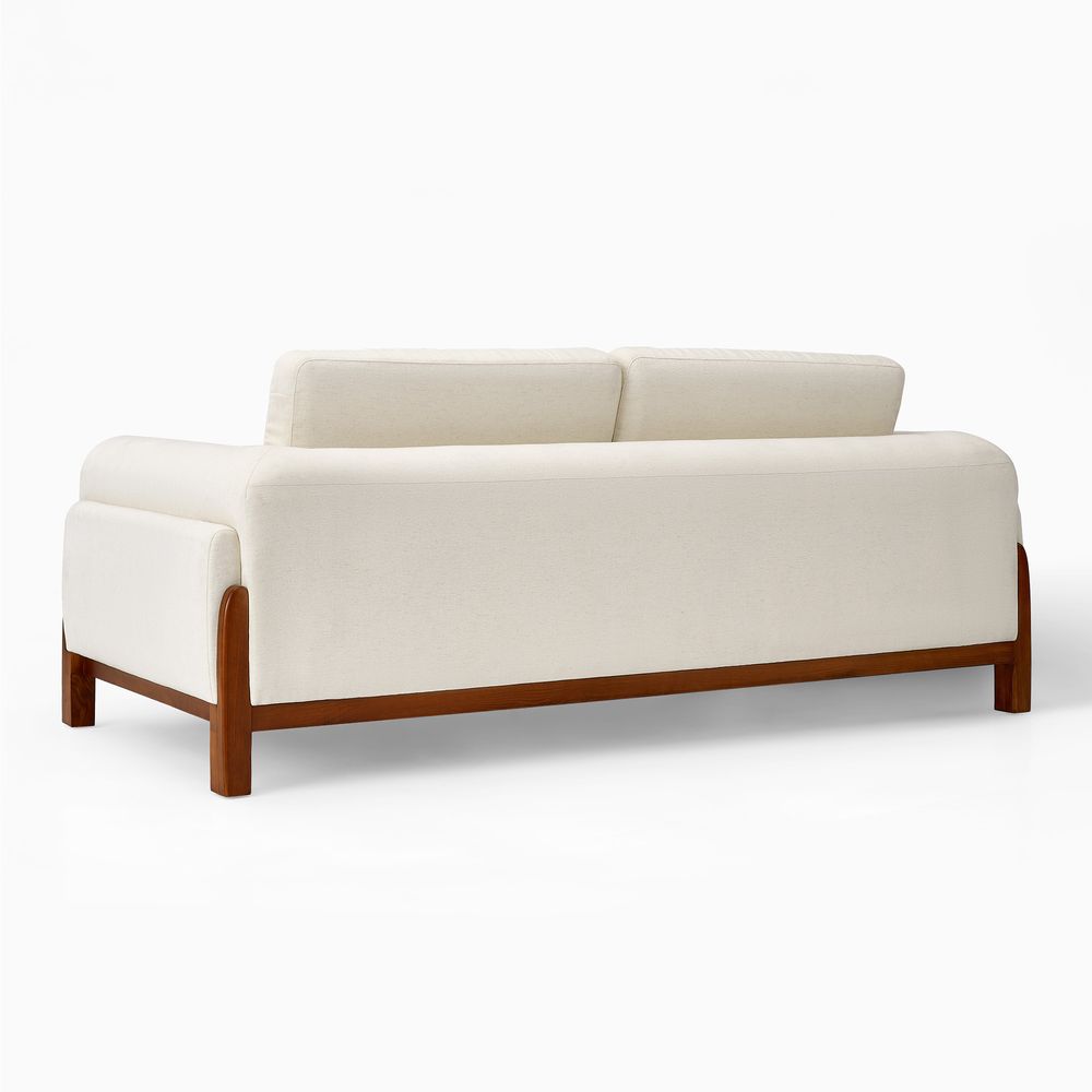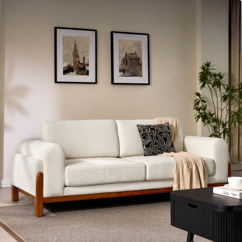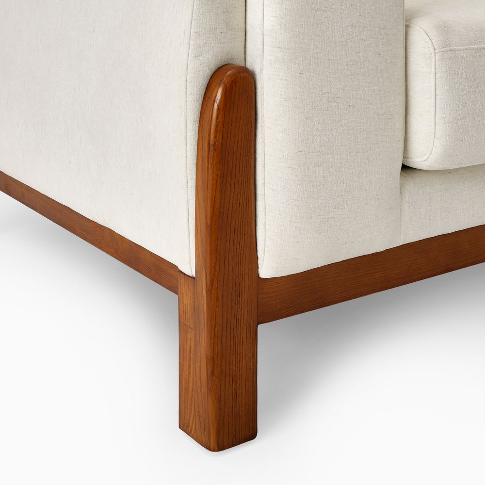 The Koseby sofa perfectly blends organic forms with functional elegance. The soft, rounded arms and plush, cloud-like upholstery offer inviting comfort, beautifully contrasted by the clean, low-profile frame in rich, solid wood. A stylish statement piece that elevates any contemporary living space.