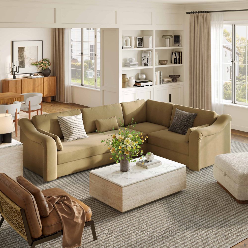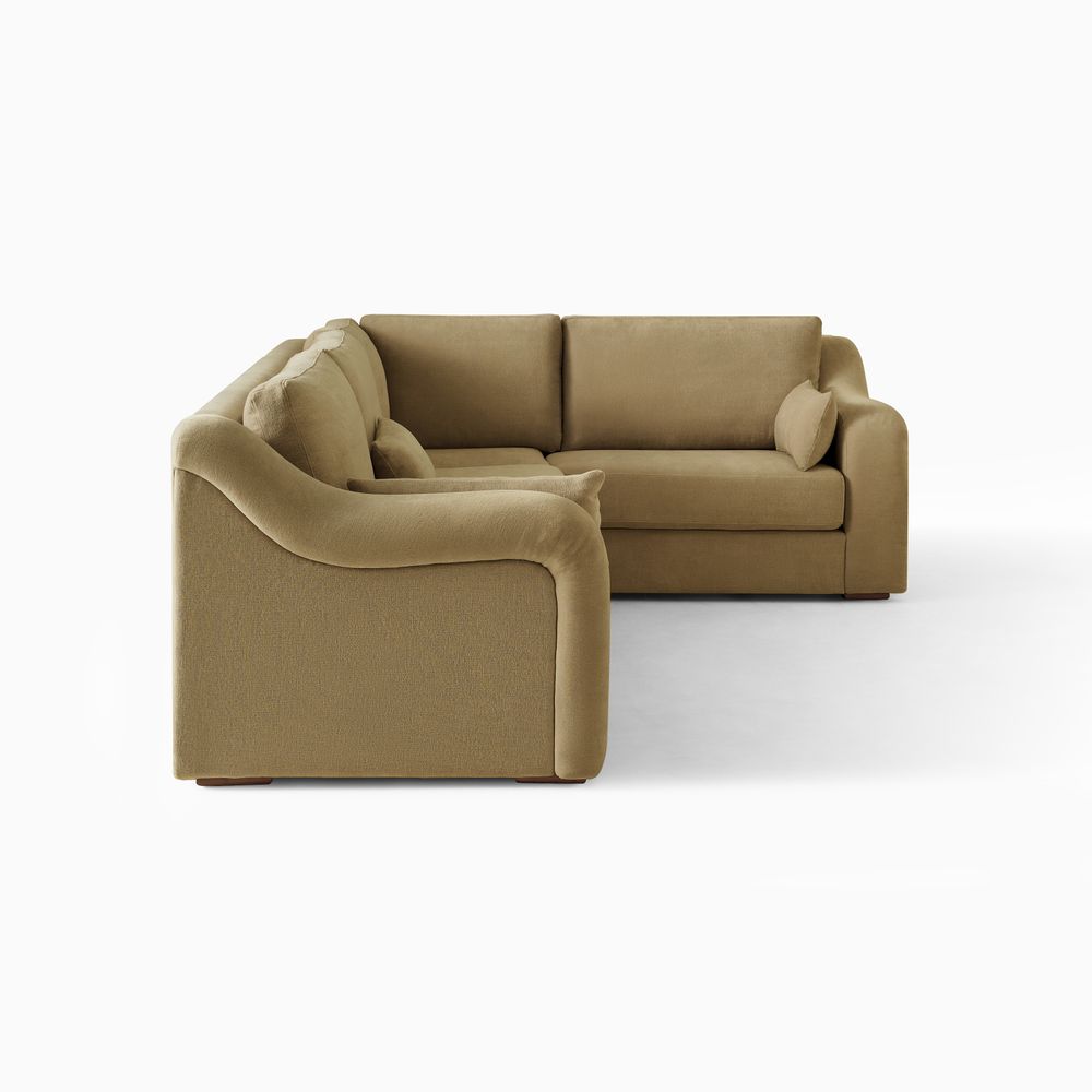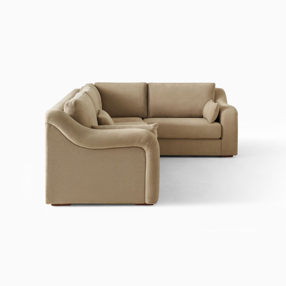 Koselig L-shaped sofa draws inspiration from "effortless everyday luxury"—its curved, plush silhouette mirrors the comfort of casual gatherings, while modular sections adapt to flexible living spaces. Integrated pillows and streamlined proportions balance sink-in coziness with polished, uncluttered design, crafted to feel both lived-in and refined for modern homes.