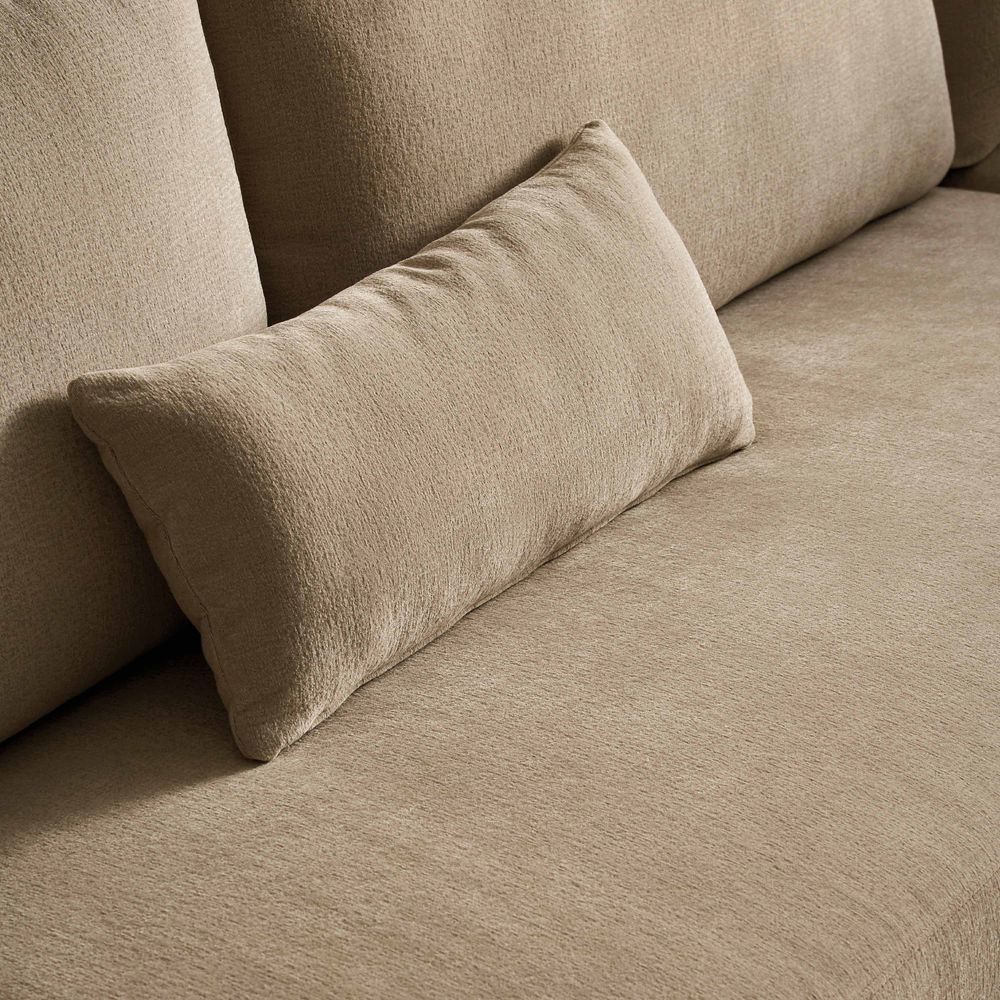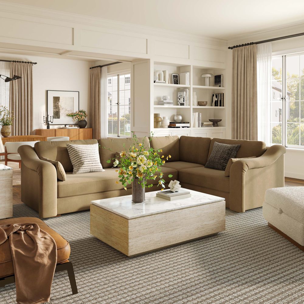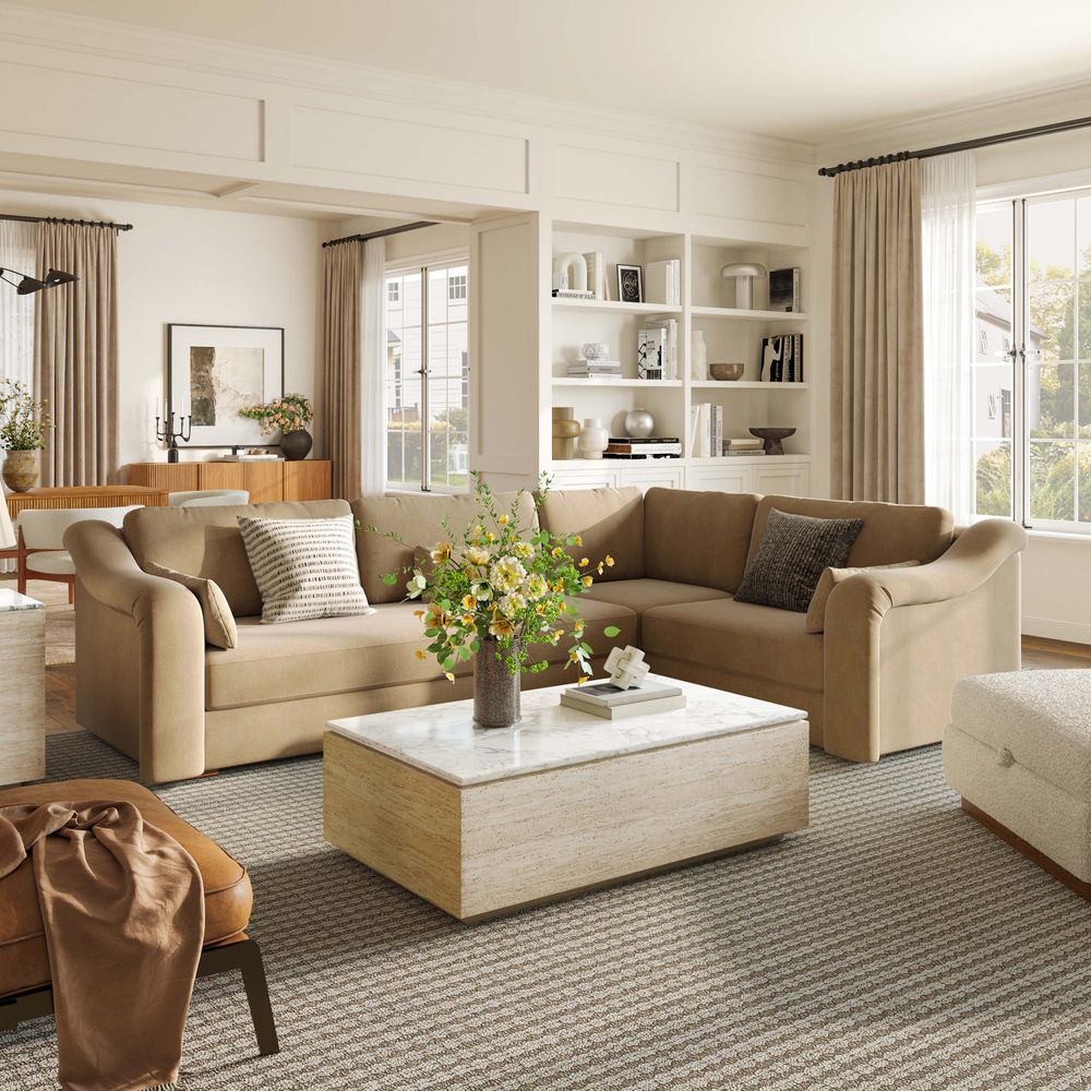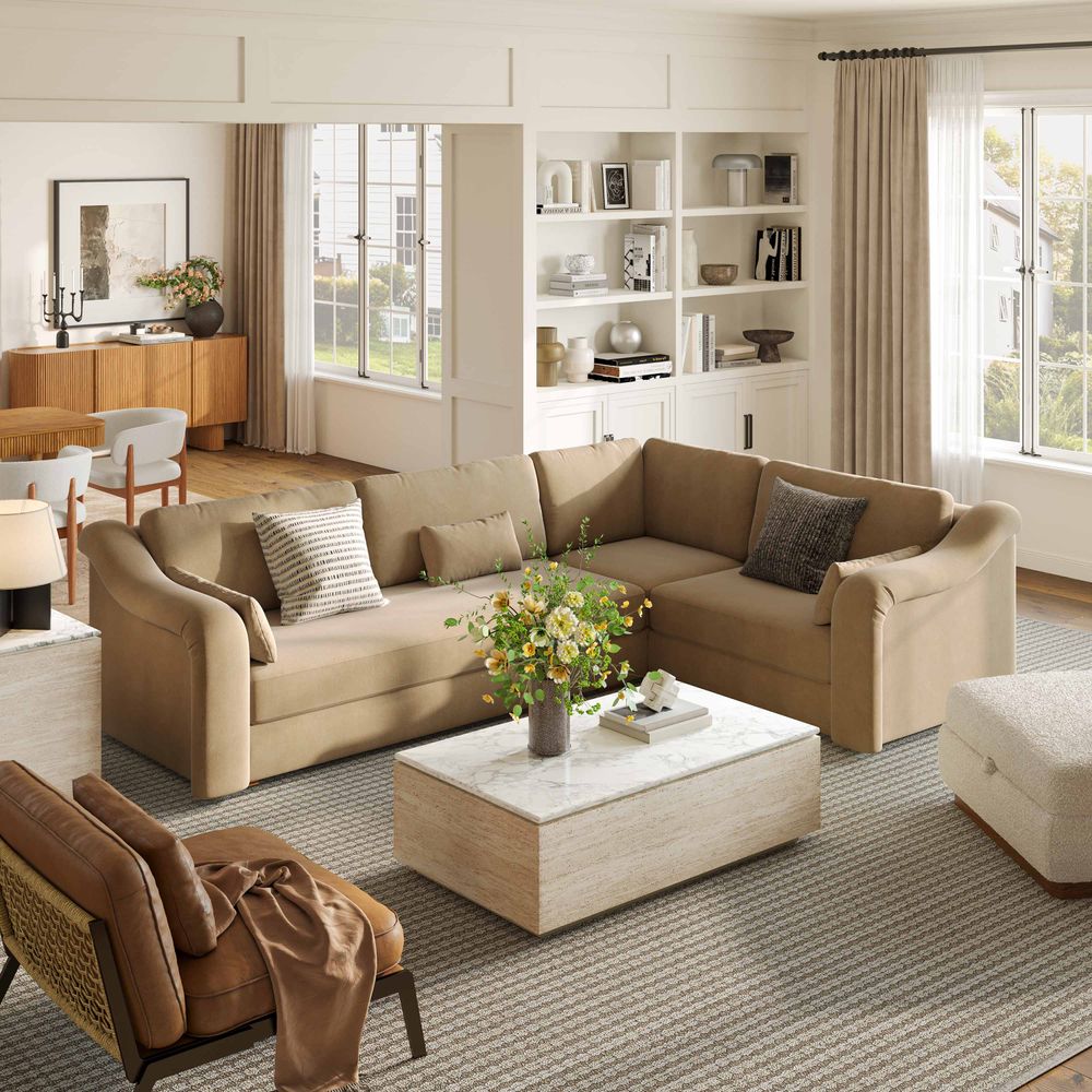 Koselig L-shaped sofa draws inspiration from "effortless everyday luxury"—its curved, plush silhouette mirrors the comfort of casual gatherings, while modular sections adapt to flexible living spaces. Integrated pillows and streamlined proportions balance sink-in coziness with polished, uncluttered design, crafted to feel both lived-in and refined for modern homes.