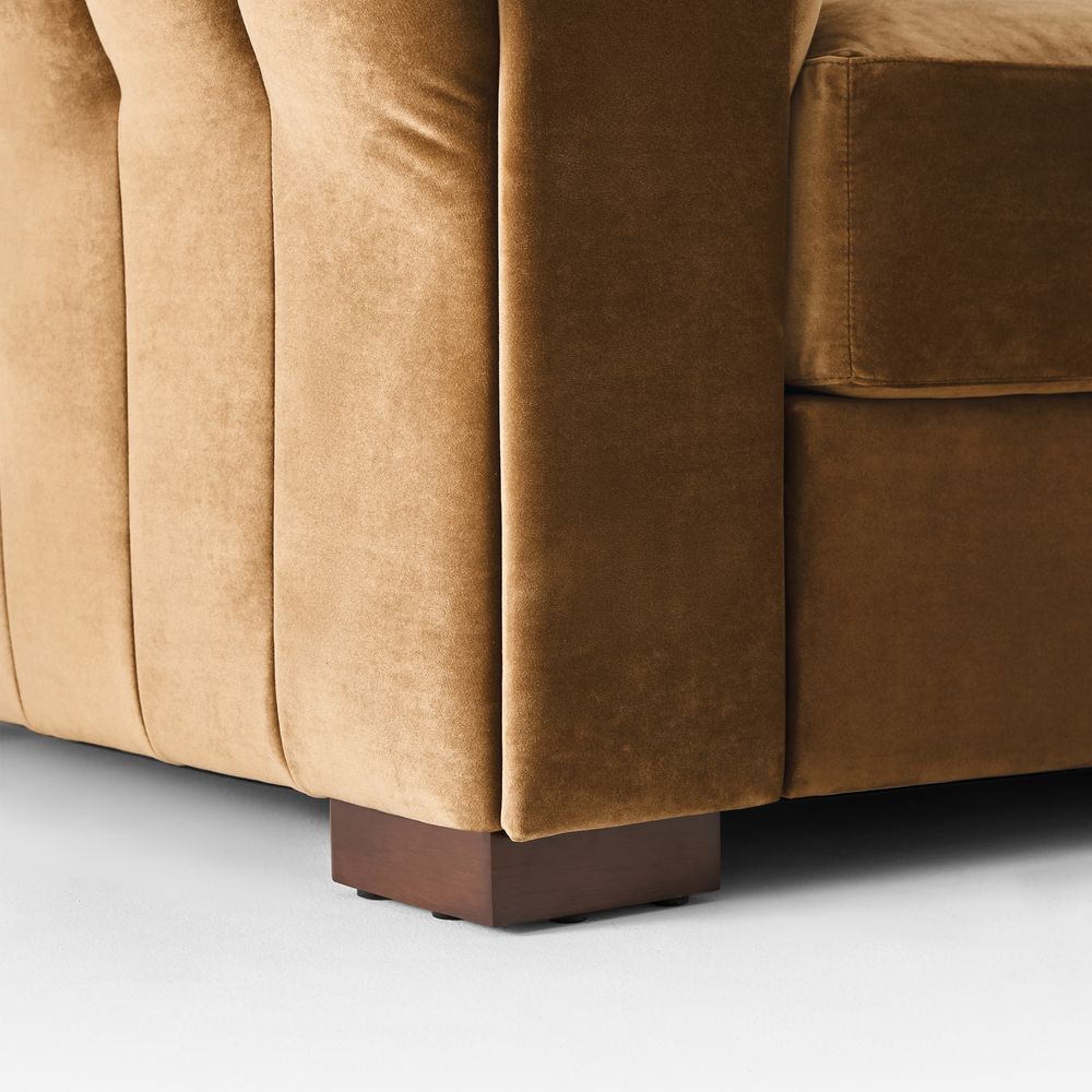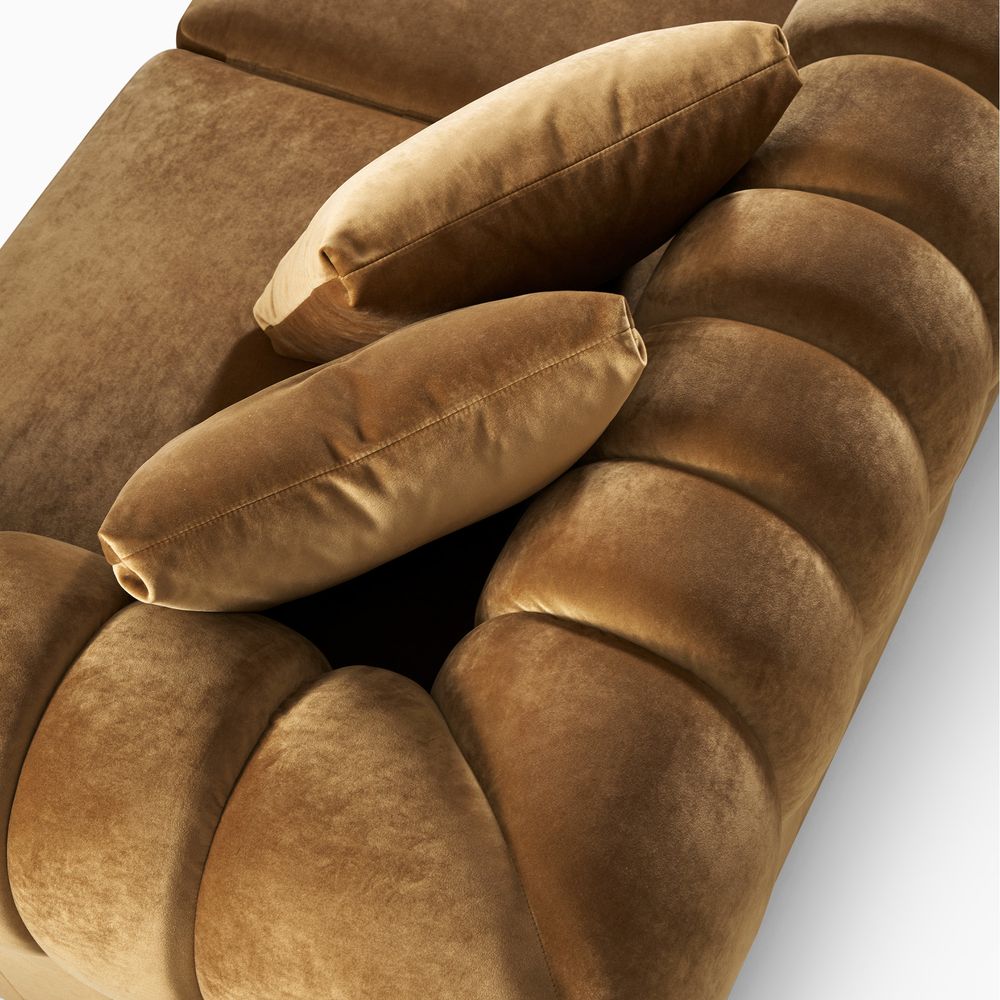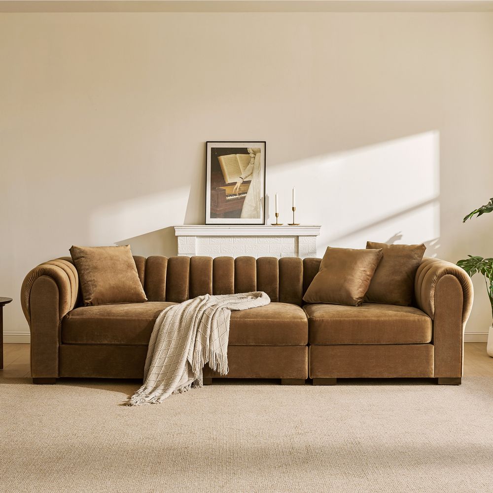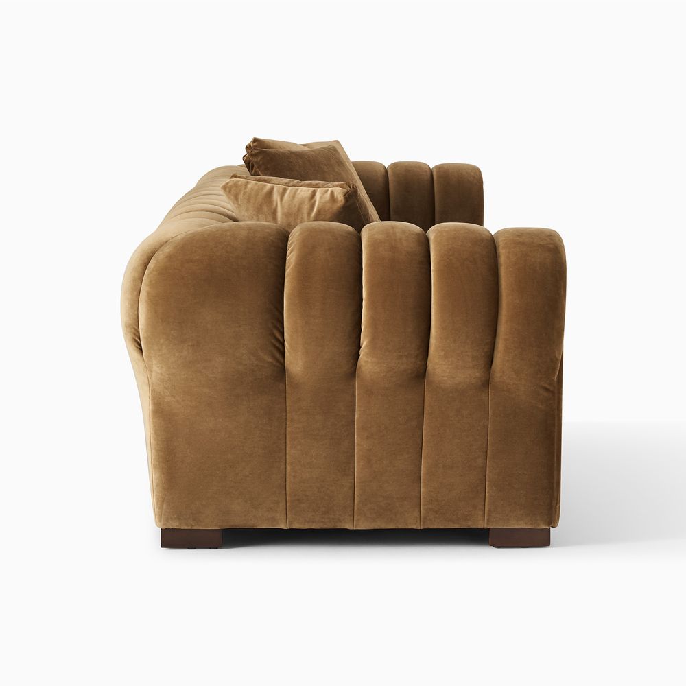 The Kystlin sofa draws inspiration from mid-century modern curves, reimagined with plush, channel-tufted backs that blend retro charm and contemporary comfort. Its rounded arms and tailored silhouette nod to classic lounge aesthetics, while the modular frame balances structured elegance with relaxed, inviting warmth, crafted to feel both timeless and perfectly suited for modern living spaces.