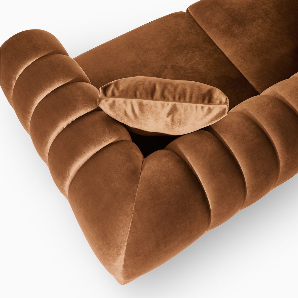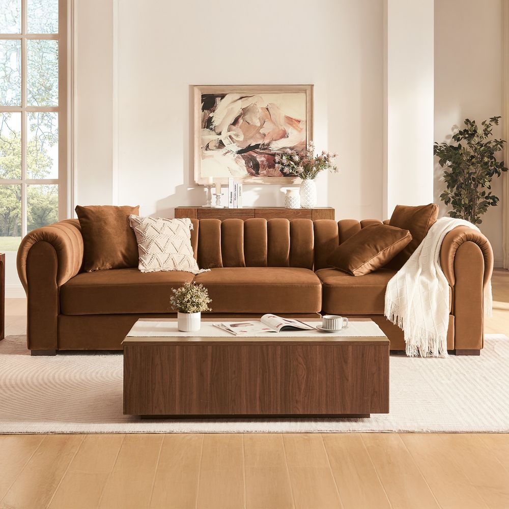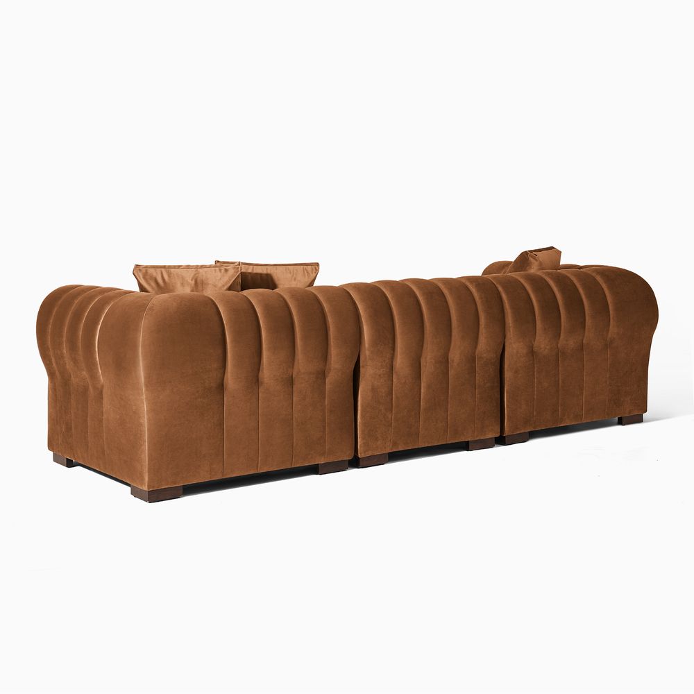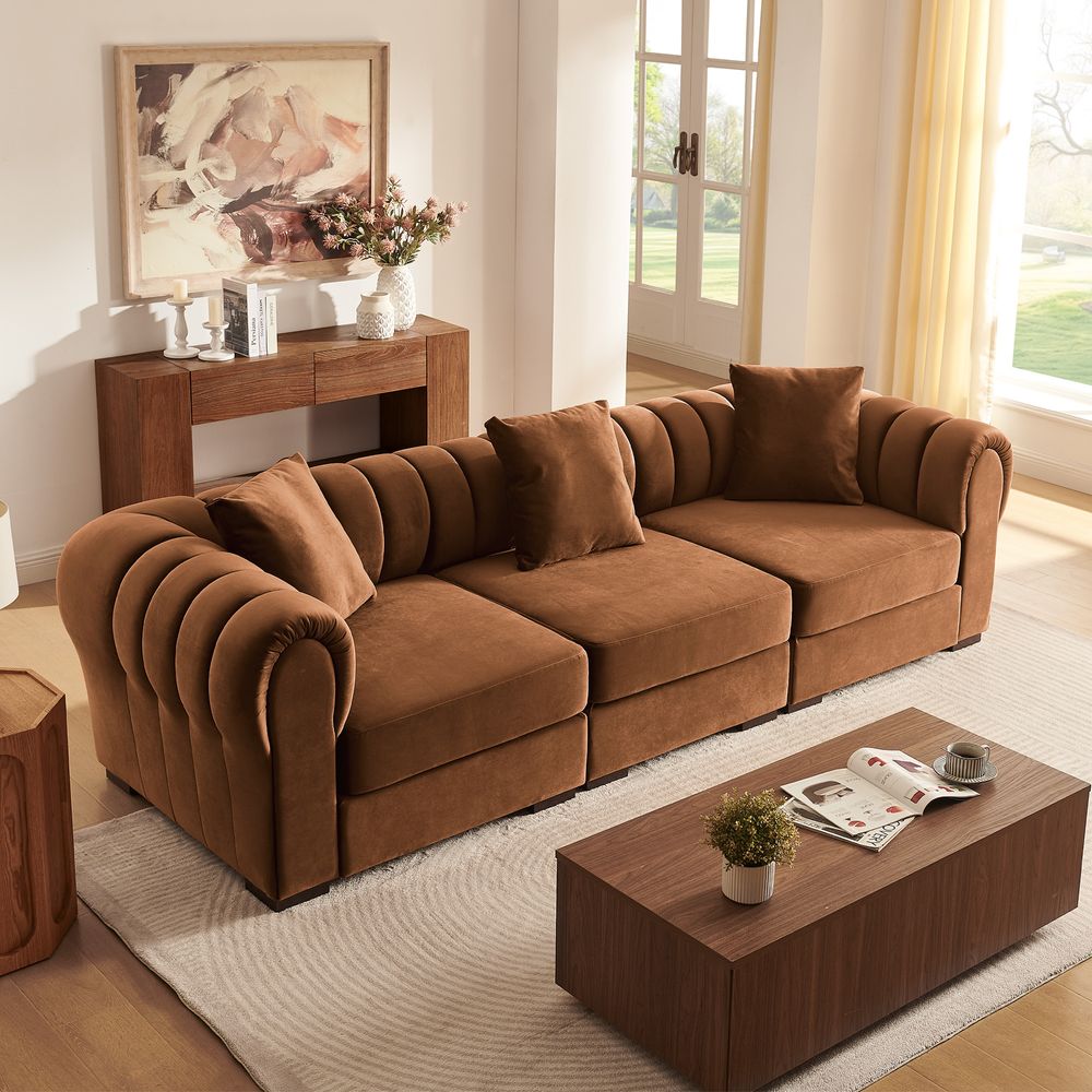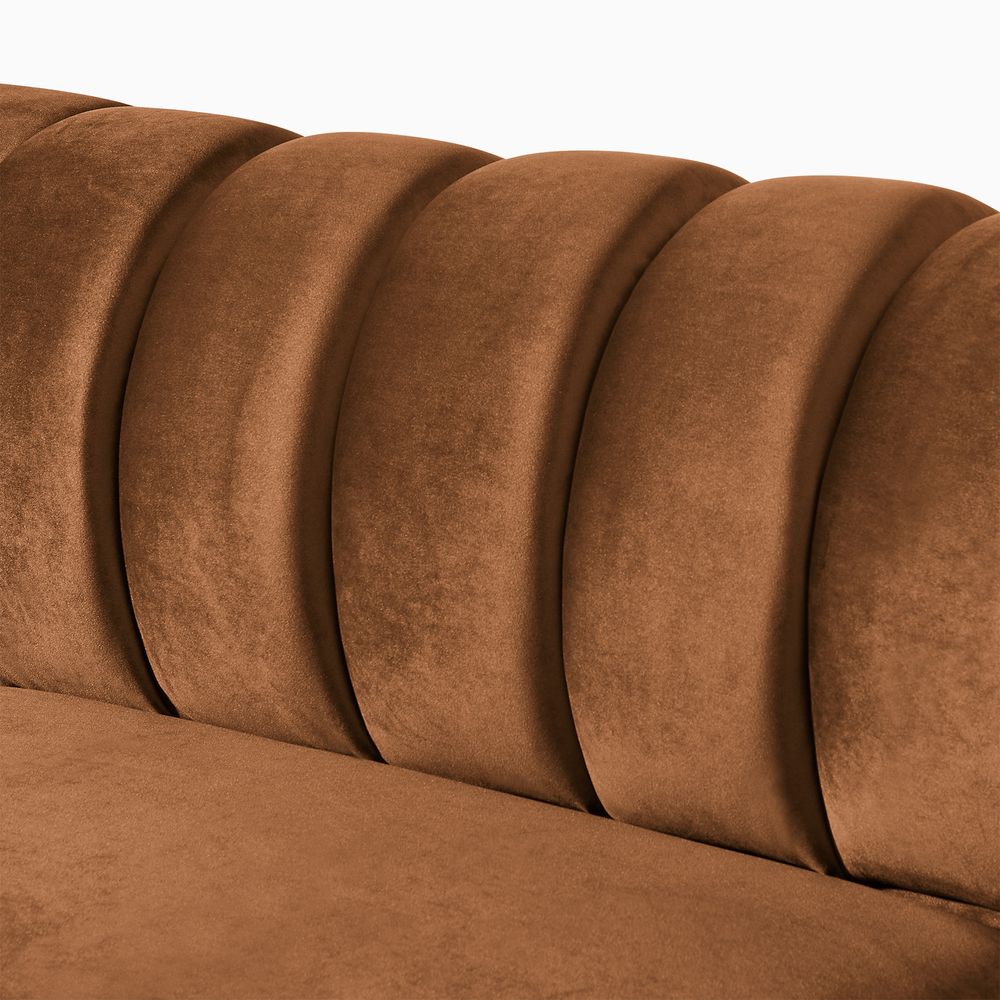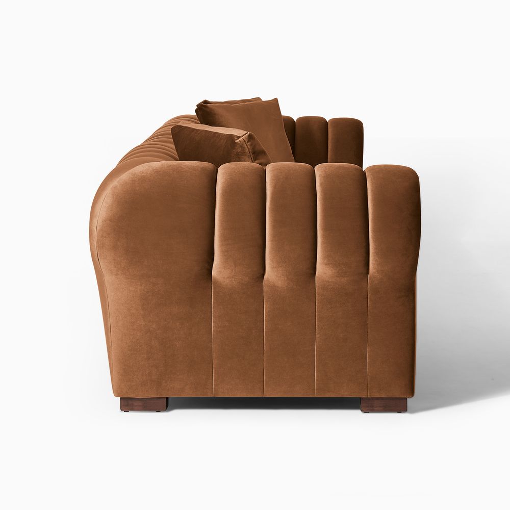 The Kystlin sofa draws inspiration from mid-century modern curves, reimagined with plush, channel-tufted backs that blend retro charm and contemporary comfort. Its rounded arms and tailored silhouette nod to classic lounge aesthetics, while the modular frame balances structured elegance with relaxed, inviting warmth, crafted to feel both timeless and perfectly suited for modern living spaces.