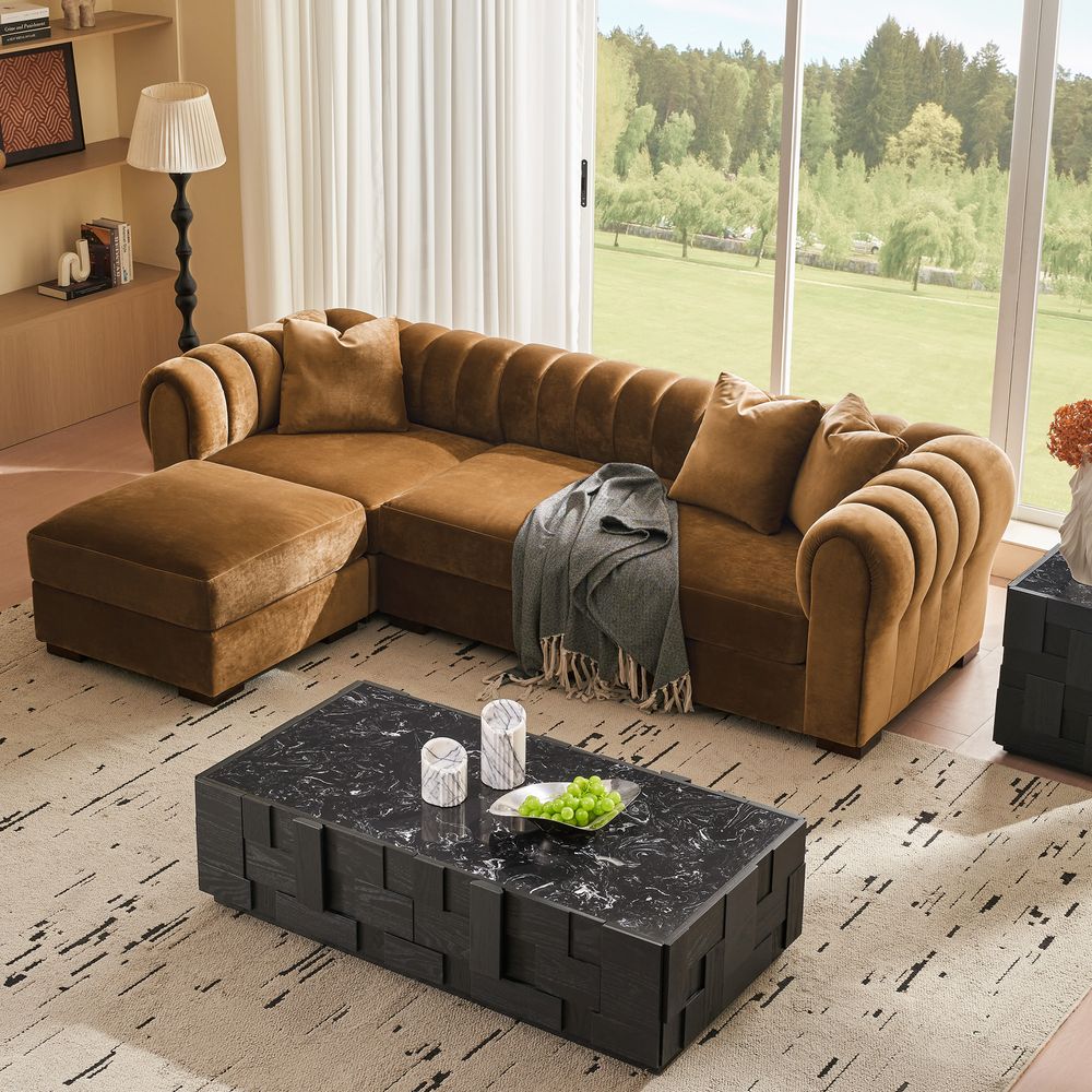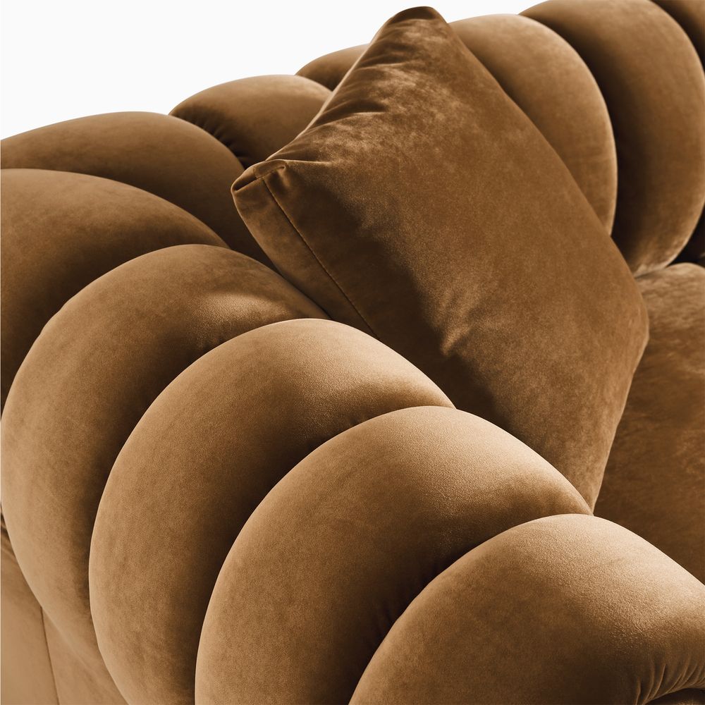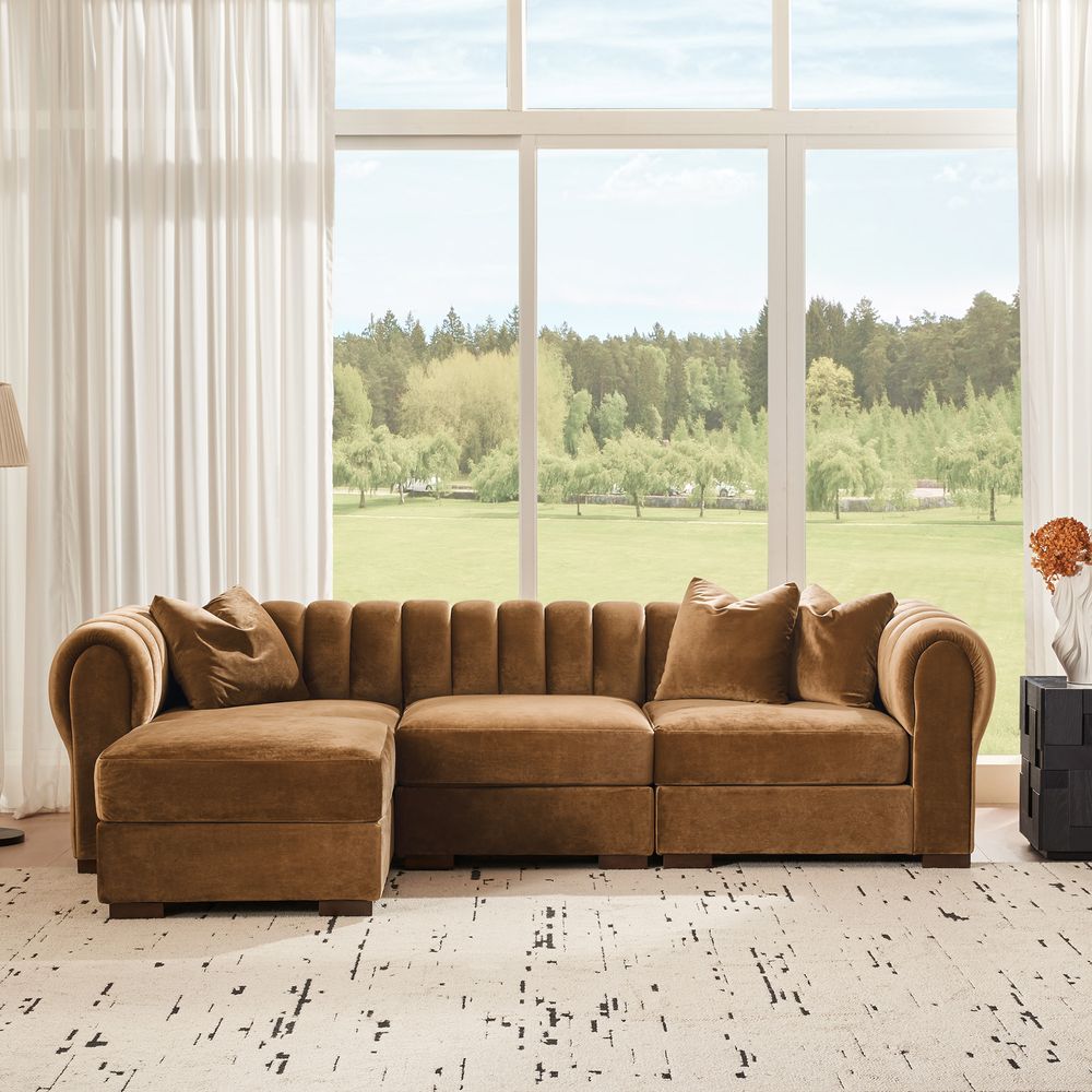 The Kystlin sofa draws inspiration from mid-century modern curves, reimagined with plush, channel-tufted backs that blend retro charm and contemporary comfort. Its rounded arms and tailored silhouette nod to classic lounge aesthetics, while the modular frame balances structured elegance with relaxed, inviting warmth, crafted to feel both timeless and perfectly suited for modern living spaces.
