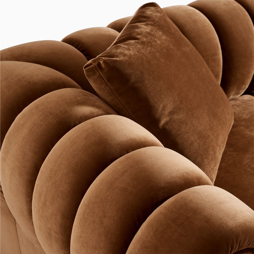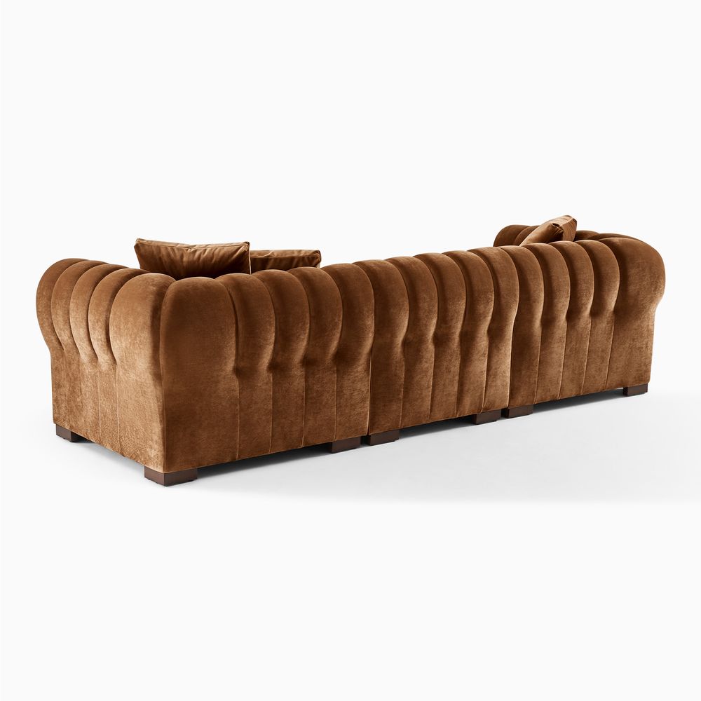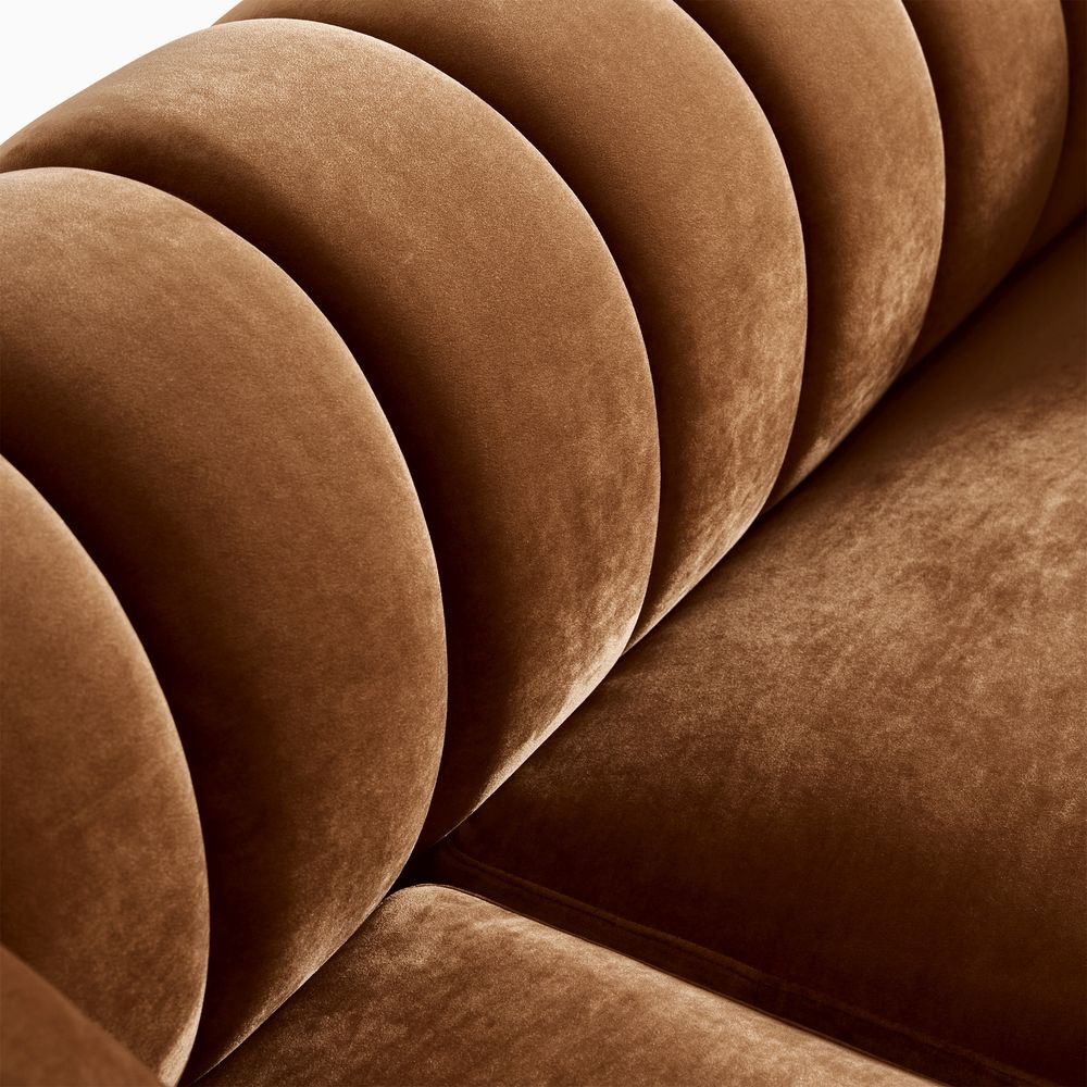 The Kystlin sofa draws inspiration from mid-century modern curves, reimagined with plush, channel-tufted backs that blend retro charm and contemporary comfort. Its rounded arms and tailored silhouette nod to classic lounge aesthetics, while the modular frame balances structured elegance with relaxed, inviting warmth, crafted to feel both timeless and perfectly suited for modern living spaces.
