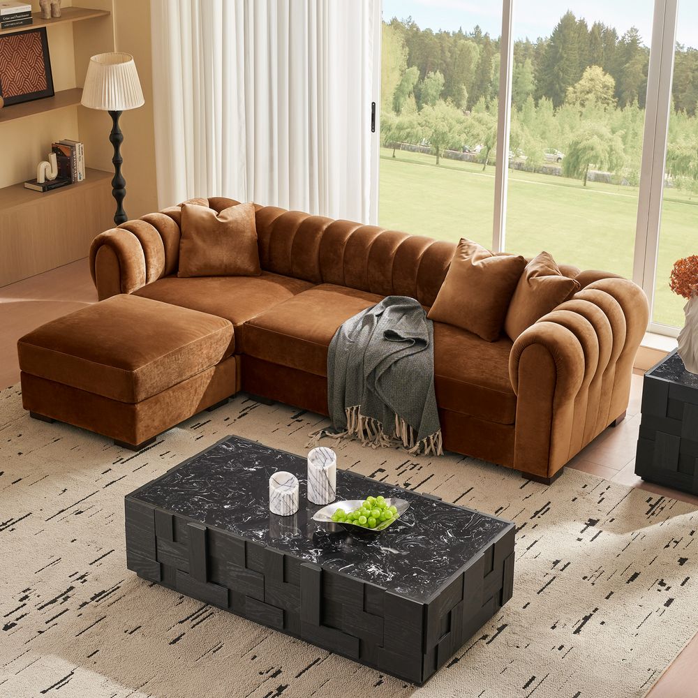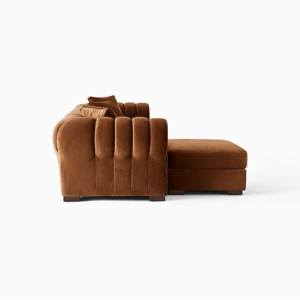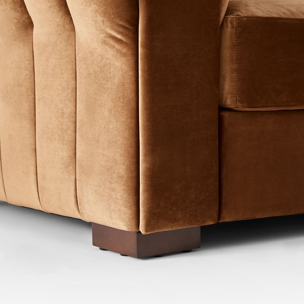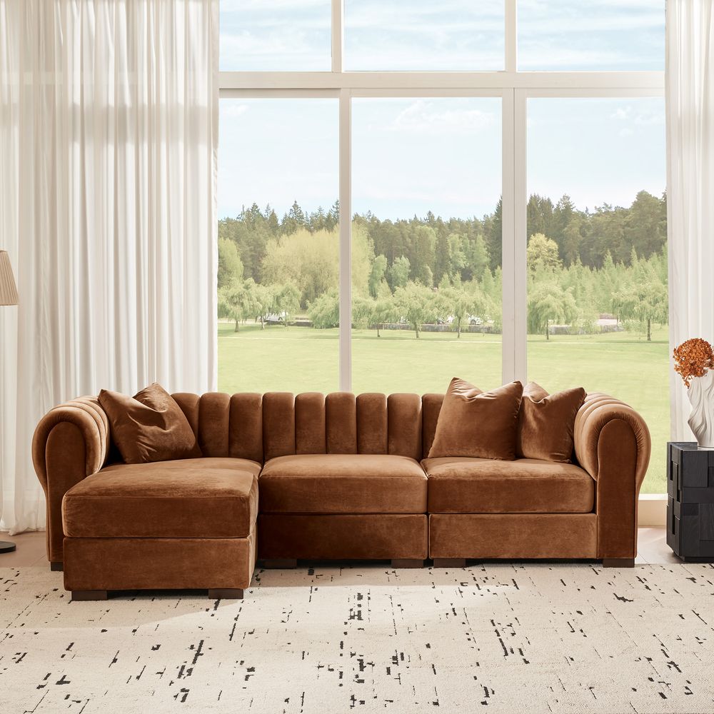 The Kystlin sofa draws inspiration from mid-century modern curves, reimagined with plush, channel-tufted backs that blend retro charm and contemporary comfort. Its rounded arms and tailored silhouette nod to classic lounge aesthetics, while the modular frame balances structured elegance with relaxed, inviting warmth, crafted to feel both timeless and perfectly suited for modern living spaces.