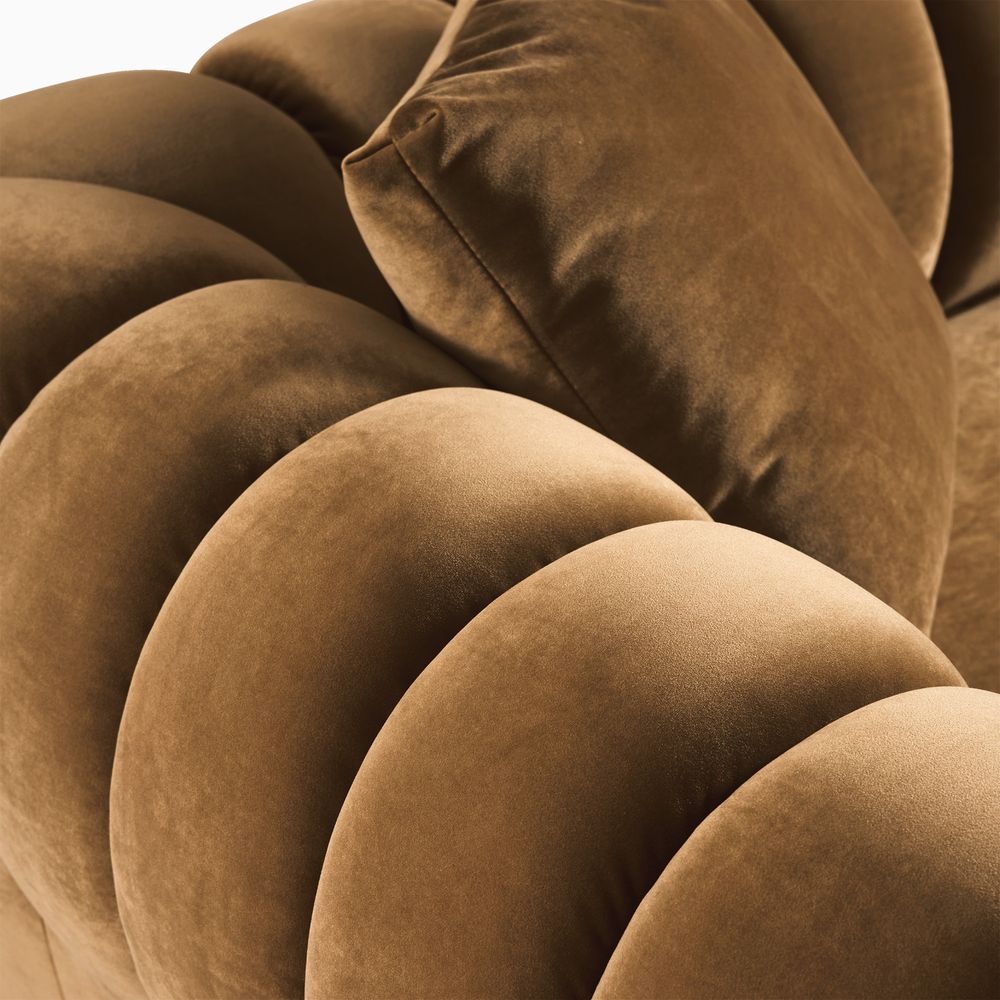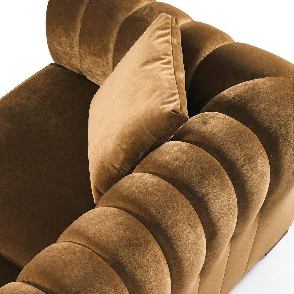 The Kystlin sofa draws inspiration from mid-century modern curves, reimagined with plush, channel-tufted backs that blend retro charm and contemporary comfort. Its rounded arms and tailored silhouette nod to classic lounge aesthetics, while the modular frame balances structured elegance with relaxed, inviting warmth, crafted to feel both timeless and perfectly suited for modern living spaces.