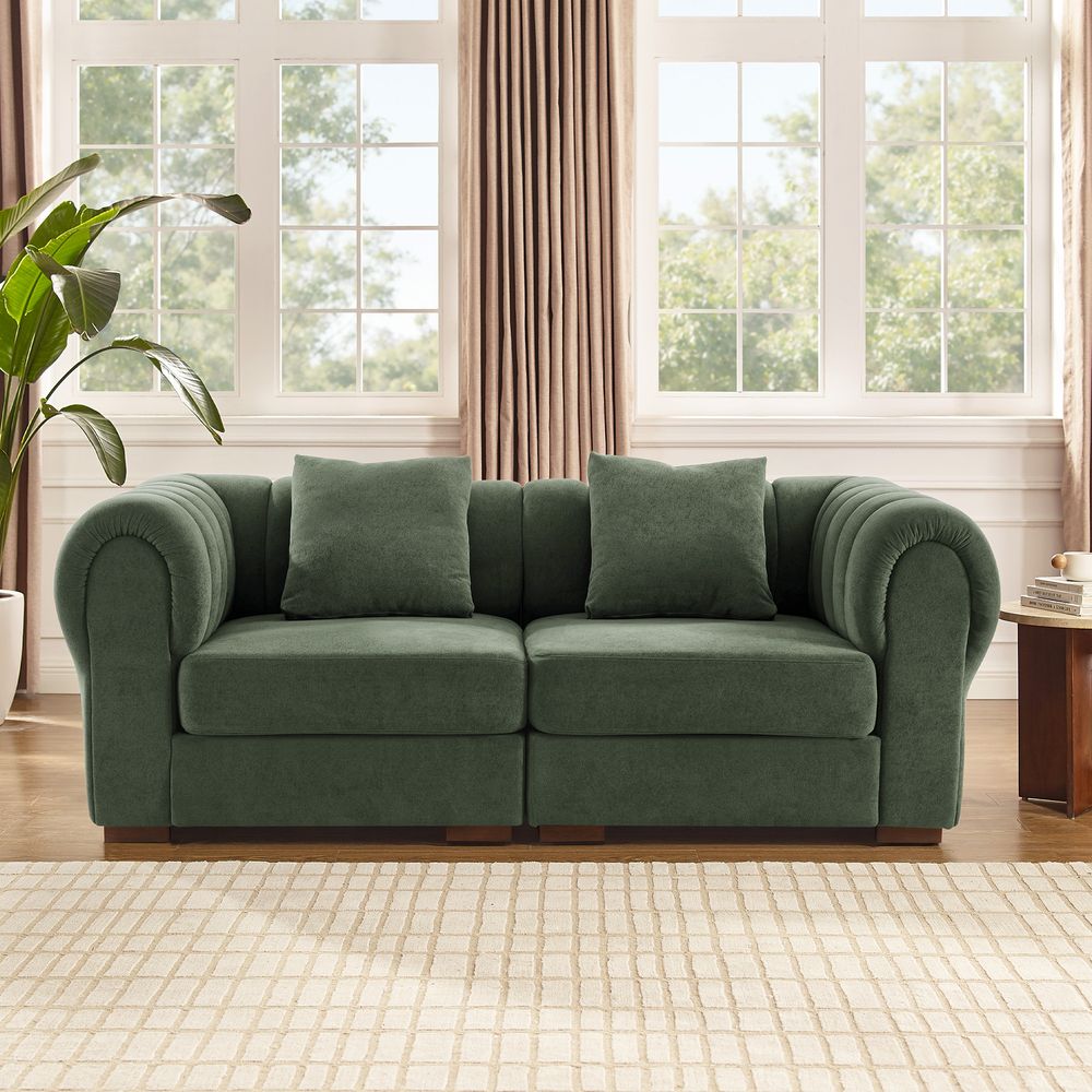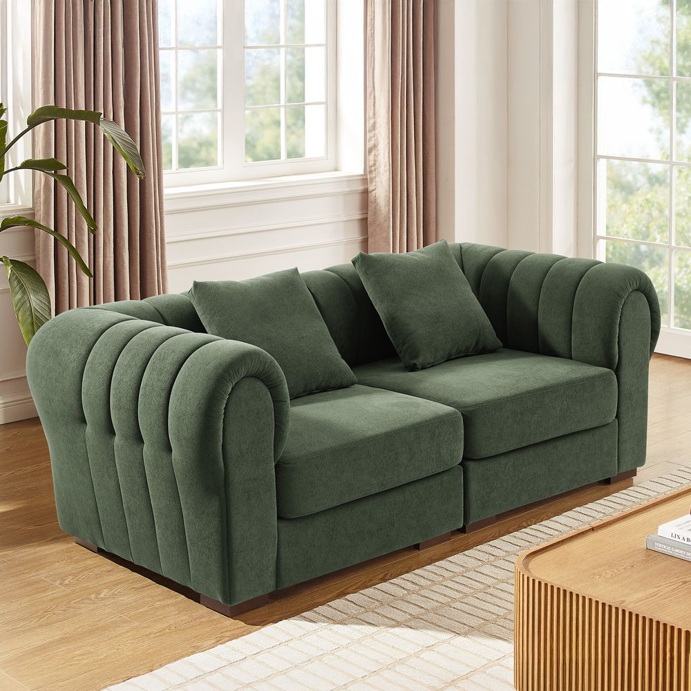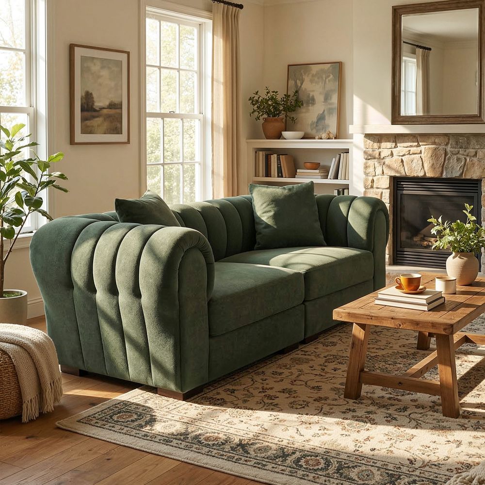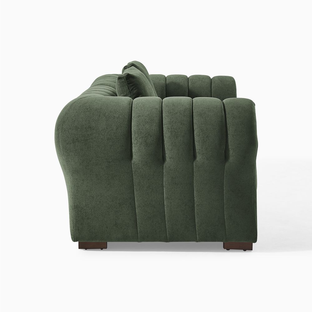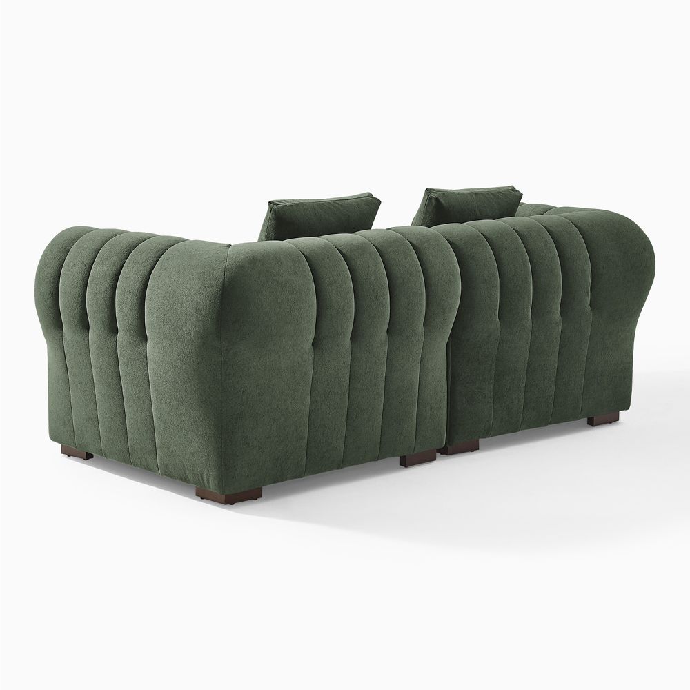 The Kystlin sofa draws inspiration from mid-century modern curves, reimagined with plush, channel-tufted backs that blend retro charm and contemporary comfort. Its rounded arms and tailored silhouette nod to classic lounge aesthetics, while the modular frame balances structured elegance with relaxed, inviting warmth, crafted to feel both timeless and perfectly suited for modern living spaces.