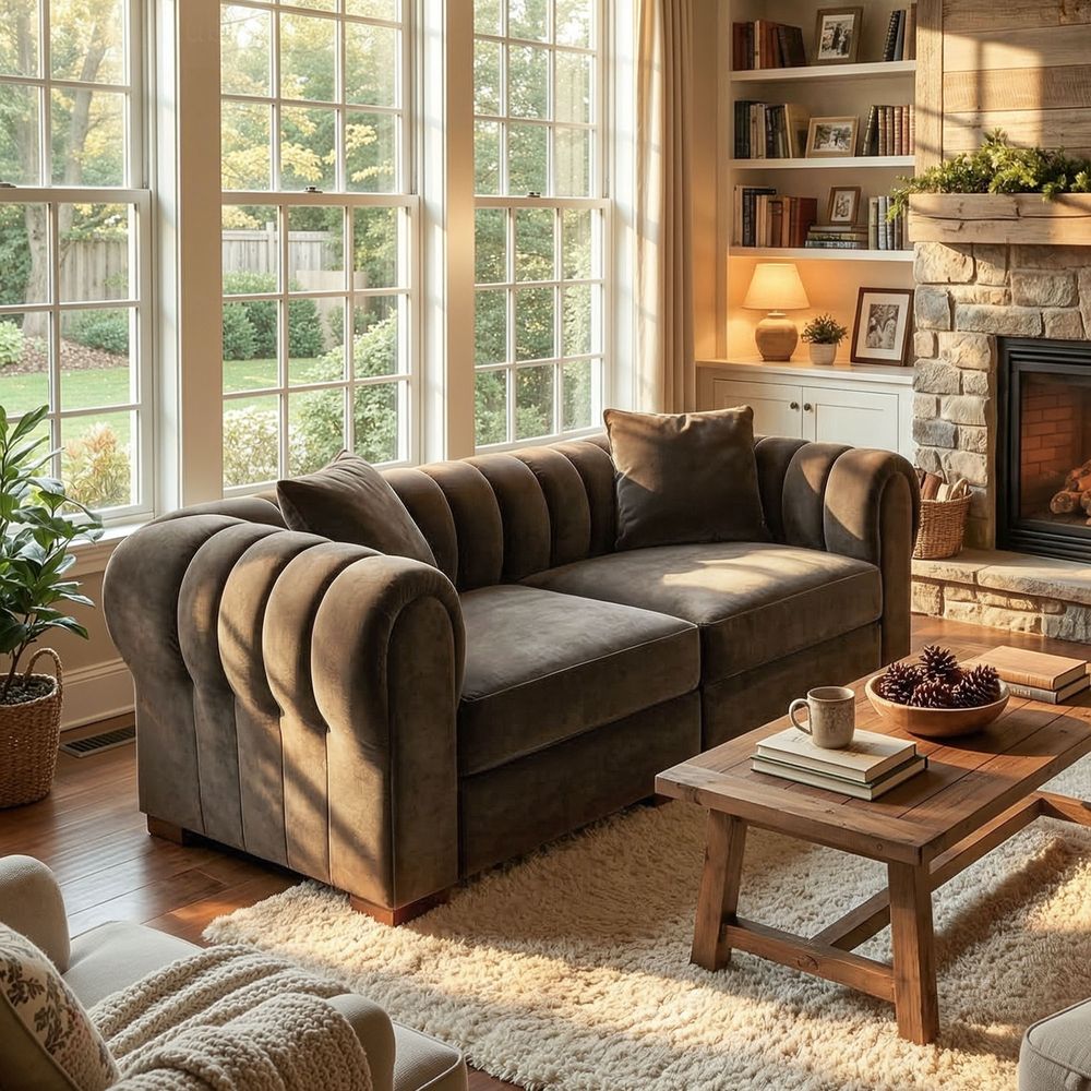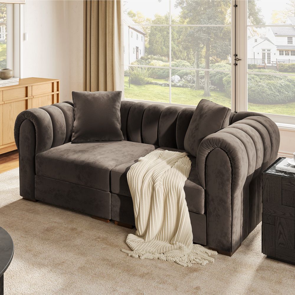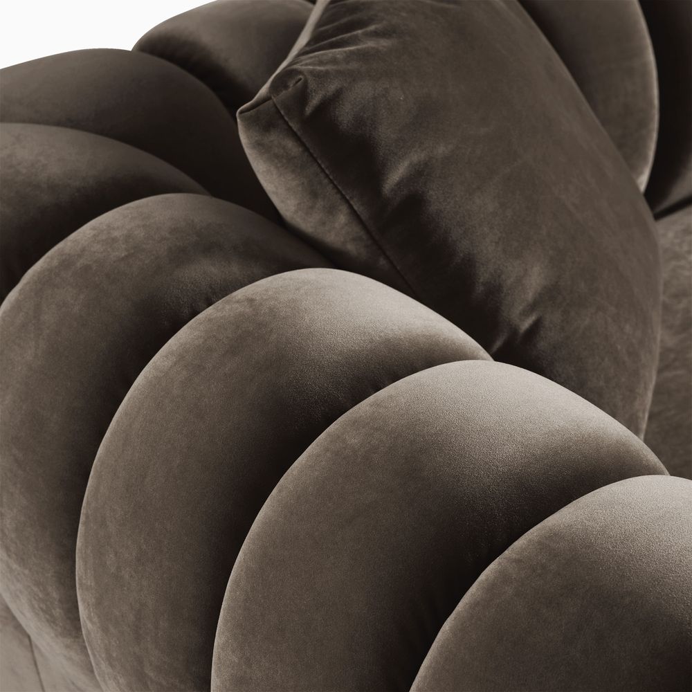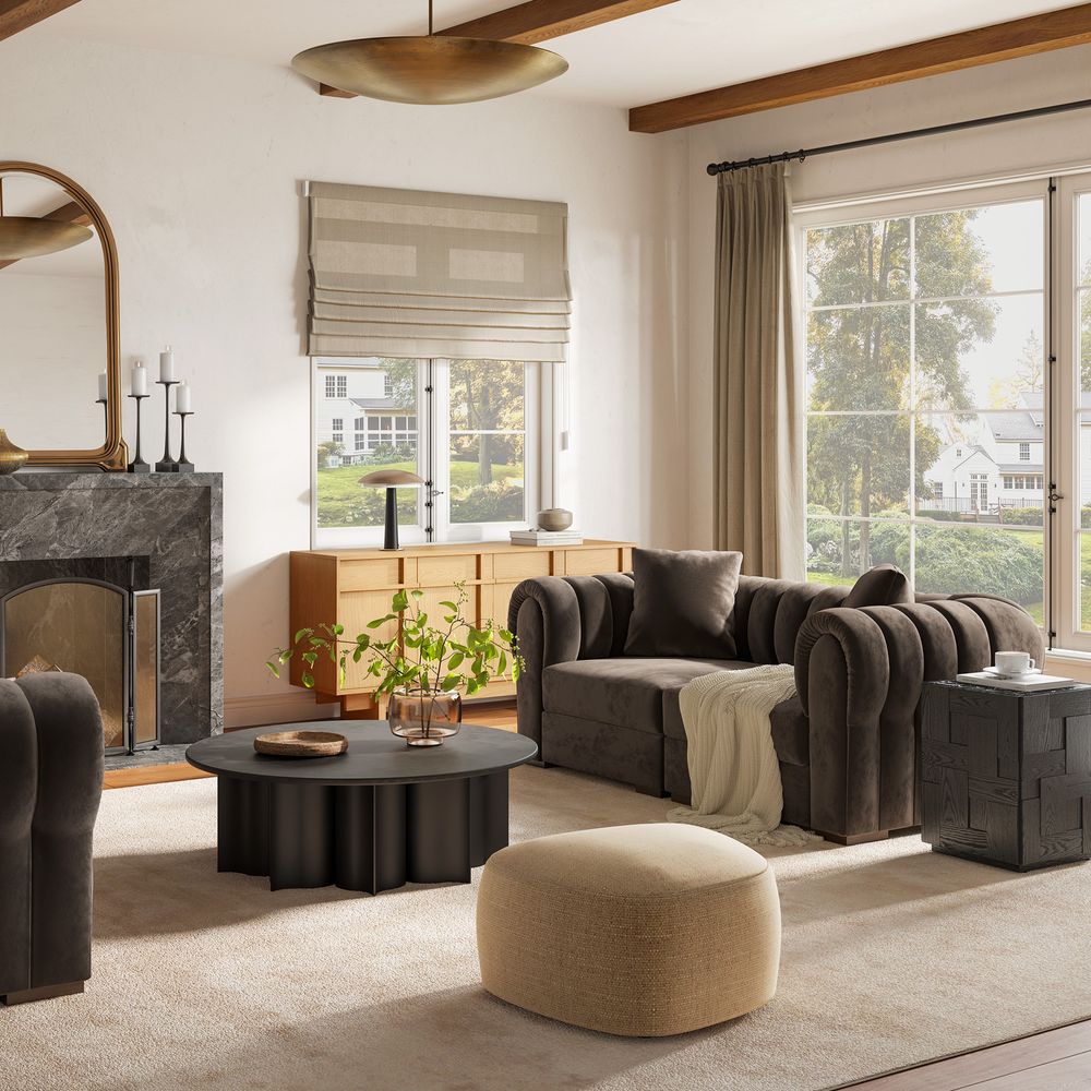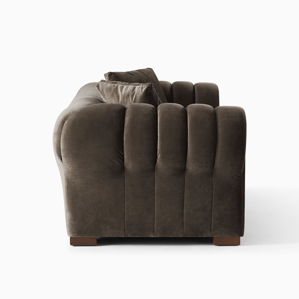 The Kystlin sofa draws inspiration from mid-century modern curves, reimagined with plush, channel-tufted backs that blend retro charm and contemporary comfort. Its rounded arms and tailored silhouette nod to classic lounge aesthetics, while the modular frame balances structured elegance with relaxed, inviting warmth, crafted to feel both timeless and perfectly suited for modern living spaces.