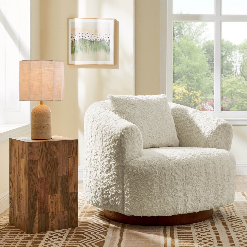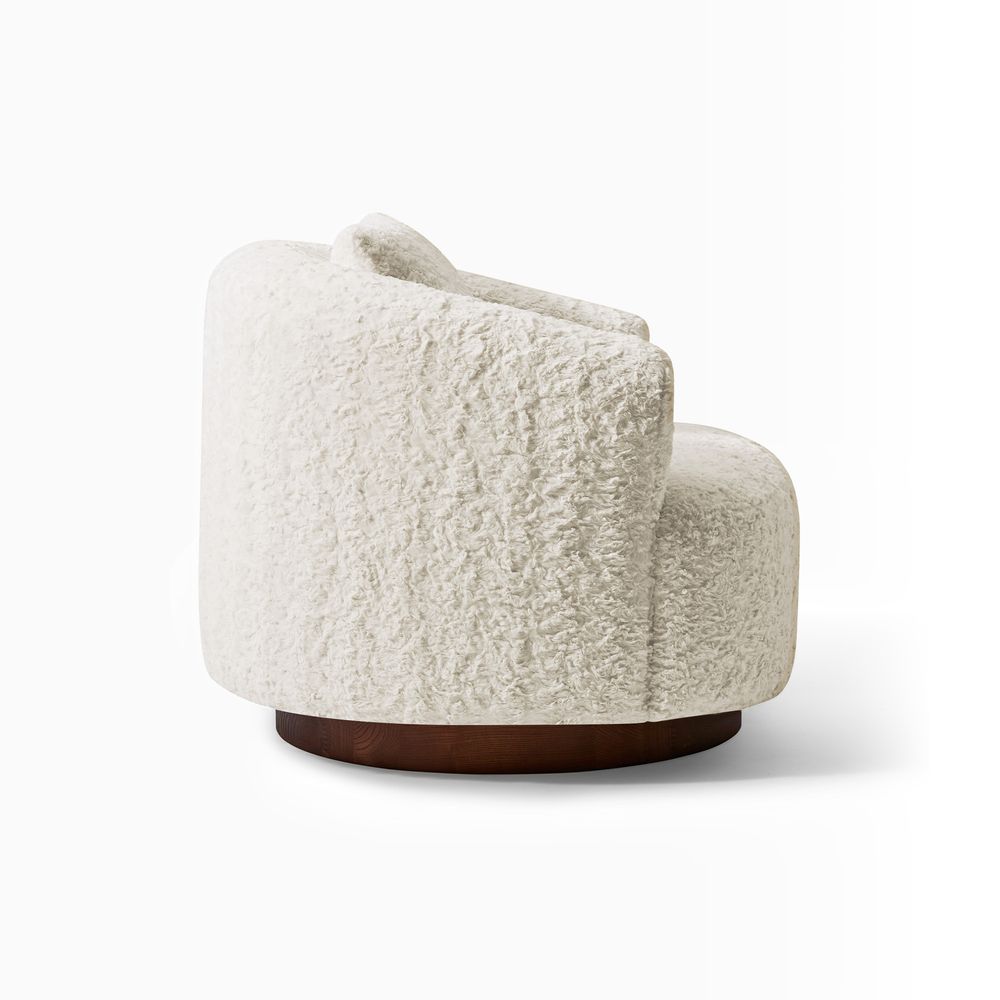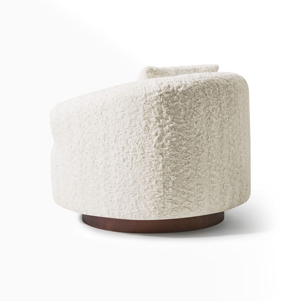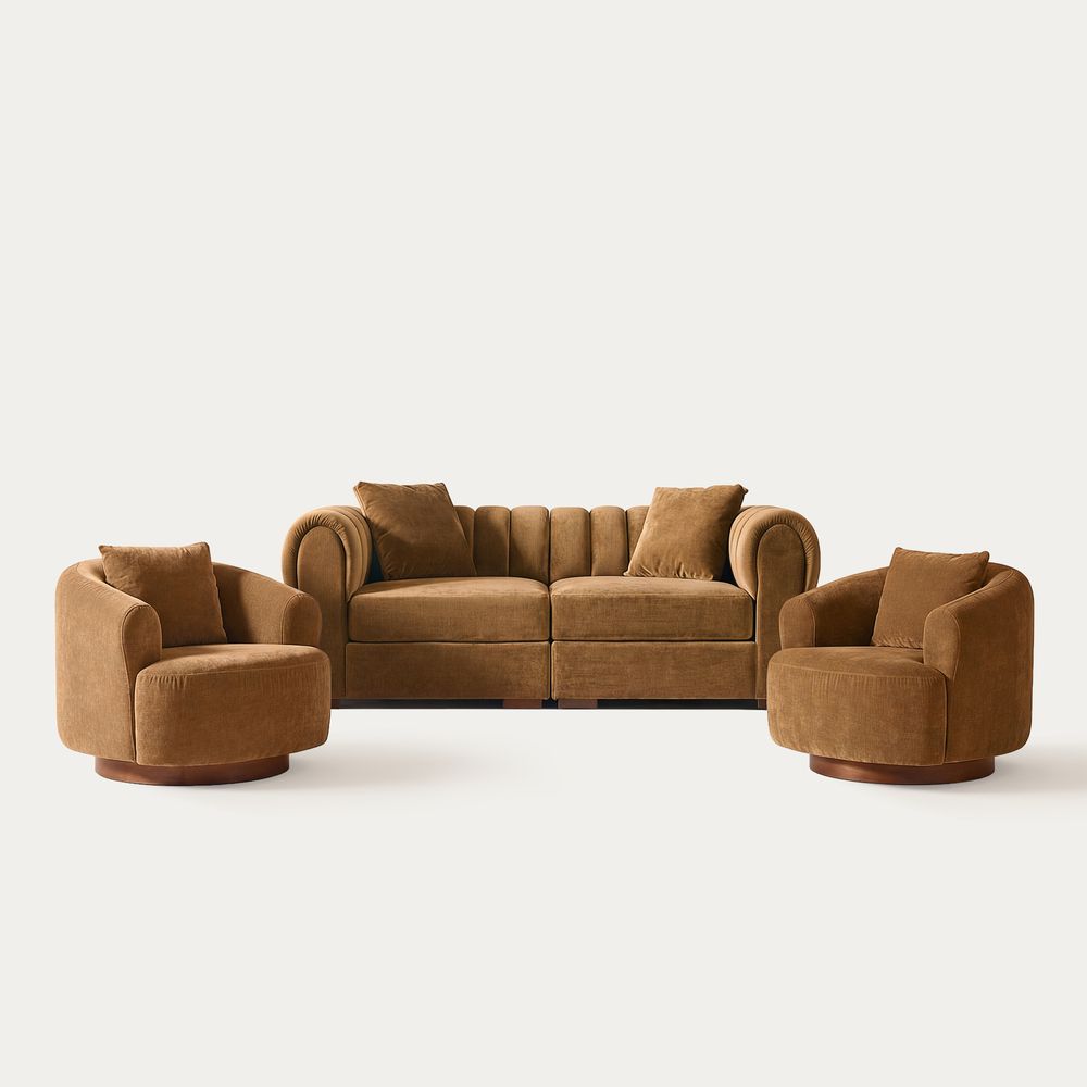 The Kystlin sofa draws inspiration from mid-century modern curves, reimagined with plush, channel-tufted backs that blend retro charm and contemporary comfort. Timberve swivel accent chair's rounded, cozy silhouette is designed to cradle your body, while the wooden swivel base adds a touch of rustic elegance. It's the perfect combination of style and functionality for any contemporary living space.
