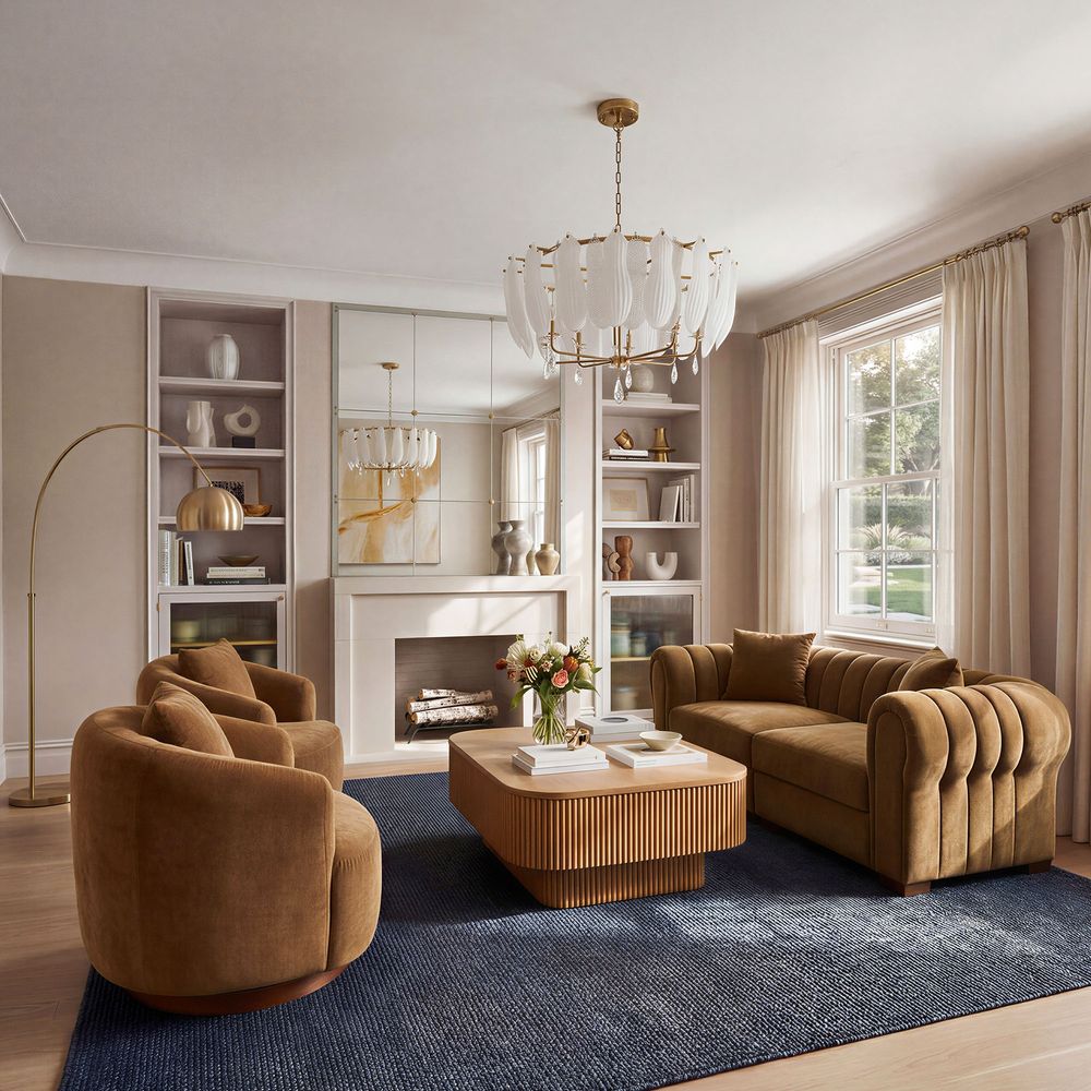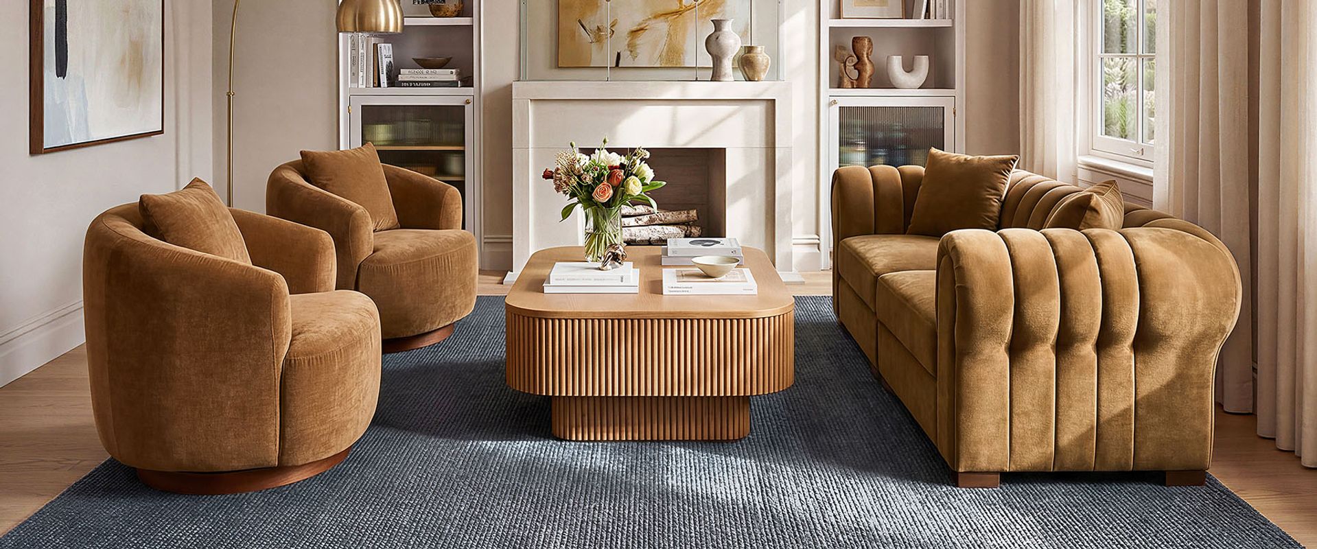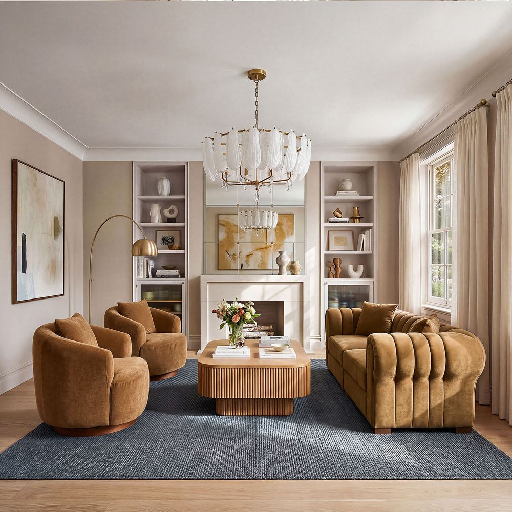 The Kystlin sofa draws inspiration from mid-century modern curves, reimagined with plush, channel-tufted backs that blend retro charm and contemporary comfort. Timberve swivel accent chair's rounded, cozy silhouette is designed to cradle your body, while the wooden swivel base adds a touch of rustic elegance. It's the perfect combination of style and functionality for any contemporary living space.