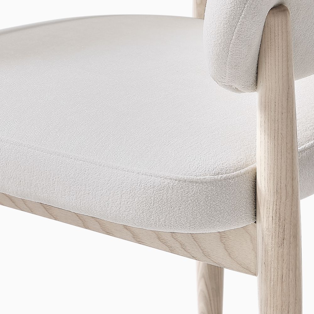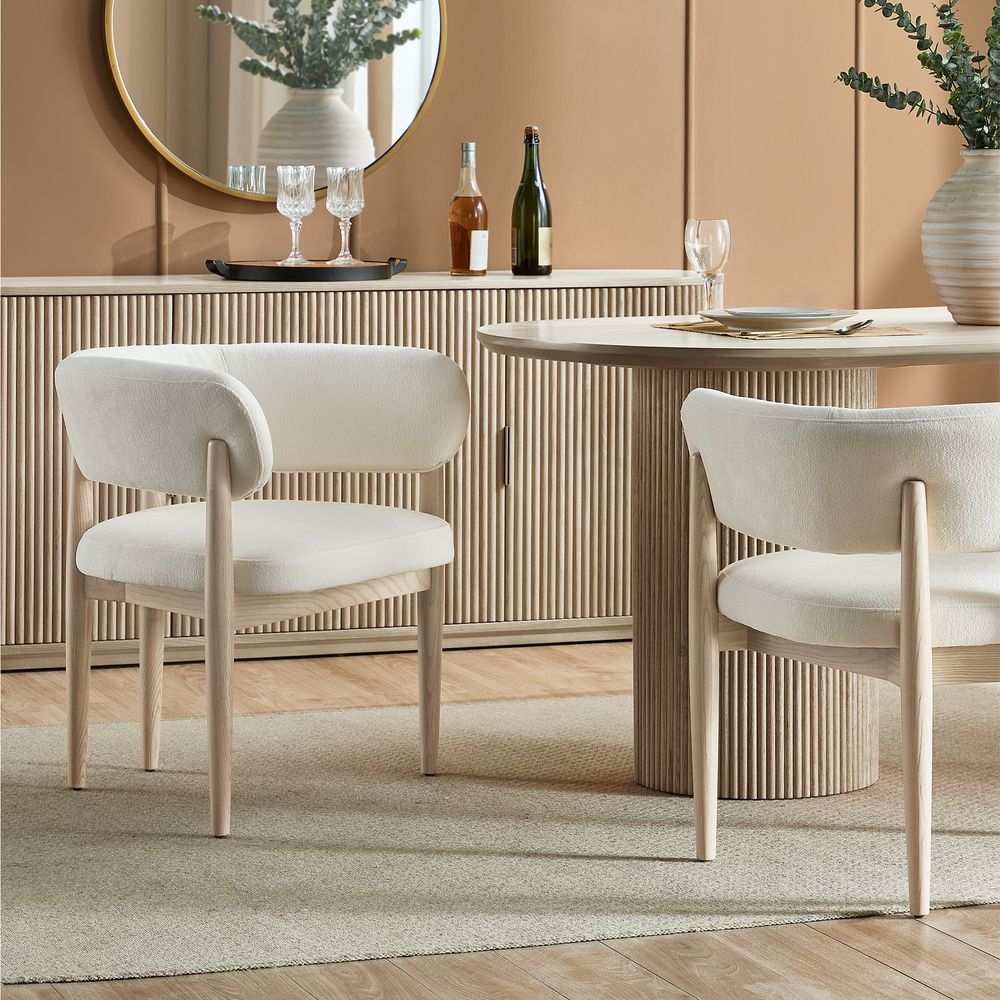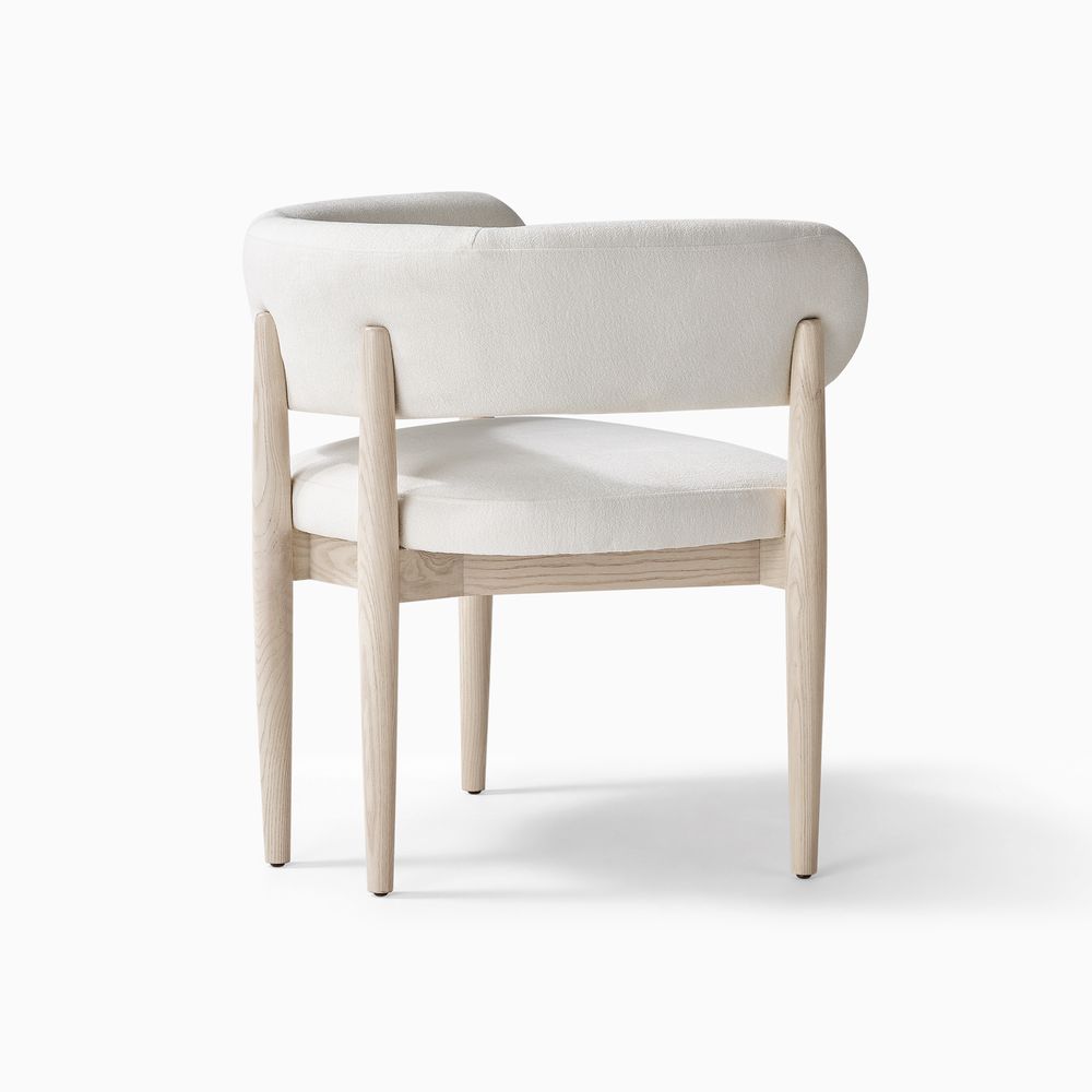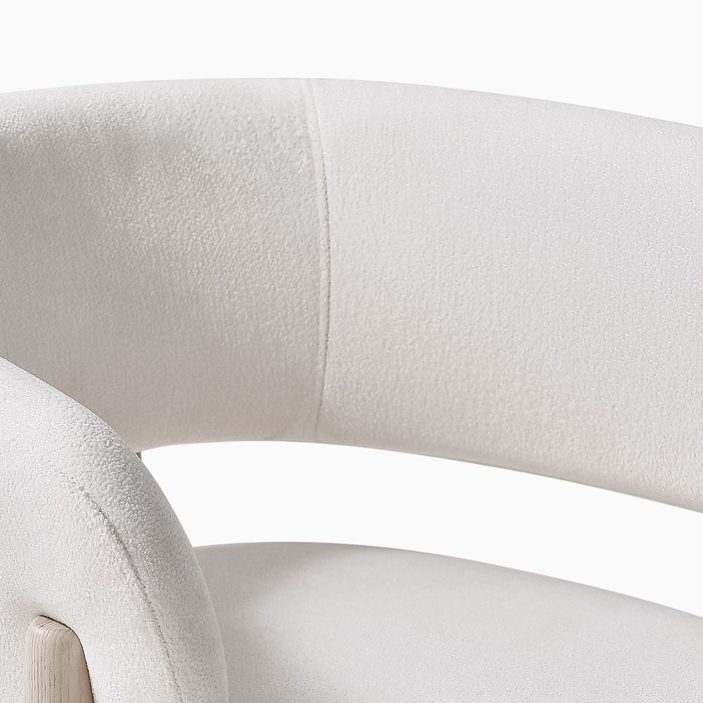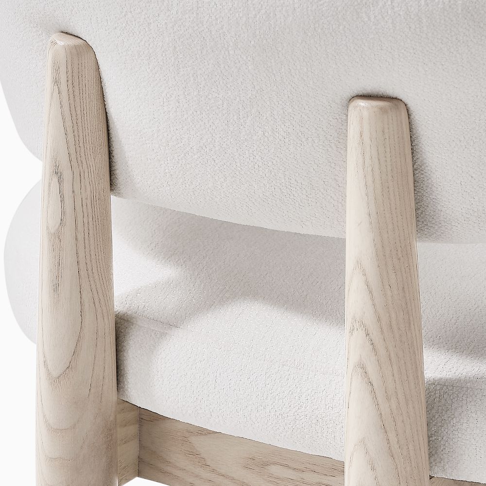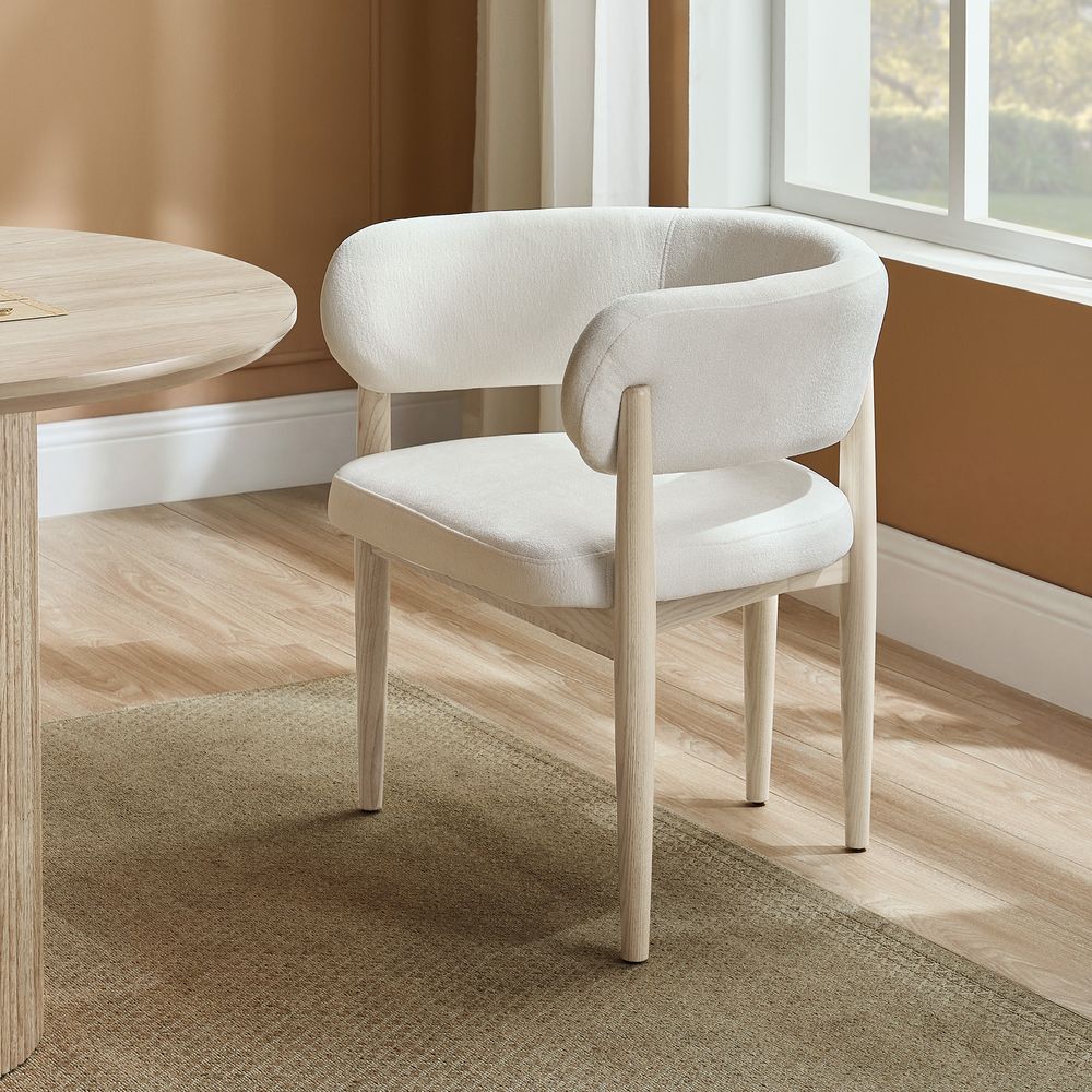 Inspired by European design, this chair features an embracing, curved back and soft white bouclé fabric for a luxurious, embracing feel. The solid wood frame and tapered legs blend vintage charm with modern comfort. Instantly elevate any space.