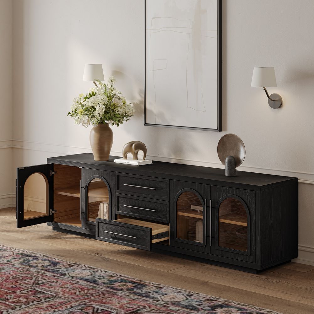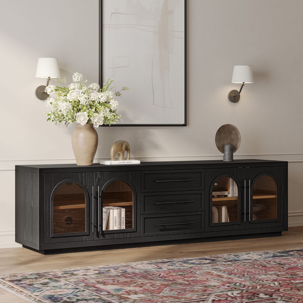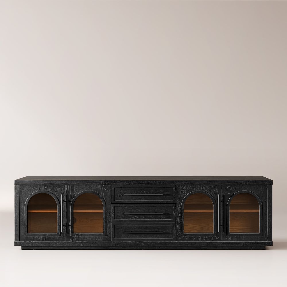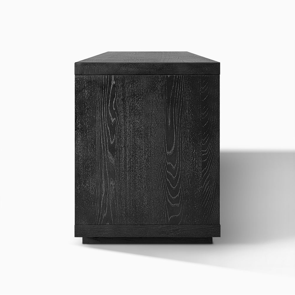 Crafted of solid wood and plywood with elm veneers.All wood is kiln-dried for added durability.Drawers are crafted with precision dovetail joints for superior sturdiness and weight-bearing strength.Solid wood blocks are used at structural joints for reinforcement.Designed for TVs up to 80", 4 cord cutouts in back panel for cable management.Color perception may vary due to wood characteristics, lighting, and devices. Wood grain variation is expected, as each is unique.
