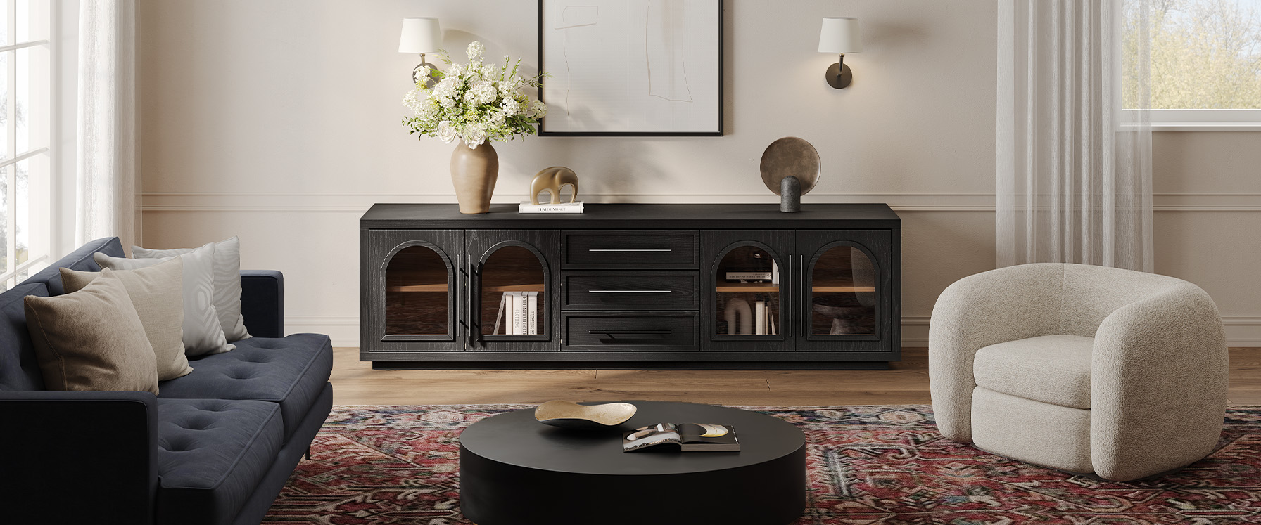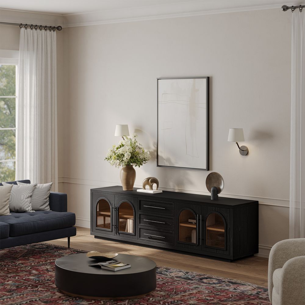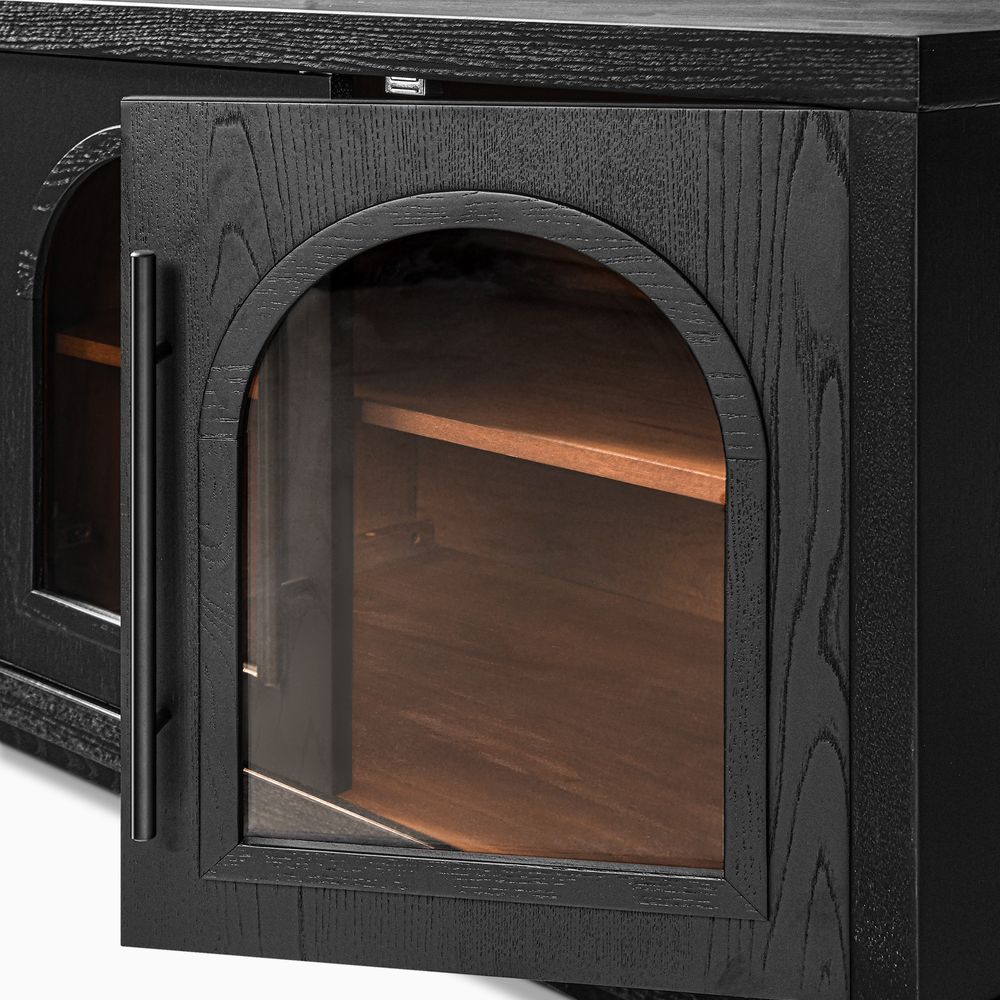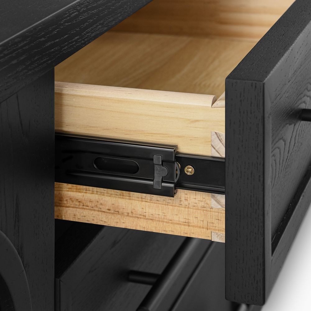 Crafted of solid wood and plywood with elm veneers.All wood is kiln-dried for added durability.Drawers are crafted with precision dovetail joints for superior sturdiness and weight-bearing strength.Solid wood blocks are used at structural joints for reinforcement.Designed for TVs up to 80", 4 cord cutouts in back panel for cable management.Color perception may vary due to wood characteristics, lighting, and devices. Wood grain variation is expected, as each is unique.