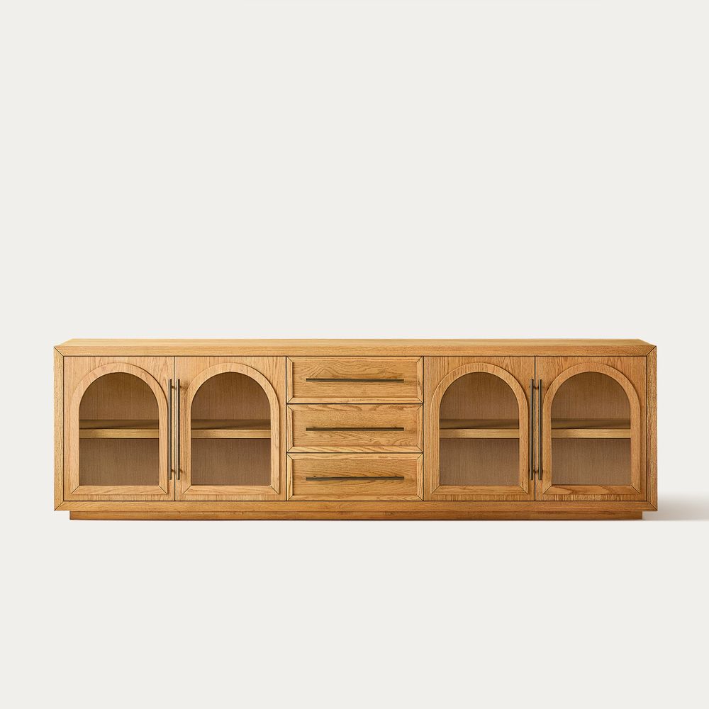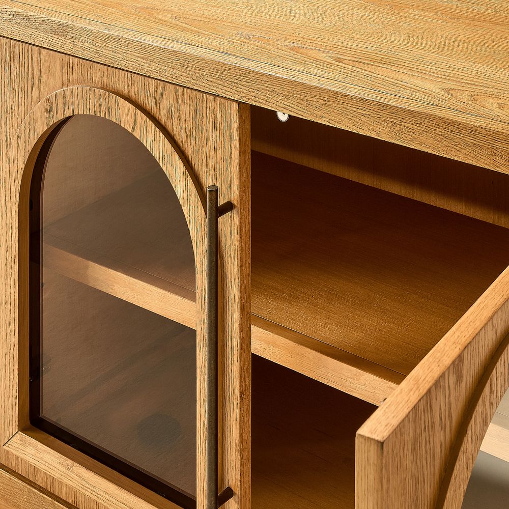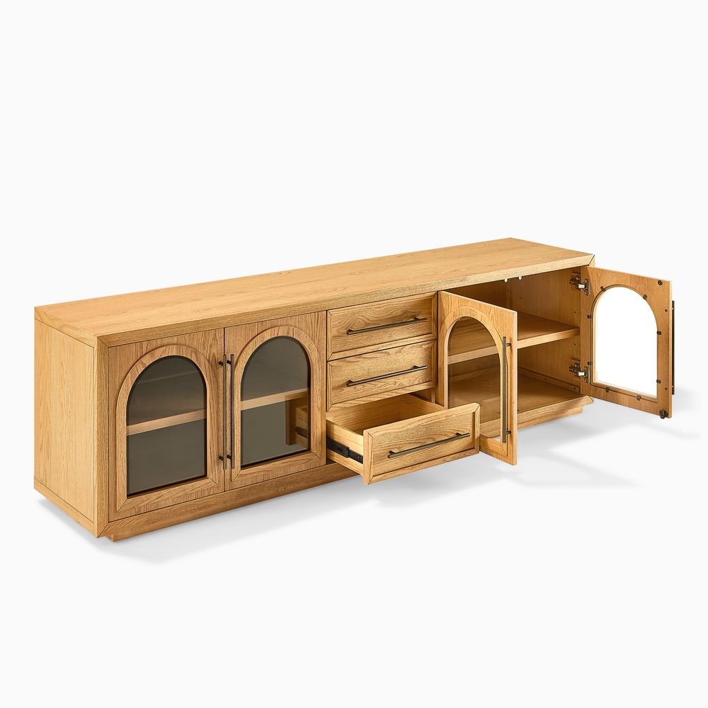 Crafted of American solid oak and engineered wood with oak veneers.All wood is kiln-dried for added durability.Finish is achieved through multistep process in which wood is wire brushed to highlight its rich grain.Wood glazing adds visual interest with greater depth and layering and enhances coloring.Drawers are crafted with precision dovetail joints for superior sturdiness and weight-bearing strength.Solid wood blocks are used at structural joints for reinforcement.Designed for TVs up to 85", 4 cord cutouts in back panel for cable management.Color perception may vary due to wood characteristics, lighting, and devices. Wood grain variation is expected, as each is unique.