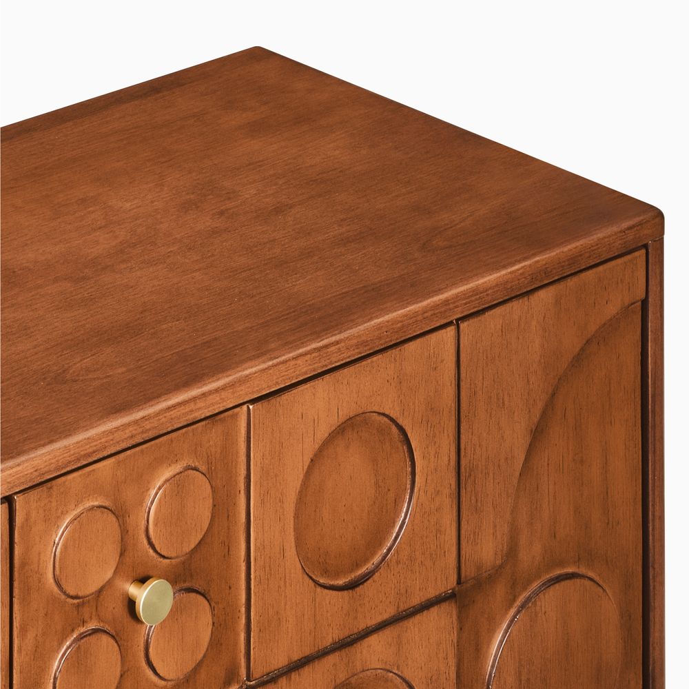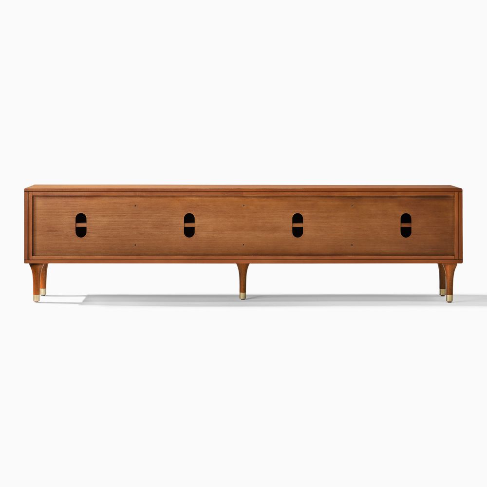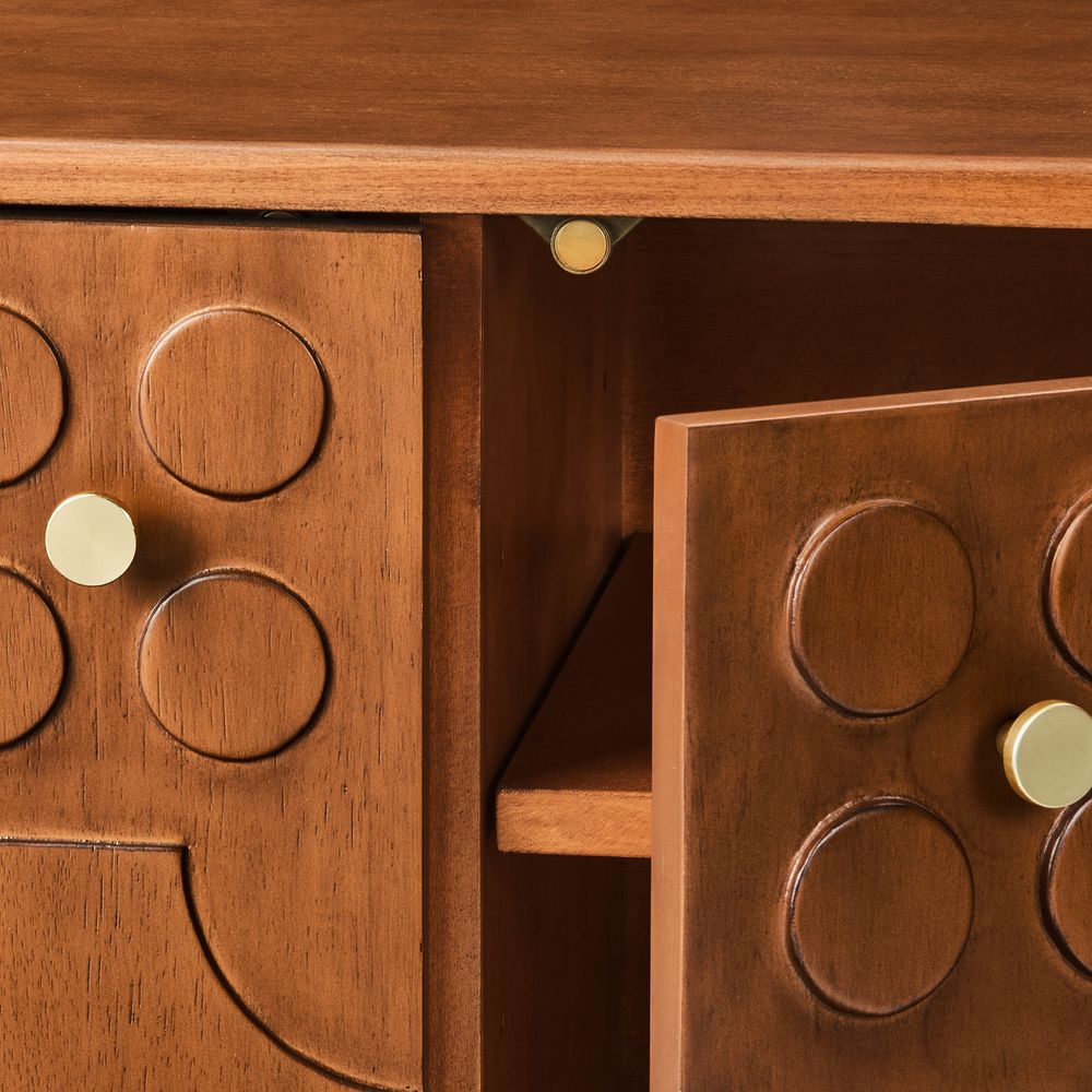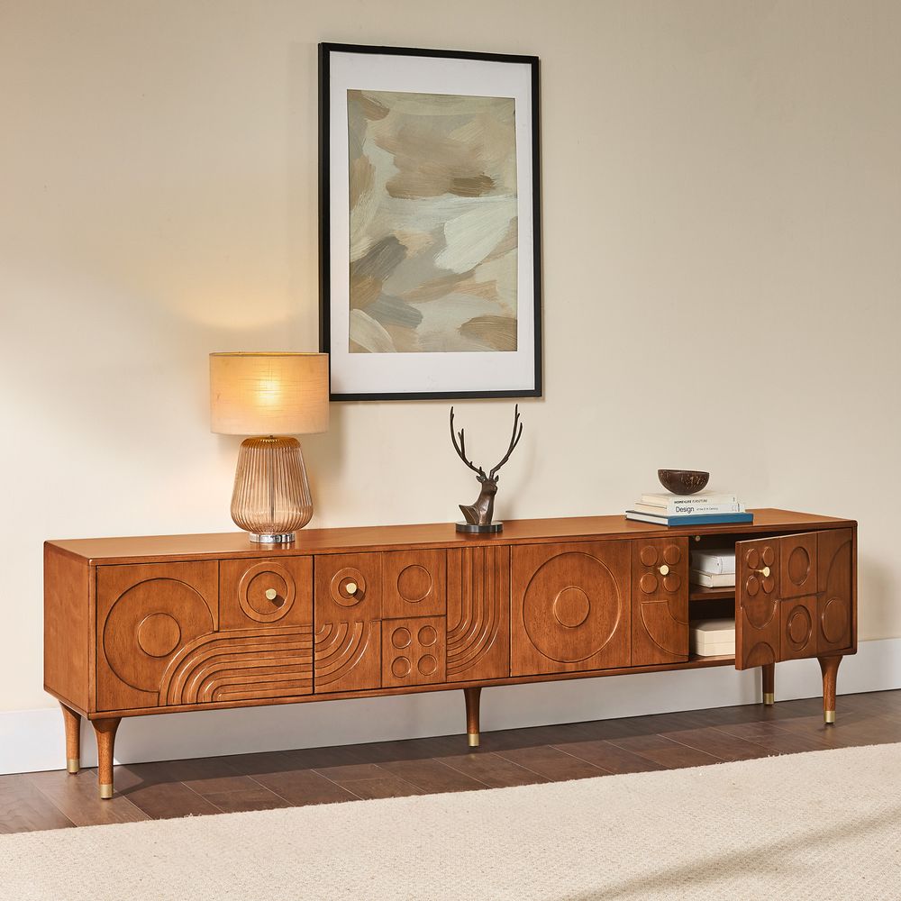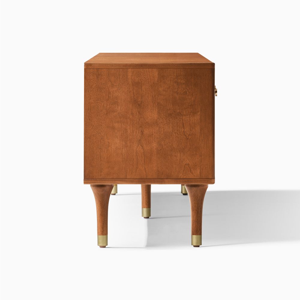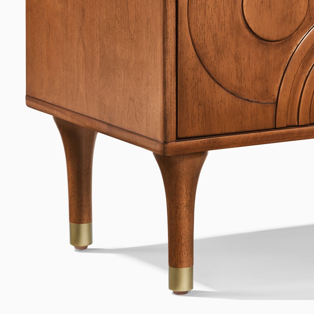 Ludovic media console blends modern form with retro charm. A warm wood finish and sculpted 3D facade create striking texture and depth, while thoughtfully placed cabinets offer discreet storage. Elevated on gold-tipped tapered legs, it brings timeless sophistication to refined living spaces.