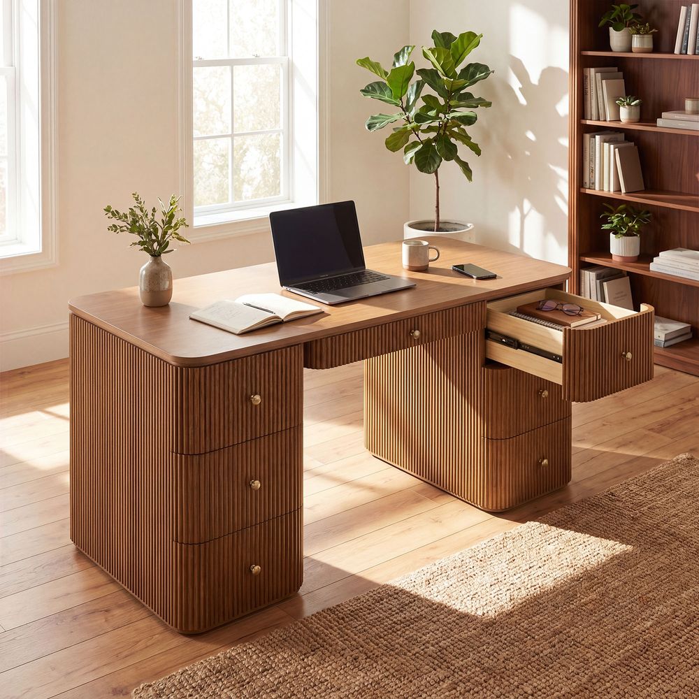 The Lundbord desk draws inspiration from mid-century modern geometry and art deco detailing. It fuses warm wood textures with fluting detailing and refined handles. Its symmetrical, sculptural form and ample storage offer both vintage-inspired elegance and functional sophistication, making it a standout in any contemporary workspace.