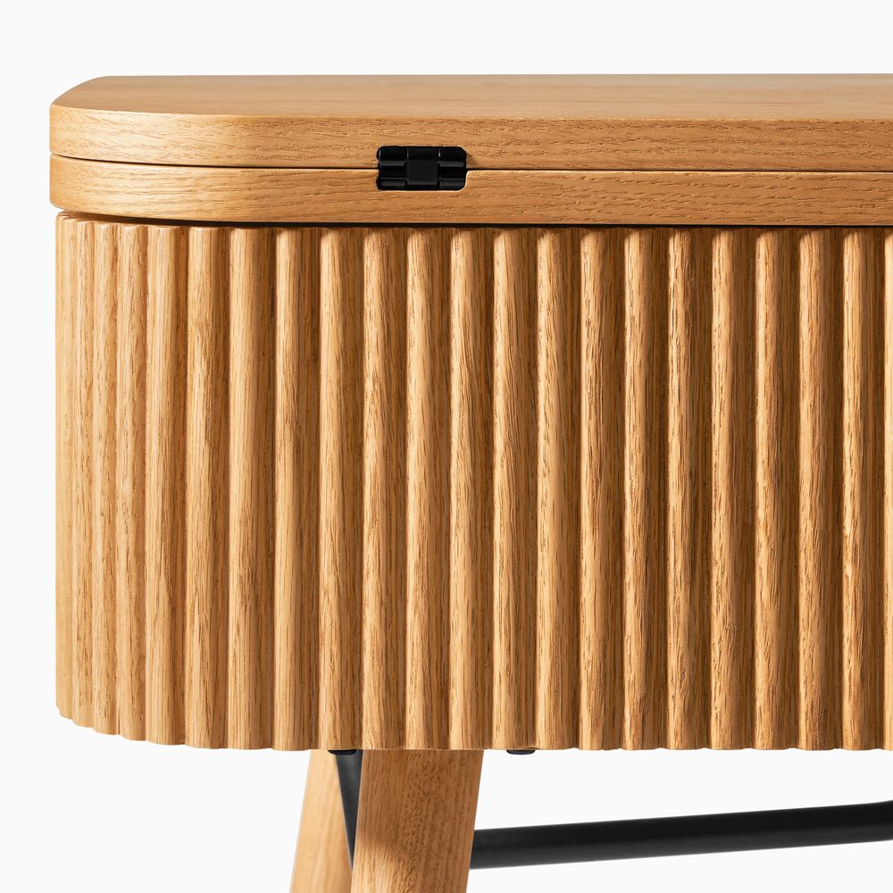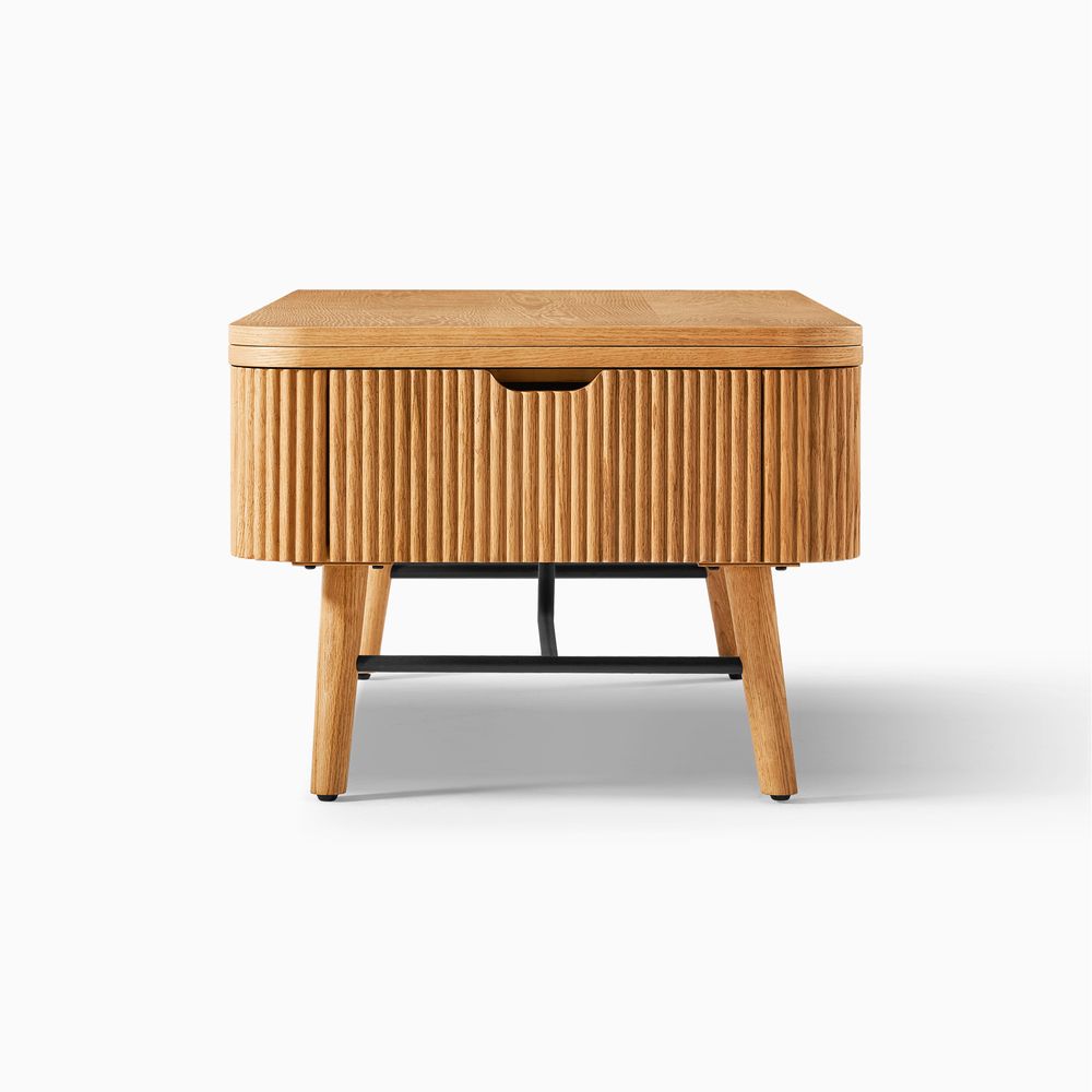 Crafted of American solid oak and plywood with oak veneers.All wood is kiln-dried for added durability.Finish is achieved through multistep process in which wood is wire brushed to highlight its rich grain.Wood glazing adds visual interest with greater depth and layering and enhances coloring.Drawers are crafted with precision dovetail joints for superior sturdiness and weight-bearing strength.Solid wood blocks are used at structural joints for reinforcement.Solid oak fluting presents a natural texture.Lift-top tabletop offers extra usable space on demand.Color perception may vary due to wood characteristics, lighting, and devices. Wood grain variation is expected, as each is unique.