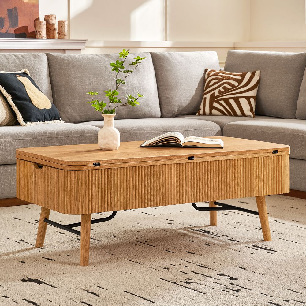 Magnus coffee table embodies the serene rhythm of modern living through its minimalist silhouette. Crafted from ash wood and plywood with ash wood veneer finish, the lift-top extends and adapts seamlessly to diverse needs. A sleek metal frame meets ash wood legs, blending reinforced support, while the fluted base adds tactile depth.