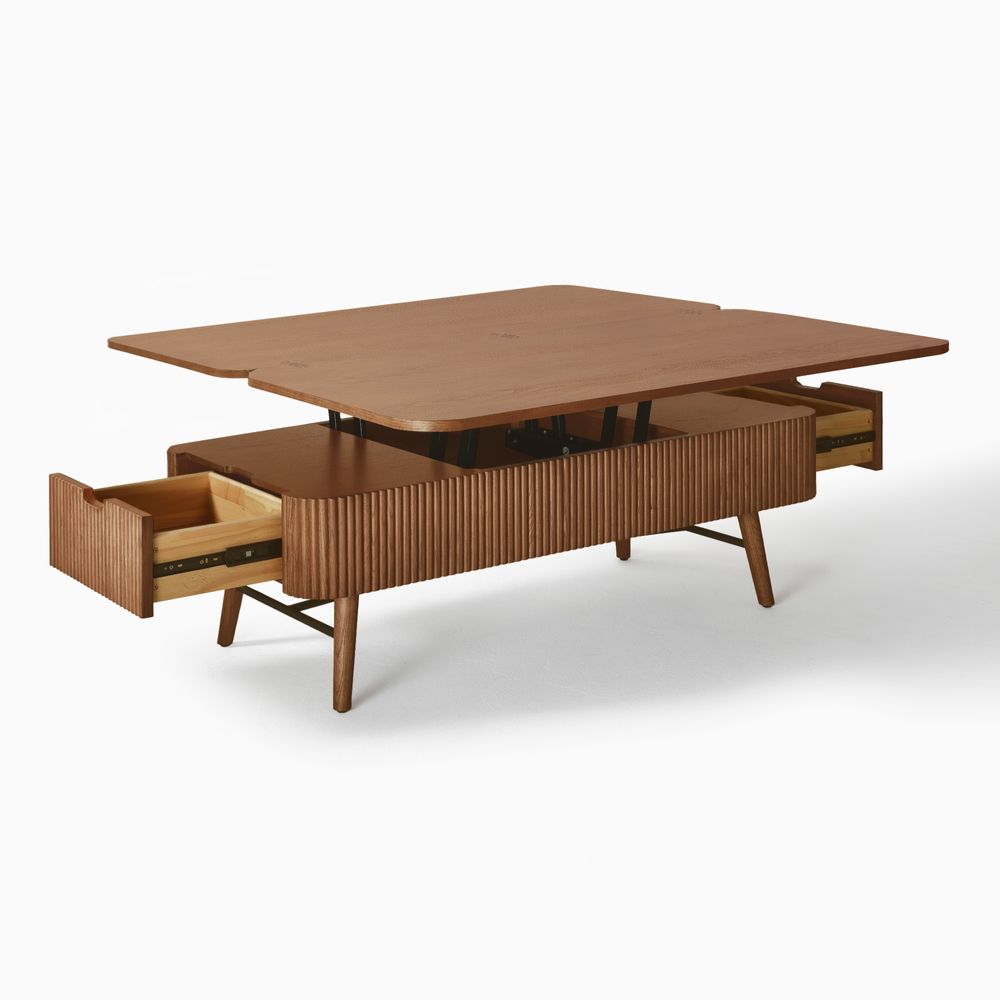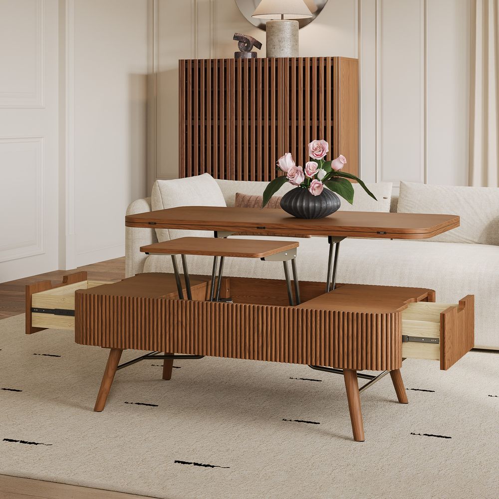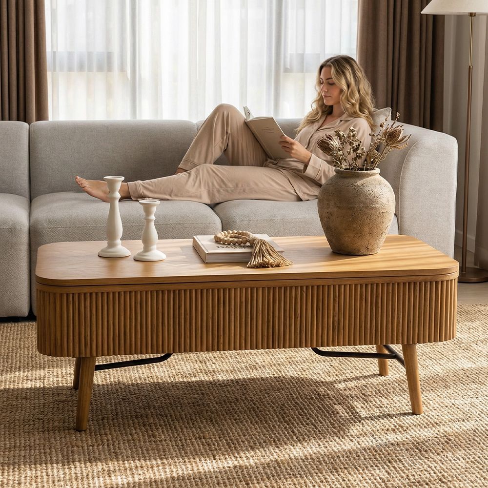 Magnus coffee table embodies the serene rhythm of modern living through its minimalist silhouette. Crafted from ash wood and plywood with ash wood veneer finish, the lift-top extends and adapts seamlessly to diverse needs. A sleek metal frame meets ash wood legs, blending reinforced support, while the fluted base adds tactile depth.