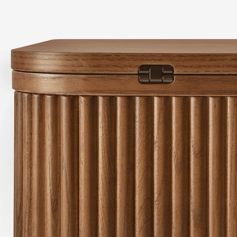 Crafted of American solid oak and plywood with oak veneers.All wood is kiln-dried for added durability.Finish is achieved through multistep process in which wood is wire brushed to highlight its rich grain.Wood glazing adds visual interest with greater depth and layering and enhances coloring.Drawers are crafted with precision dovetail joints for superior sturdiness and weight-bearing strength.Solid wood blocks are used at structural joints for reinforcement.Solid oak fluting presents a natural texture.Lift-top tabletop offers extra usable space on demand.Color perception may vary due to wood characteristics, lighting, and devices. Wood grain variation is expected, as each is unique.