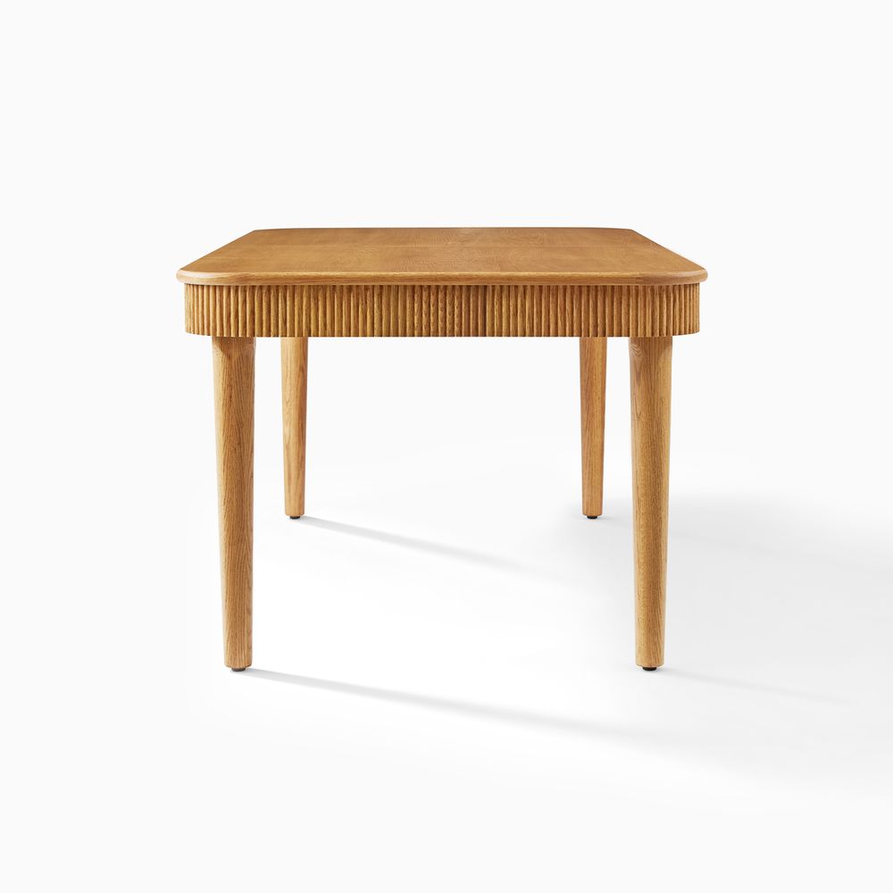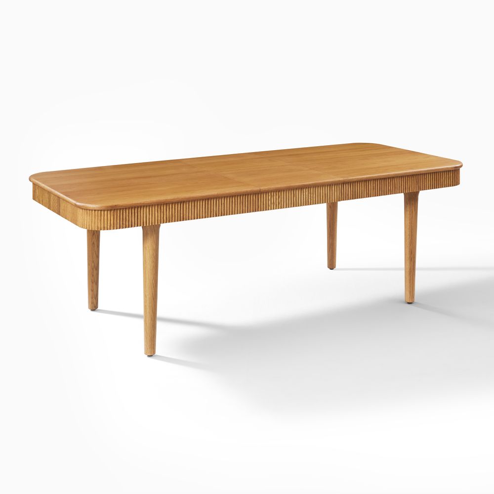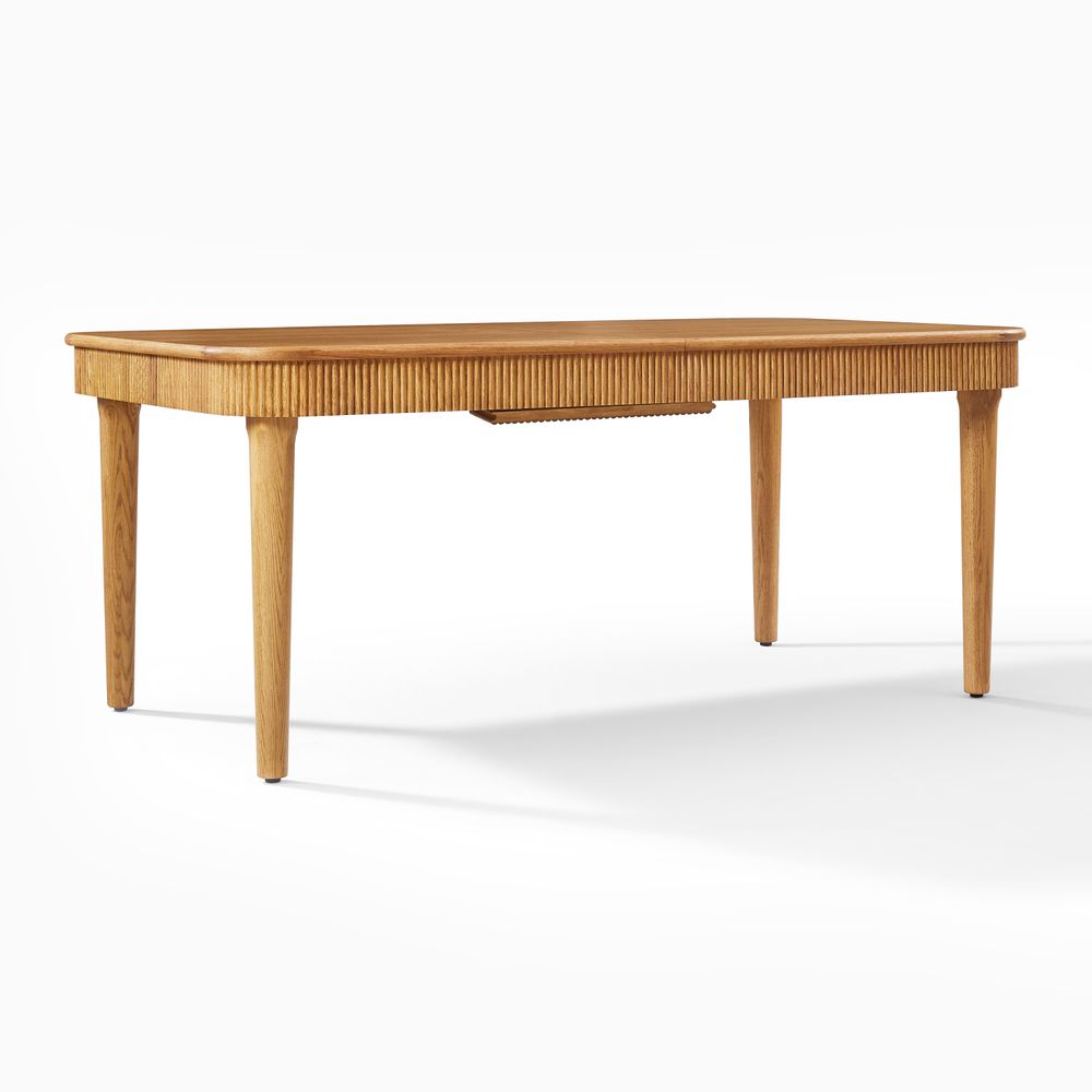Crafted of American solid oak and plywood with oak veneers.All wood is kiln-dried for added durability.Finish is achieved through multistep process in which wood is wire brushed to highlight its rich grain.Wood glazing adds visual interest with greater depth and layering and enhances coloring.Solid oak fluting presents a natural texture.Extendable tabletop offers extra usable space on demand.92" table comfortably seats 6-8.Color perception may vary due to wood characteristics, lighting, and devices. Wood grain variation is expected; each is unique.
